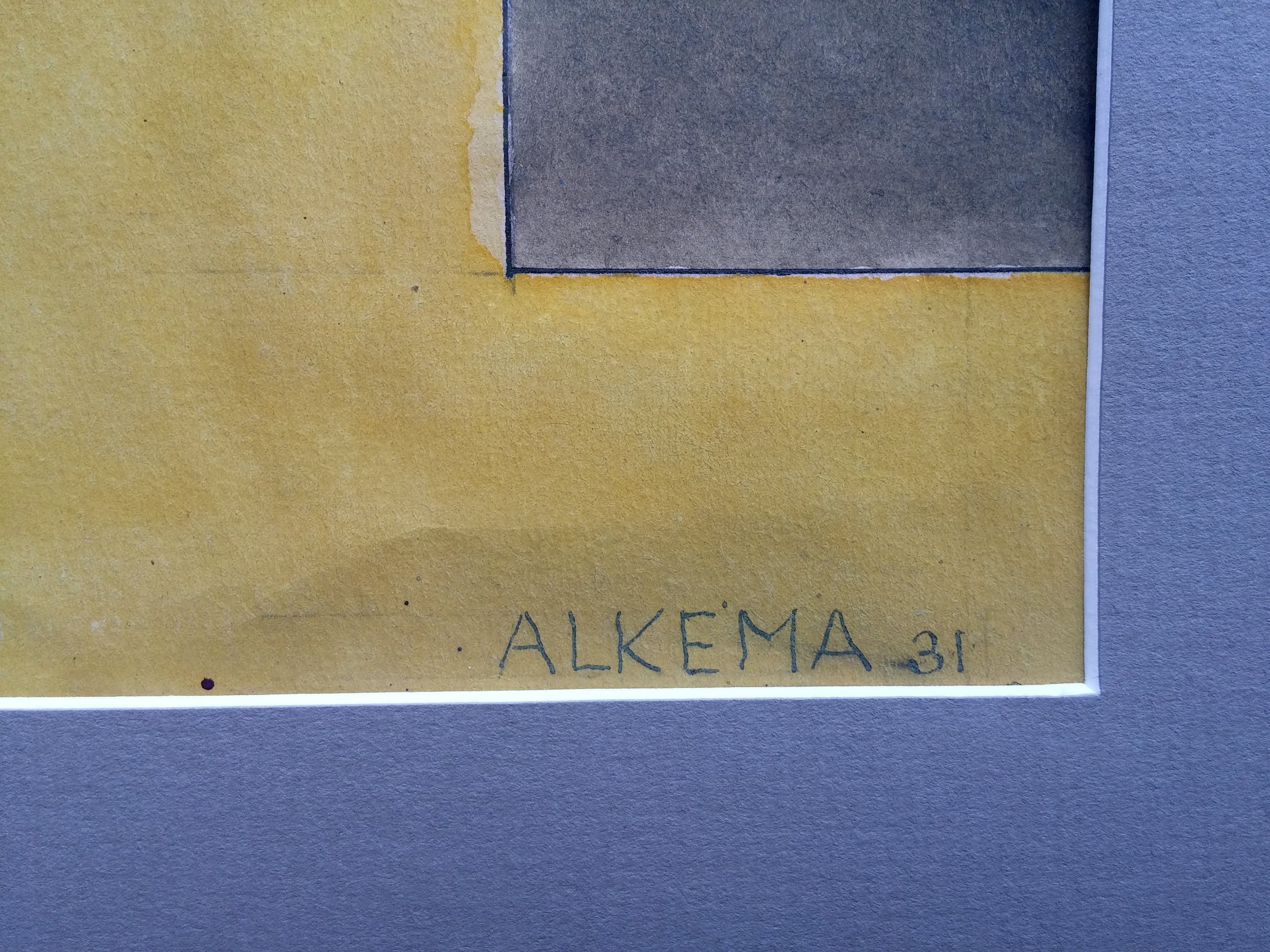 Abstract werk van Groninger Wobbe Alkema. In 1924 werd Alkema lid van De Ploeg. Alkema werd leerlingmeubelmaker en volgde lessen in lijn- en technisch tekenen aan de Avondvaktekenschool. In 1919 schreef hij zich in voor zomerlessen bij de Academie Minerva. Hij kreeg ook tekenlessen van de beeldhouwer Willem Valk. Al spoedig zag hij ervan af meubelmaker te worden. Hij voorzag aanvankelijk in zijn inkomen als tekenaar bij respectievelijk een glasfirma en een steenhouwer.