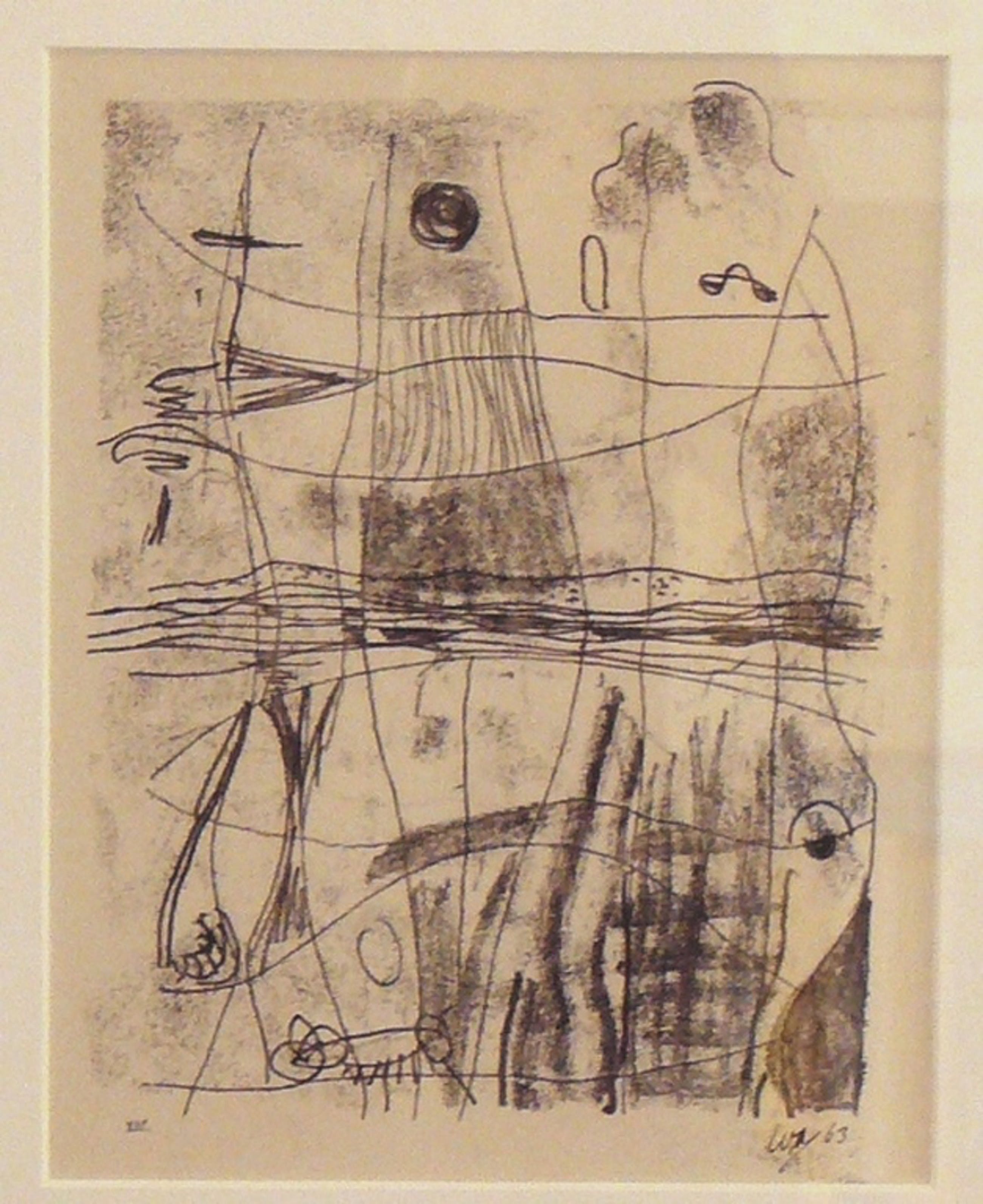 grafisch werk van Wobbe Alkema, gesigneerd WA63, alsmede links onder XIII. dit laatste zou kunnen duiden op een monotype, daar van litho's e.d. meerdere exemplaren gedrukt zijn. de foto is enigszins donker uitgevallen, het werk is lichter van kleur.