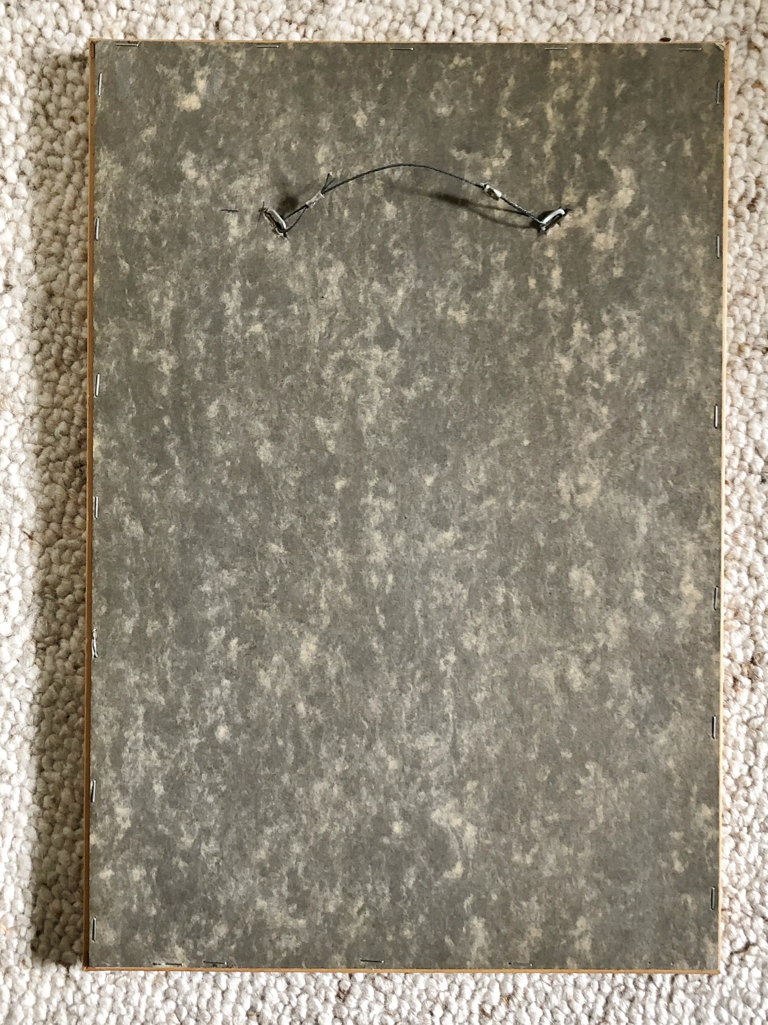 Eenvoudig maar smaakvol gelijst in smalle bruin houten lijst, totale afmeting 41x28,5x1 cm.