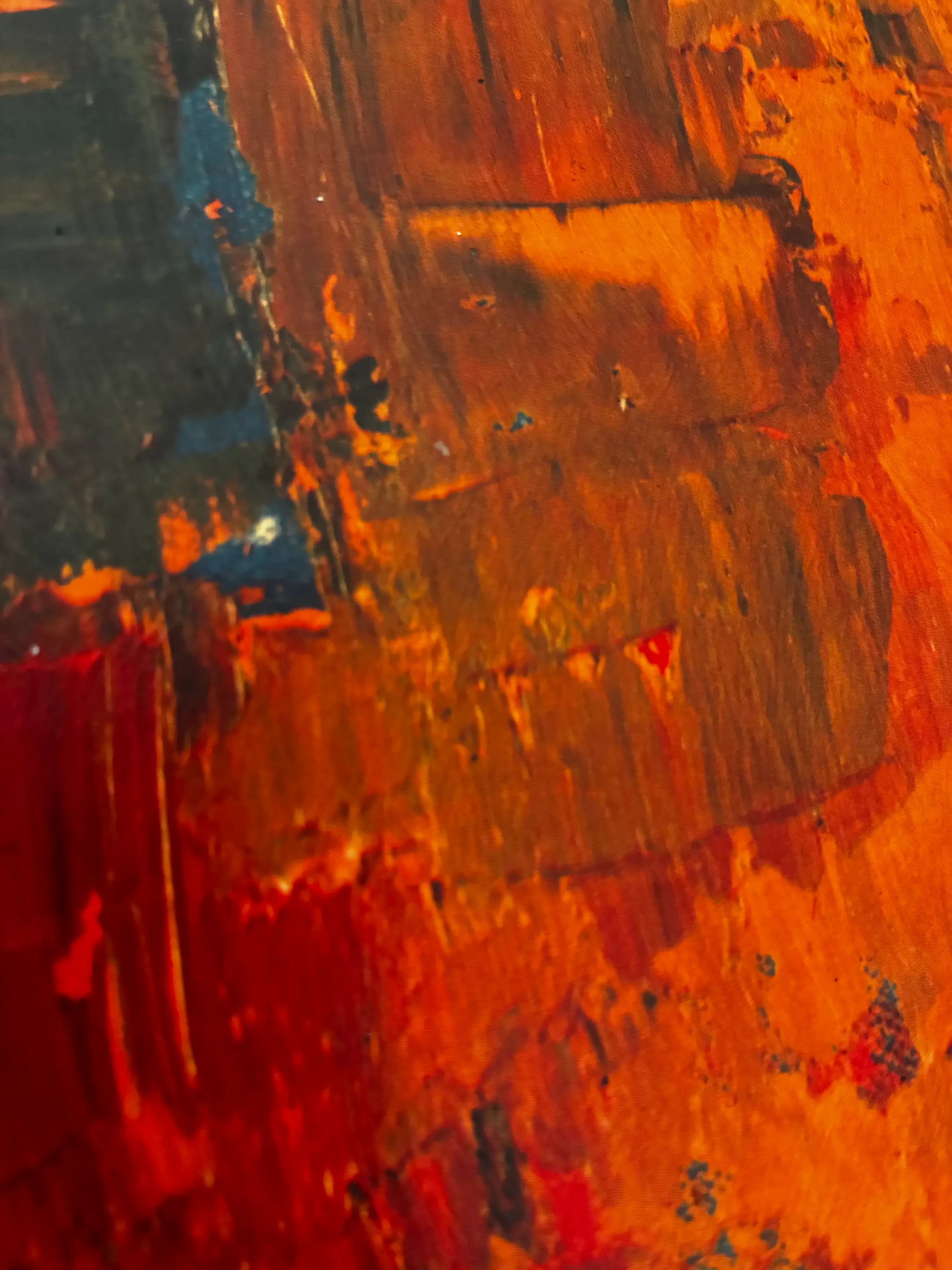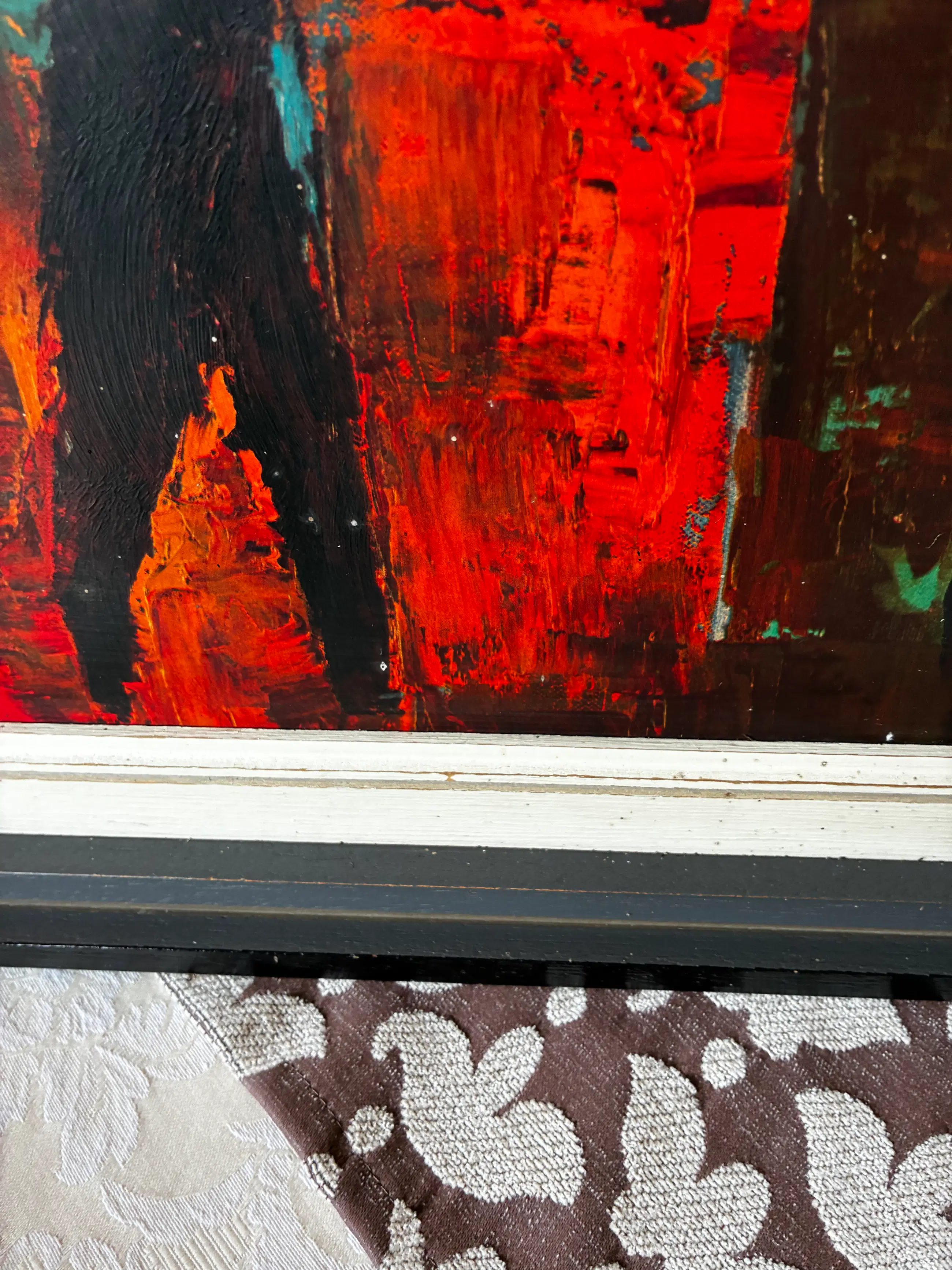 Voorstelling van een vrouwelijk figuur bij een piano in een expressieve compositie met sterke rode, oranje en groene kleuren. De print heeft een reliëfvernis waardoor penseelstructuur zichtbaar is, wat het werk een schilderachtig effect geeft.