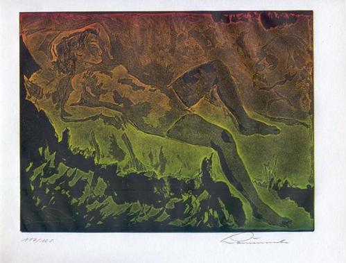 Liegende - Zinkätzung in den Farben schwarz,gelb,rot und blau - 1974 - Blatt 22 x 29 cm, Bild 19 x 24 cm - nummeriert 117/125 - signiert- sehr gut erhalten - auf dünnem braunen Karton am oberen Rand aufgezogen - Versand: Deutschland Euro 7,00 – Ausland Vereinbarung