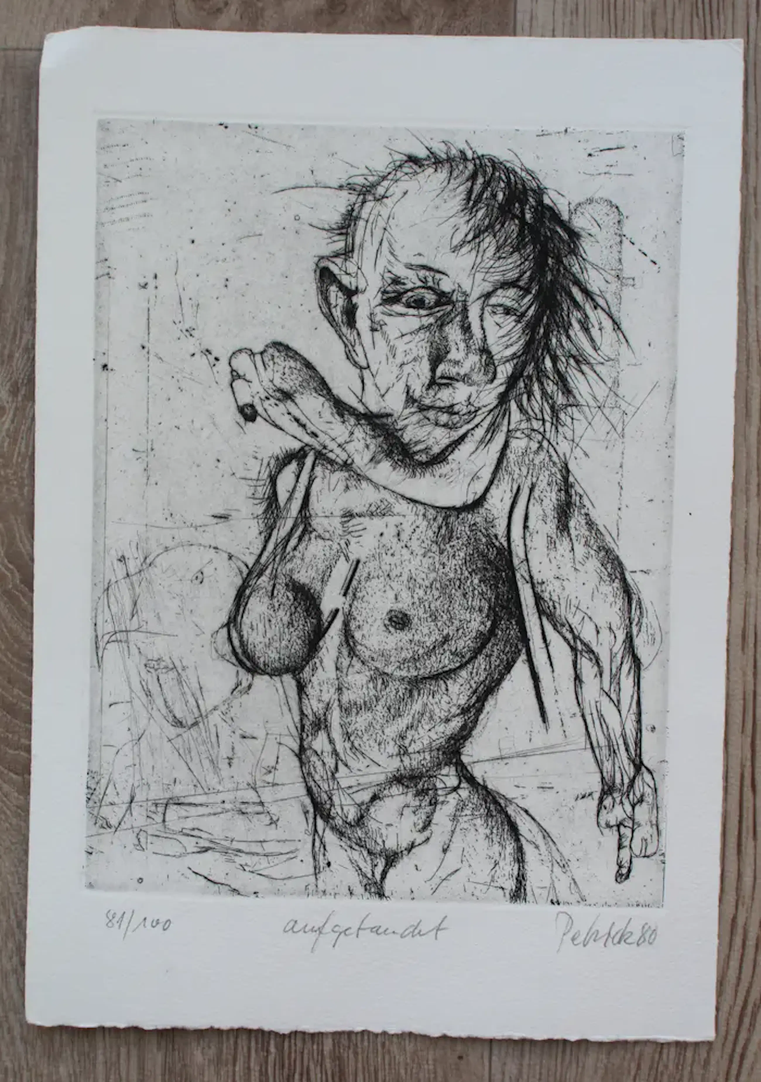 Ets van Petrick Wolfgang uit 1980. Titel: Aufgetaucht. Nummer 81/100. Afmetingen blad H29 X b20.5cm. Afmetingen voorstelling H22.5 X b17. Het werk is rechtsonder gesigneerd door de kunstenaar. De authenticiteit van het aangeboden werk wordt volledig gegarandeerd. Een certificaat van echtheid kan, op aanvraag, worden gemaild.