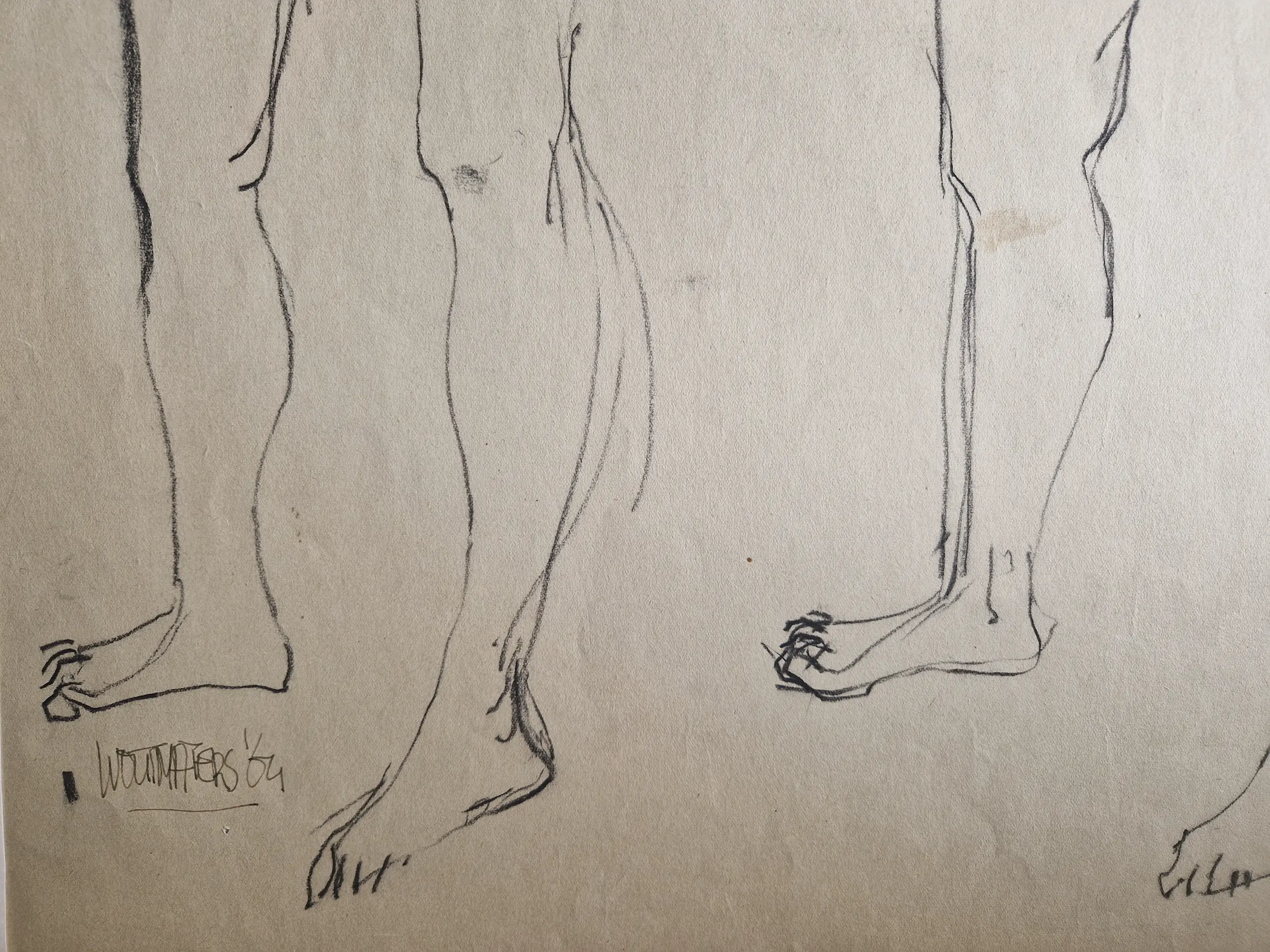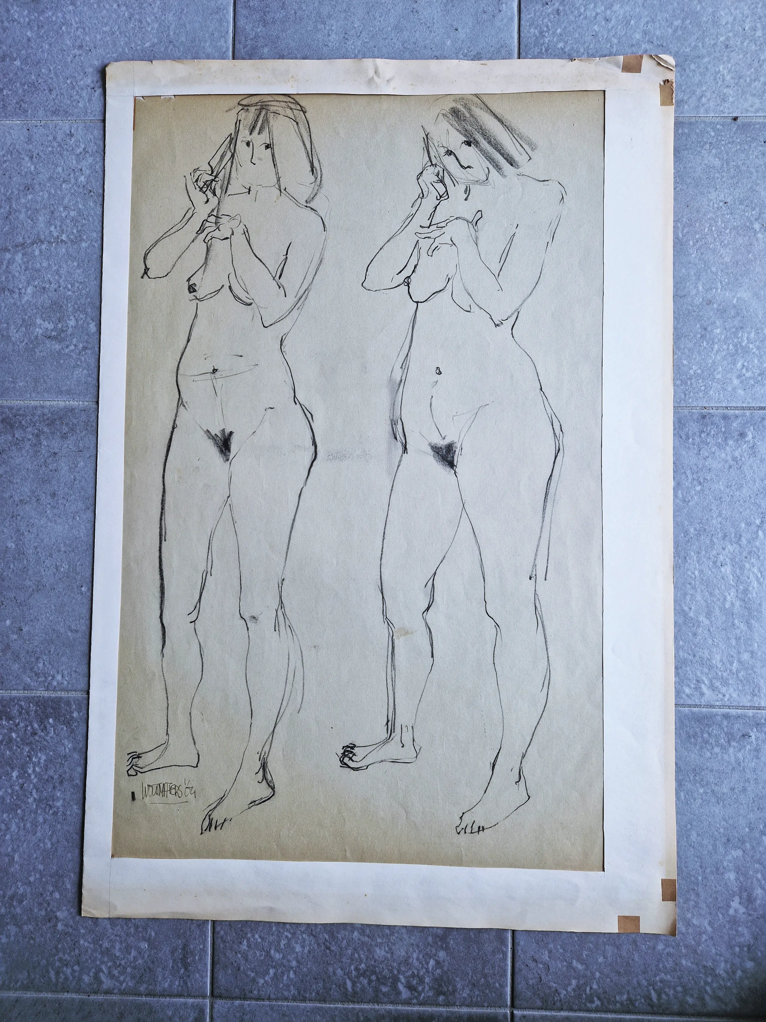 Bijzondere in 1964 gemakte houtskool-tekening (wout Maters was voornamelijk beeldhouwer). Groot formaat tekening met voorstelling van een staand vrouwelijk naakt in 2 verschillende poses. Linksonder gesigneerd en gedateerd. Tekening verkeert in goede conditie. Vertoont wel wat vlekjes en verdiend een nieuwe passe partout.