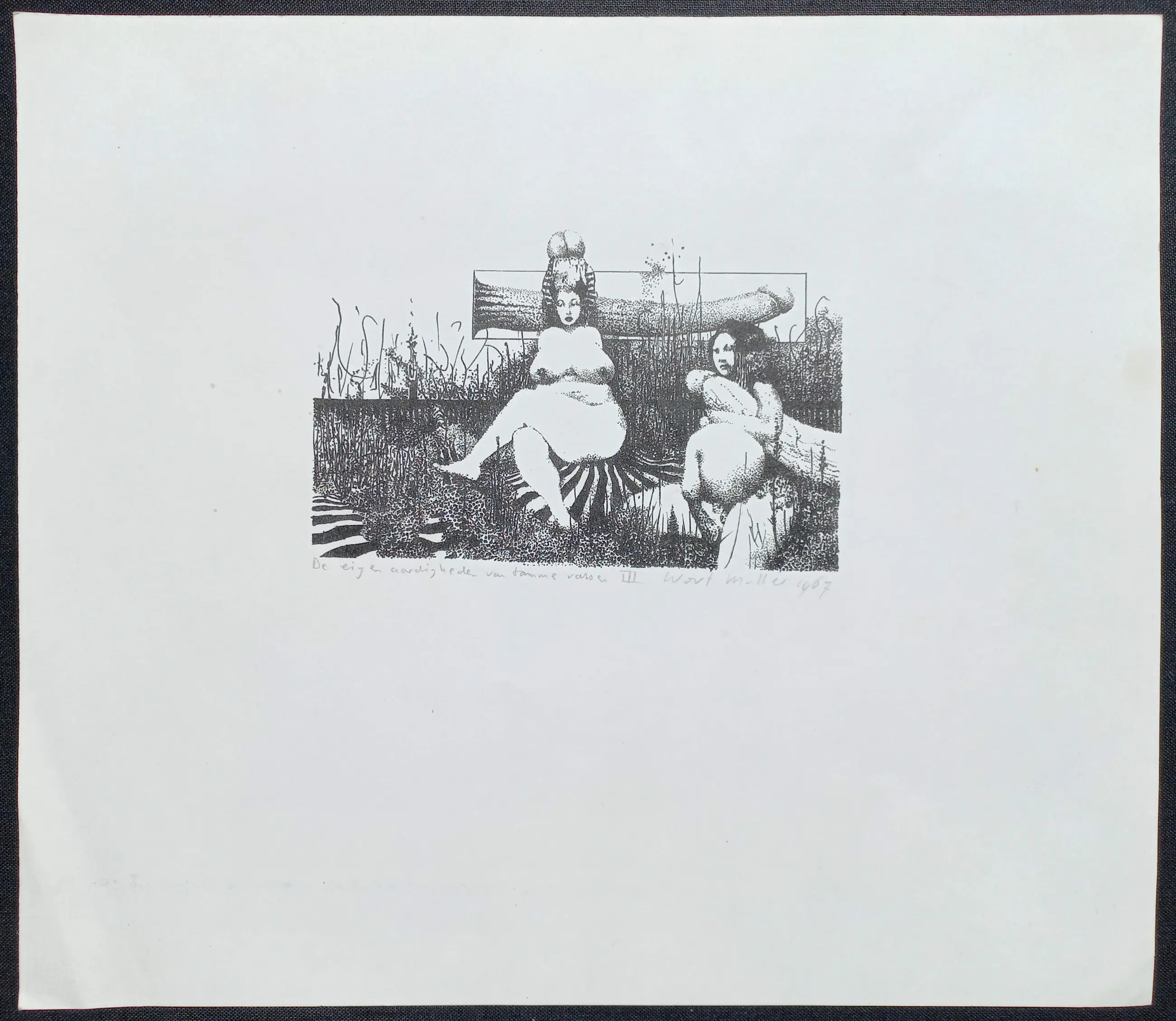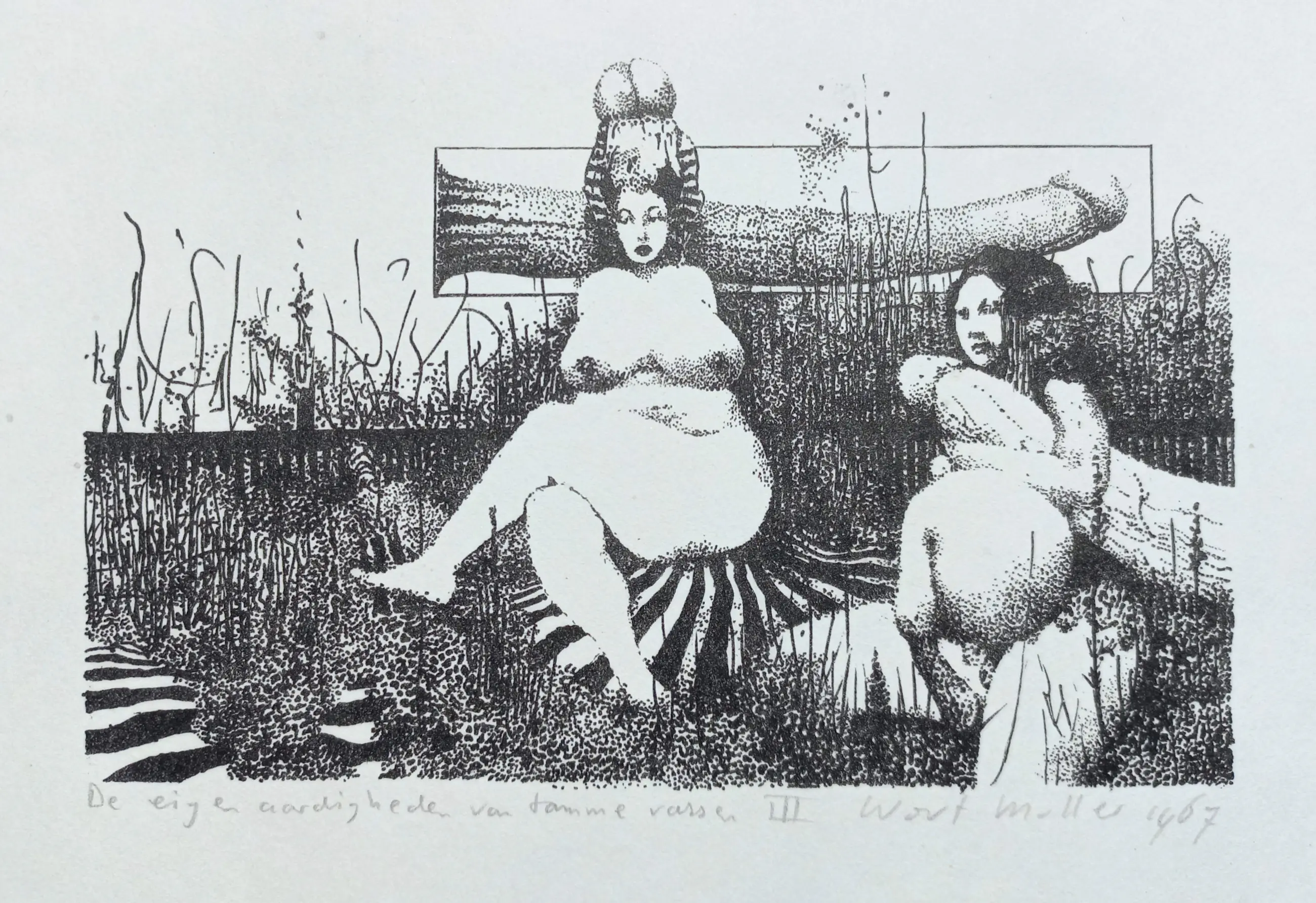 Redelijk vroeg, maar karakteristiek, werk van Wout Muller. Litho op papier, met potlood gesigneerd, gedateerd (1967) en getiteld. In zeer goede conditie.