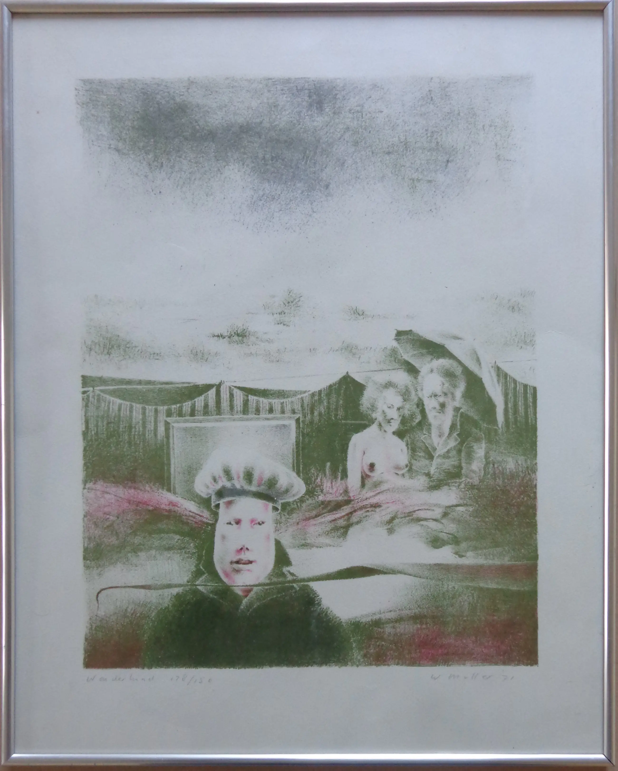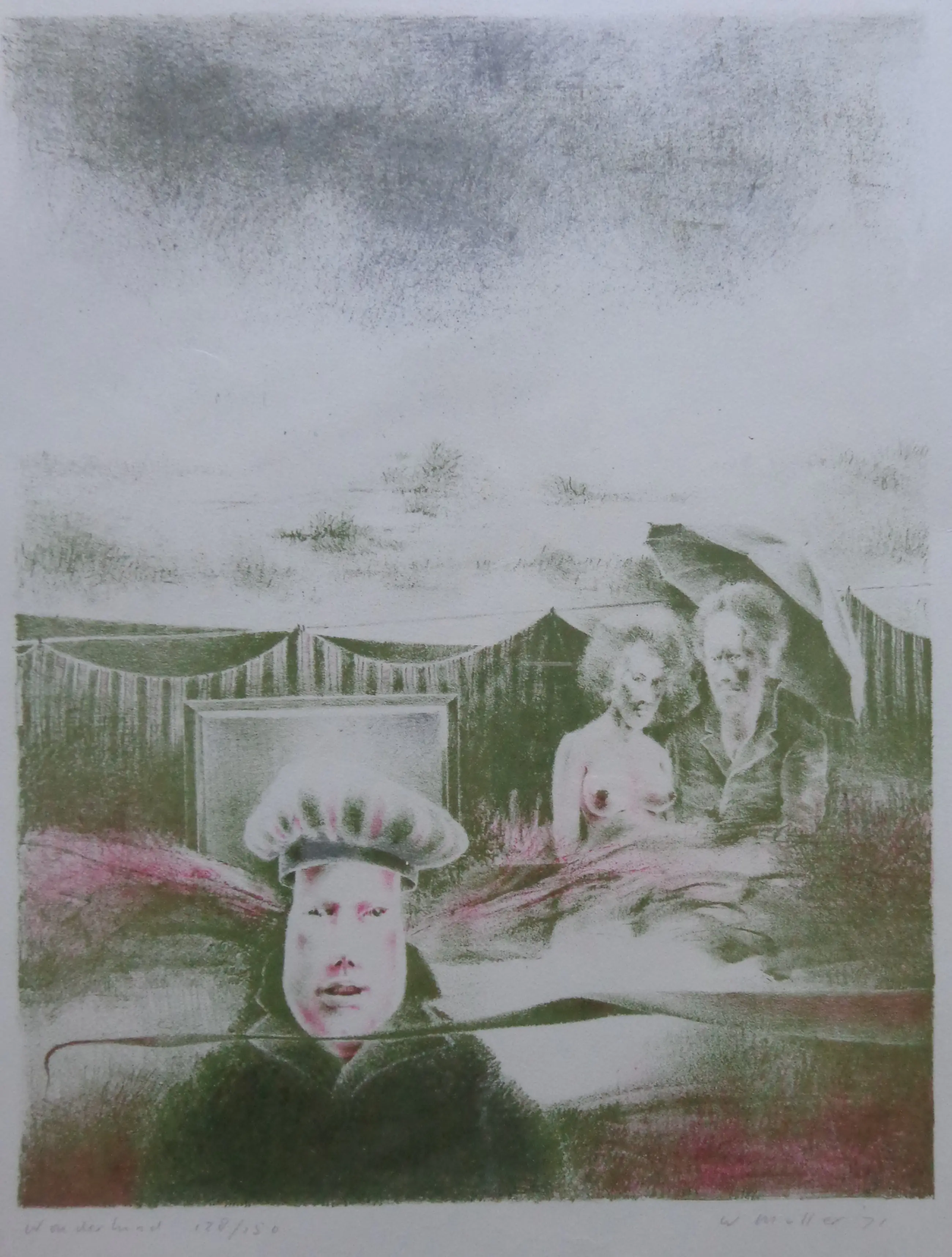 Wout Muller (1946-2000). Titel: "Wonderkind". Kleurlithografie op papier. Gesigneerd met potlood. Ex.nr. 128/150. 1971. Blad: 49x39cm. Kader: 51x41cm. Goede staat.