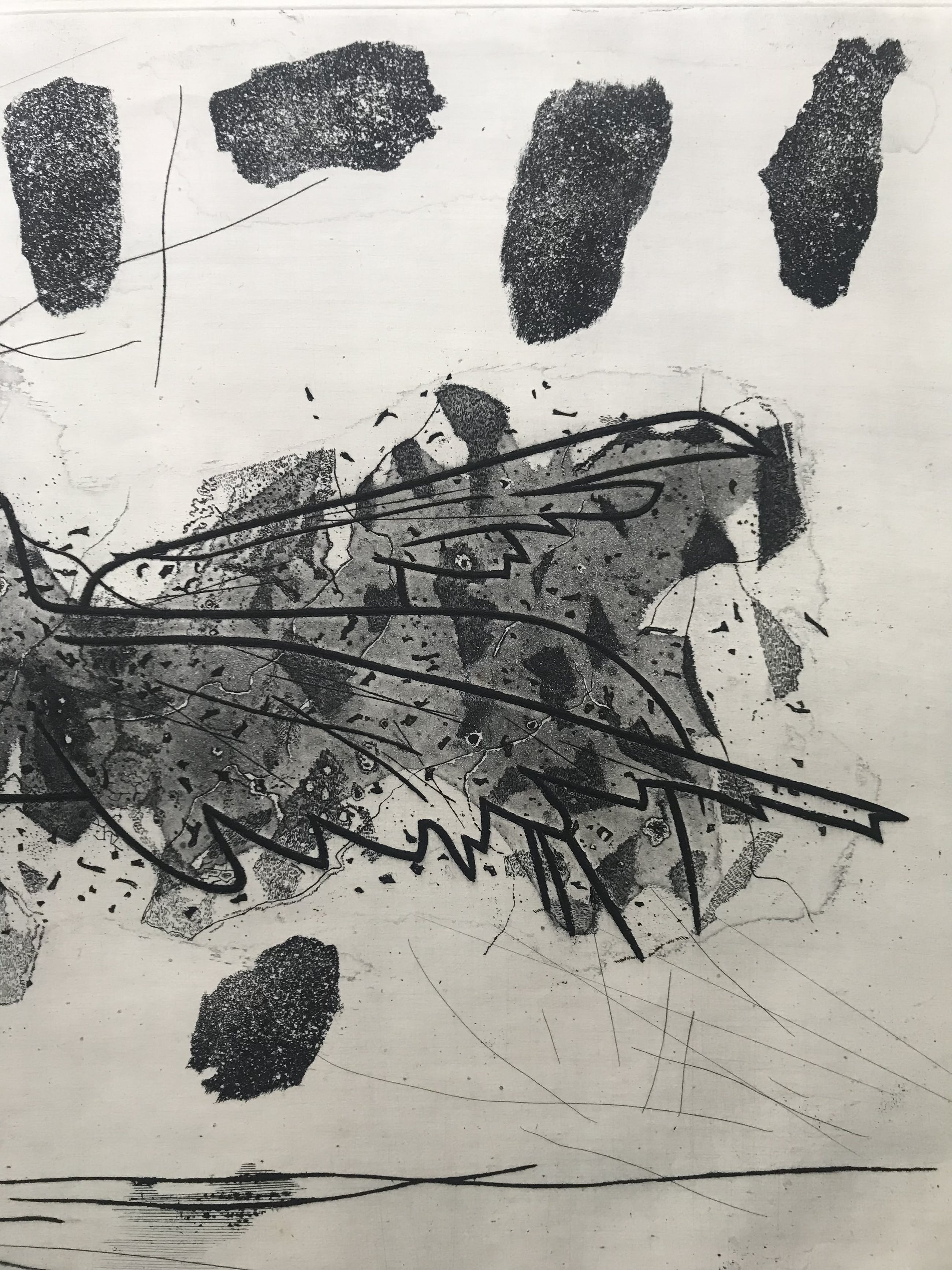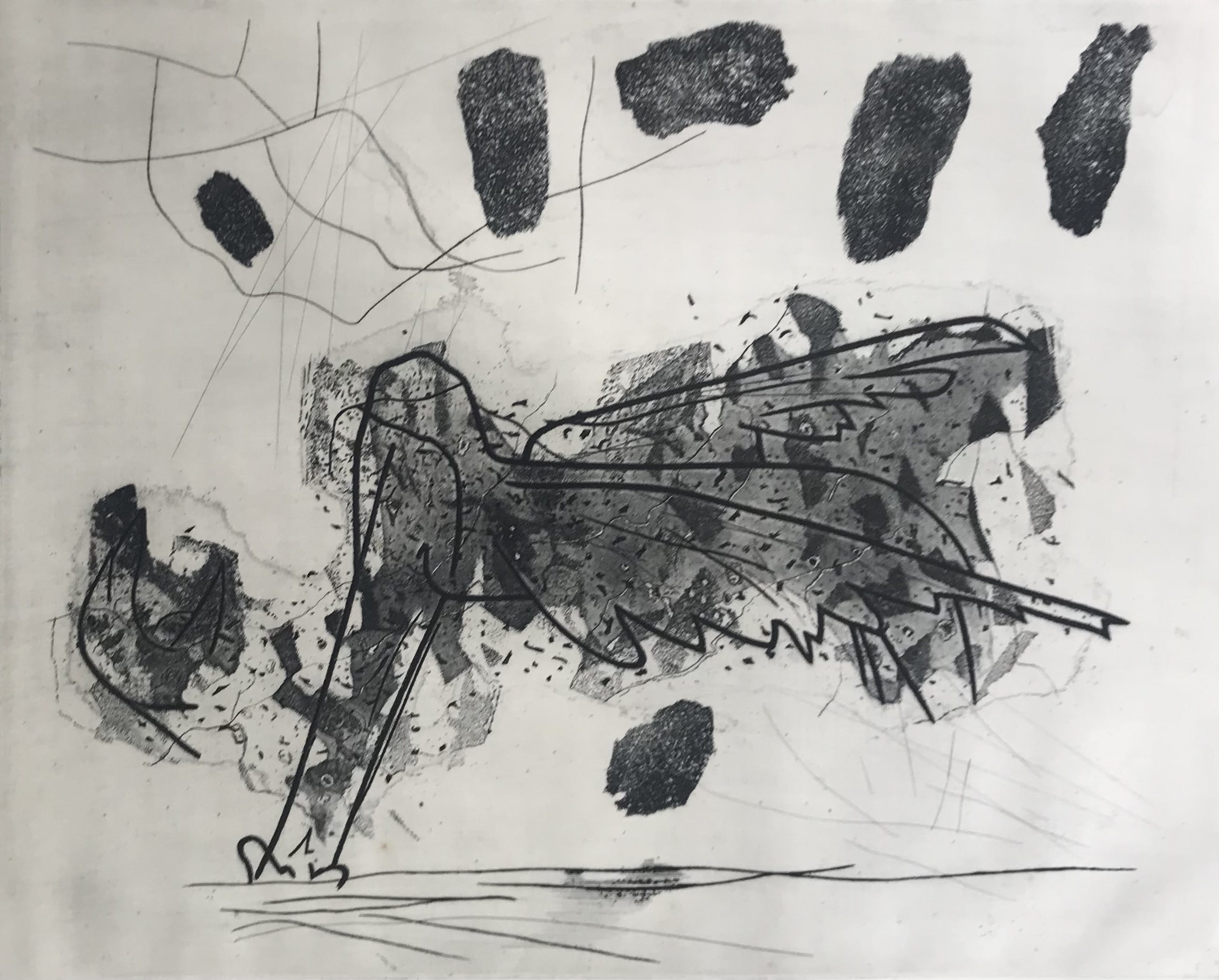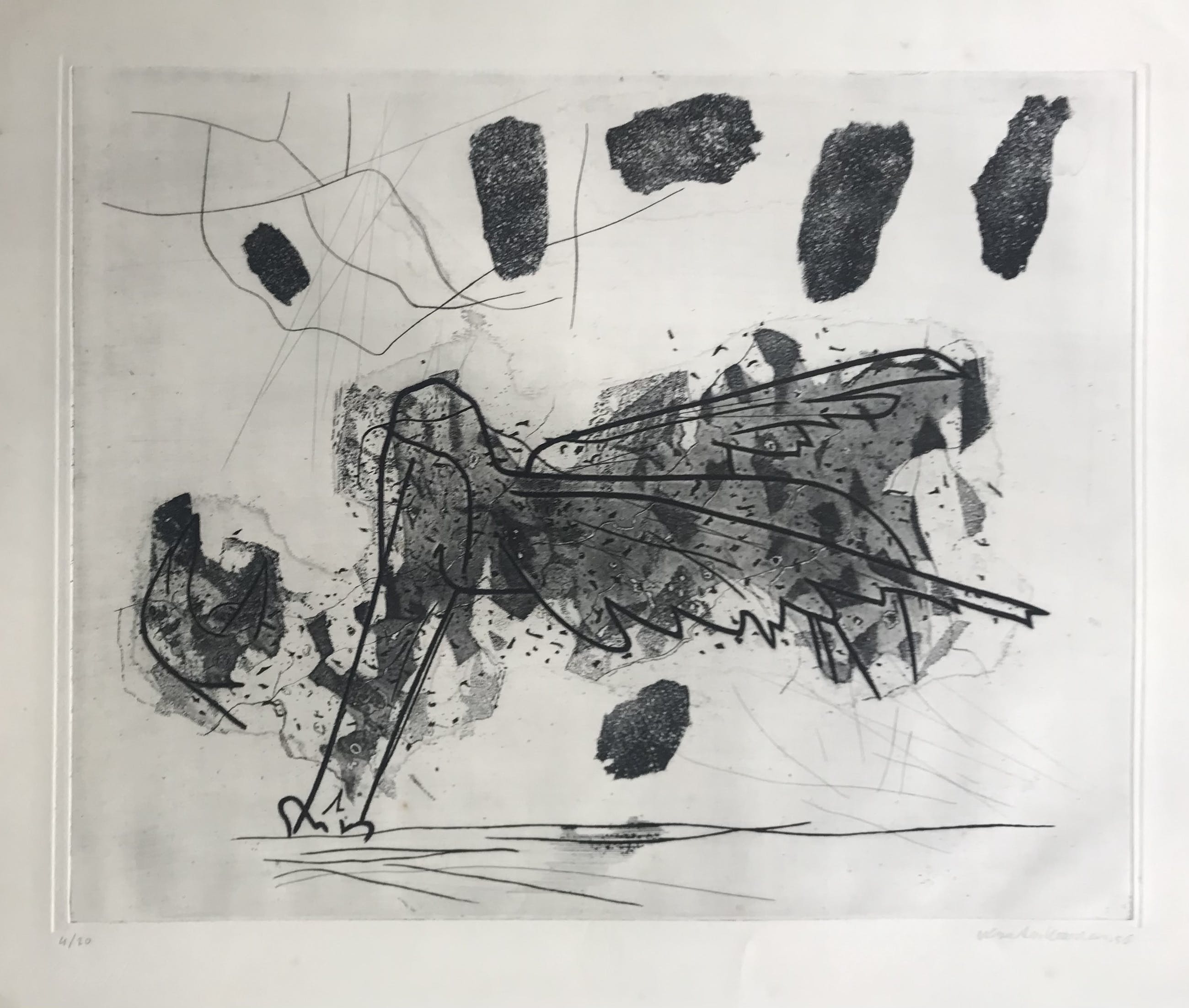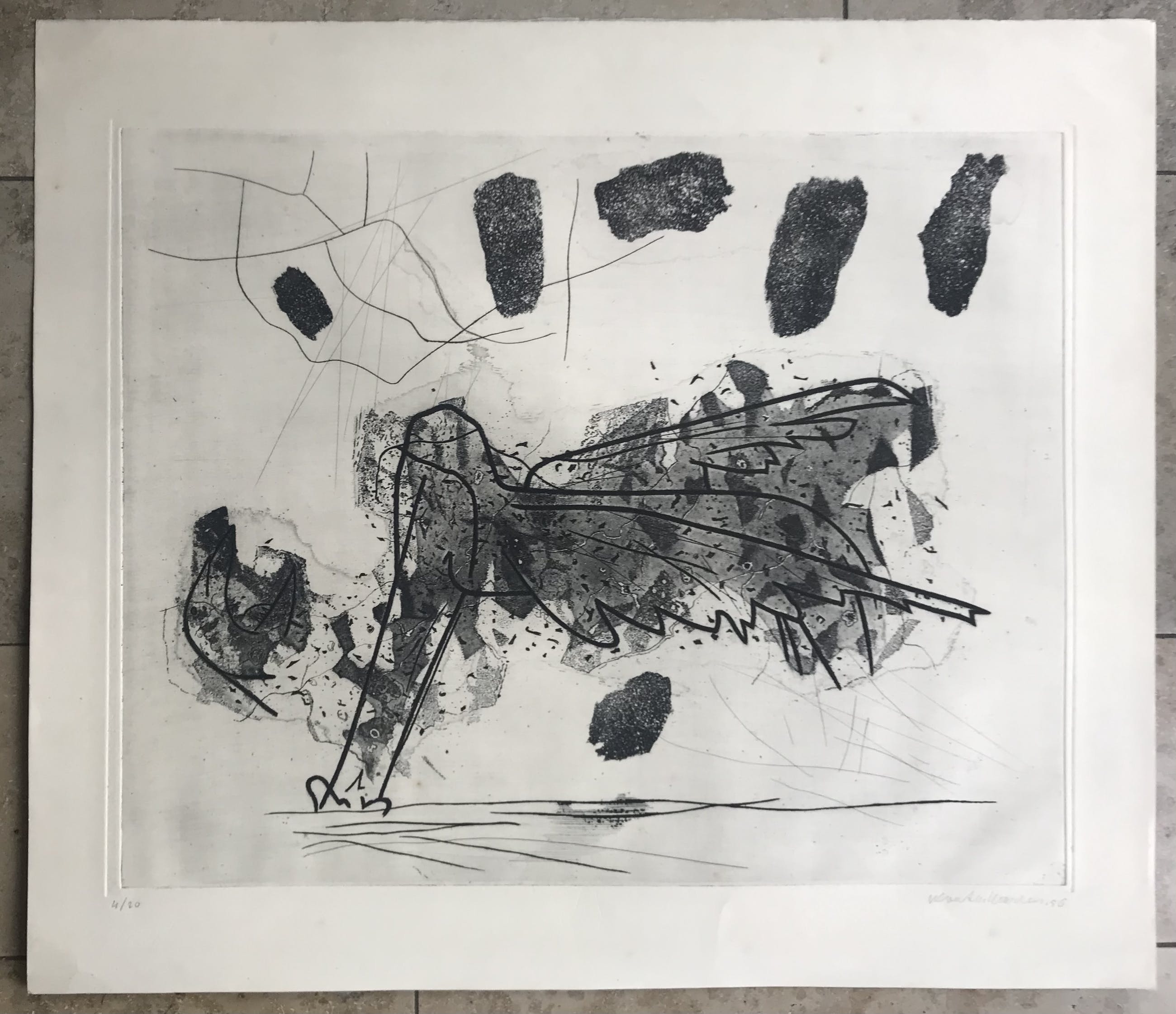 Mooie, grote en vroege (1956) ets (aquatint) van Wout Van Heusden. Titel: "Gevleugeld dier dat zijn kop verliest"