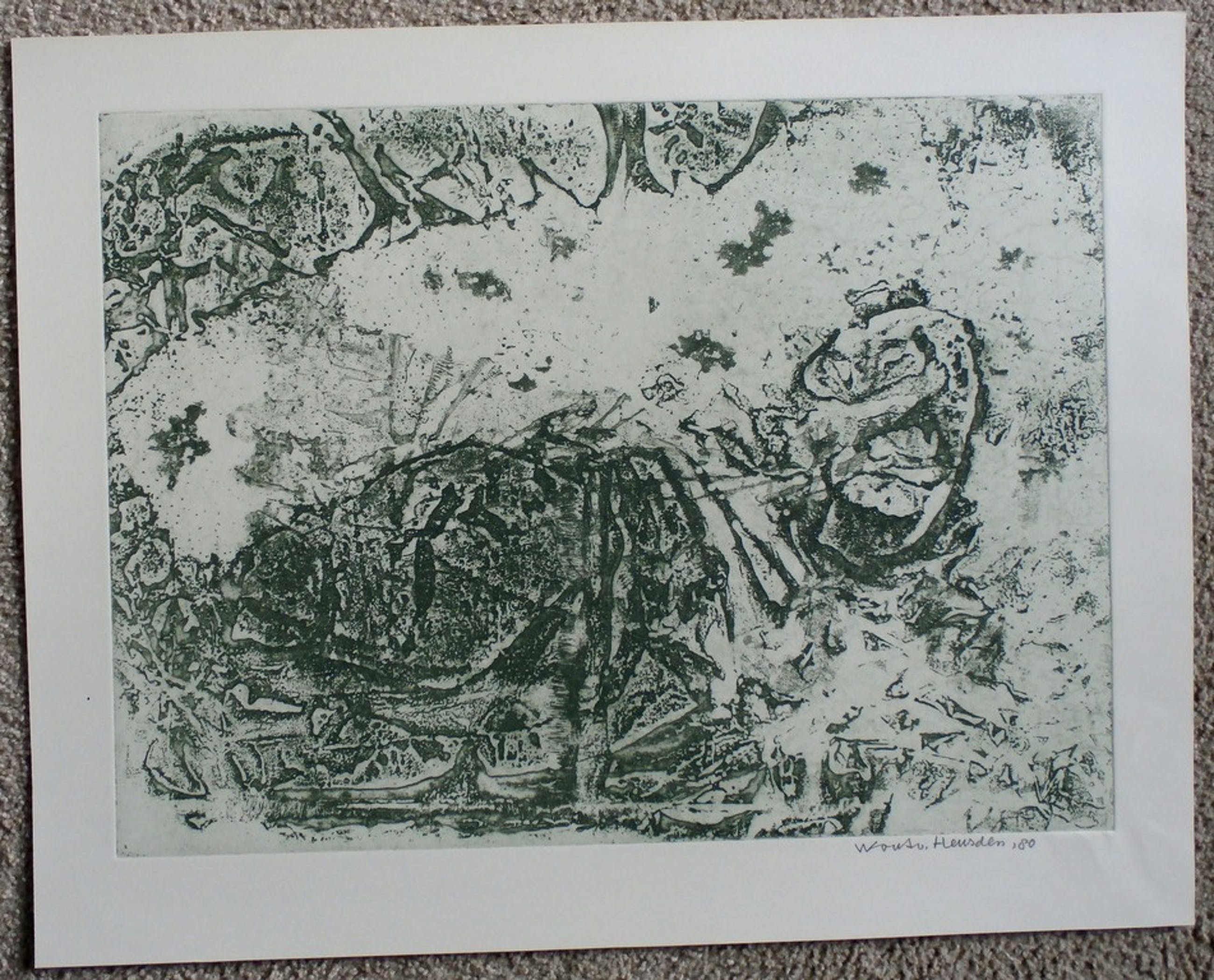 Ets van Wout van Heusden uit 1980. Het werk is rechtsonder, met potlood, gesigneerd door de kunstenaar. Afmetingen blad: h47 x b 59cm. Afmetingen voorstelling: h37,5 x b50,5 cm. De authenciteit van dit werk wordt volledig gegarandeerd. Een certificaat van echtheid kan, op verzoek, worden meegeleverd.