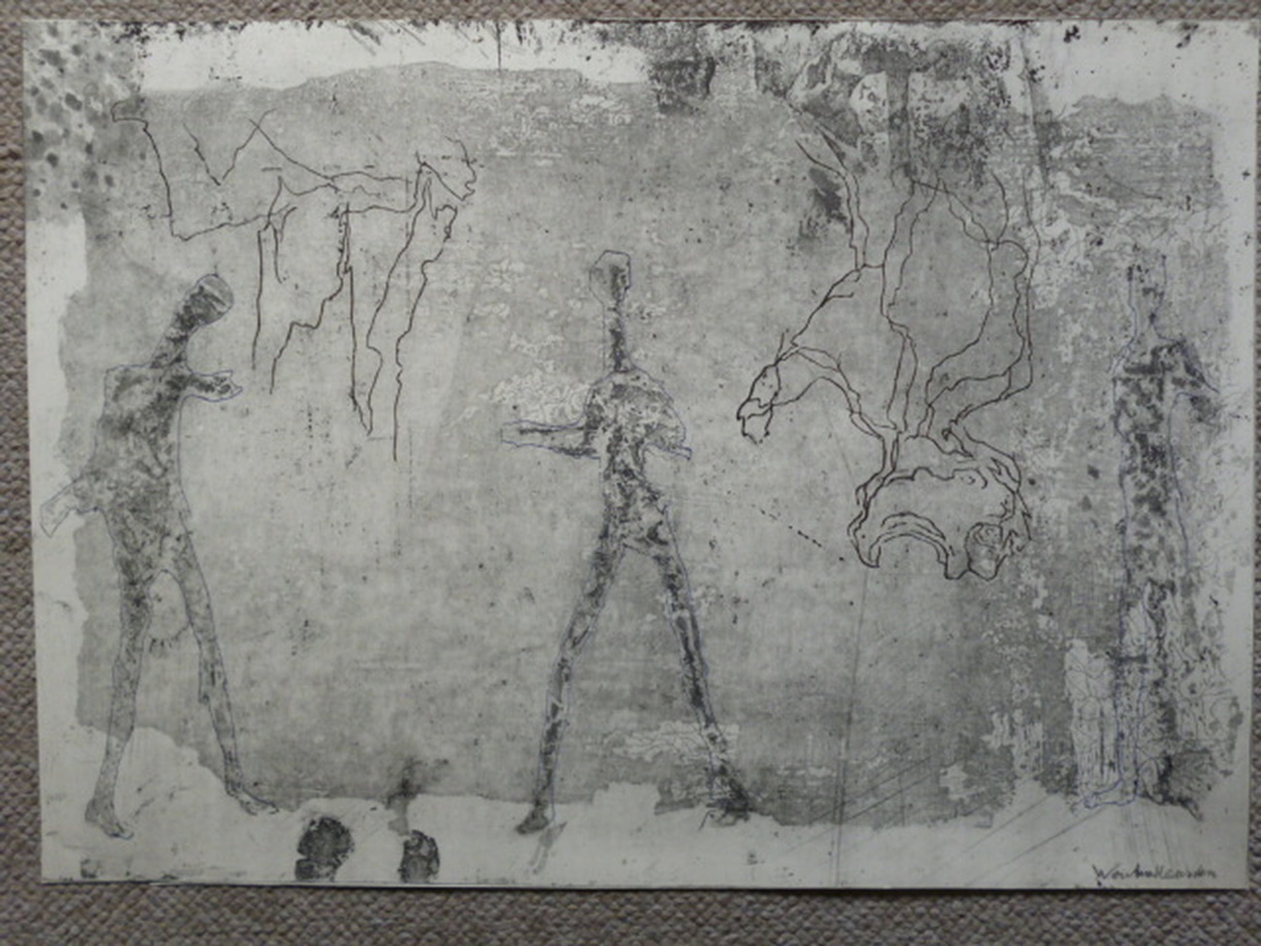 Ets, potlood gesigneerd rechtsonder. Voorstelling drie figuren in abstracte achtergrond.