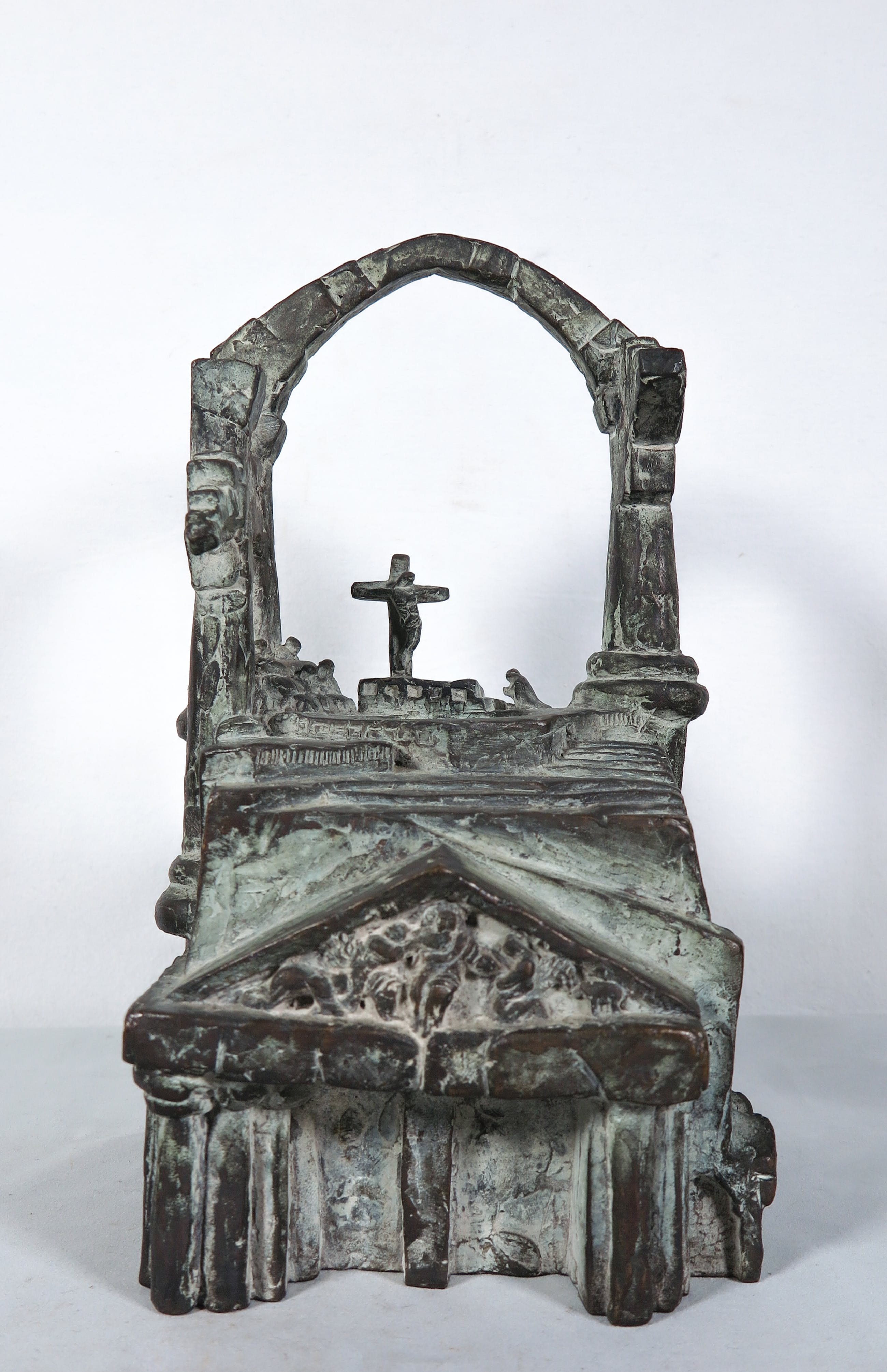 Bijzonder bronzen beeld in een surrealistische stijl met religieus thema. Het beeld is bijzonder bewerkt, met tempelfronten, pilaren, trappen en figuren. Je blijft ernaar kijken. Gesigneerd langs de onderste rand.