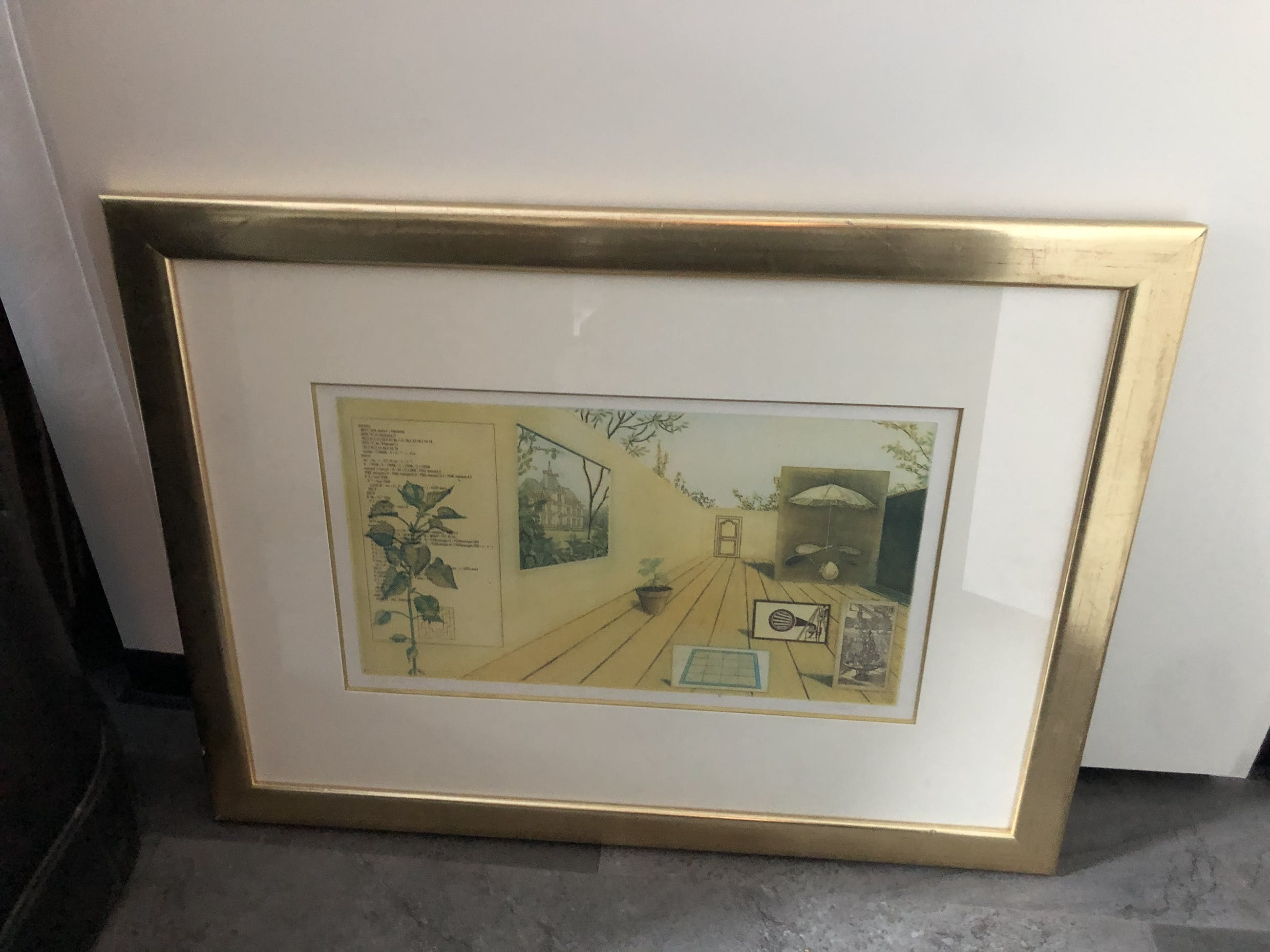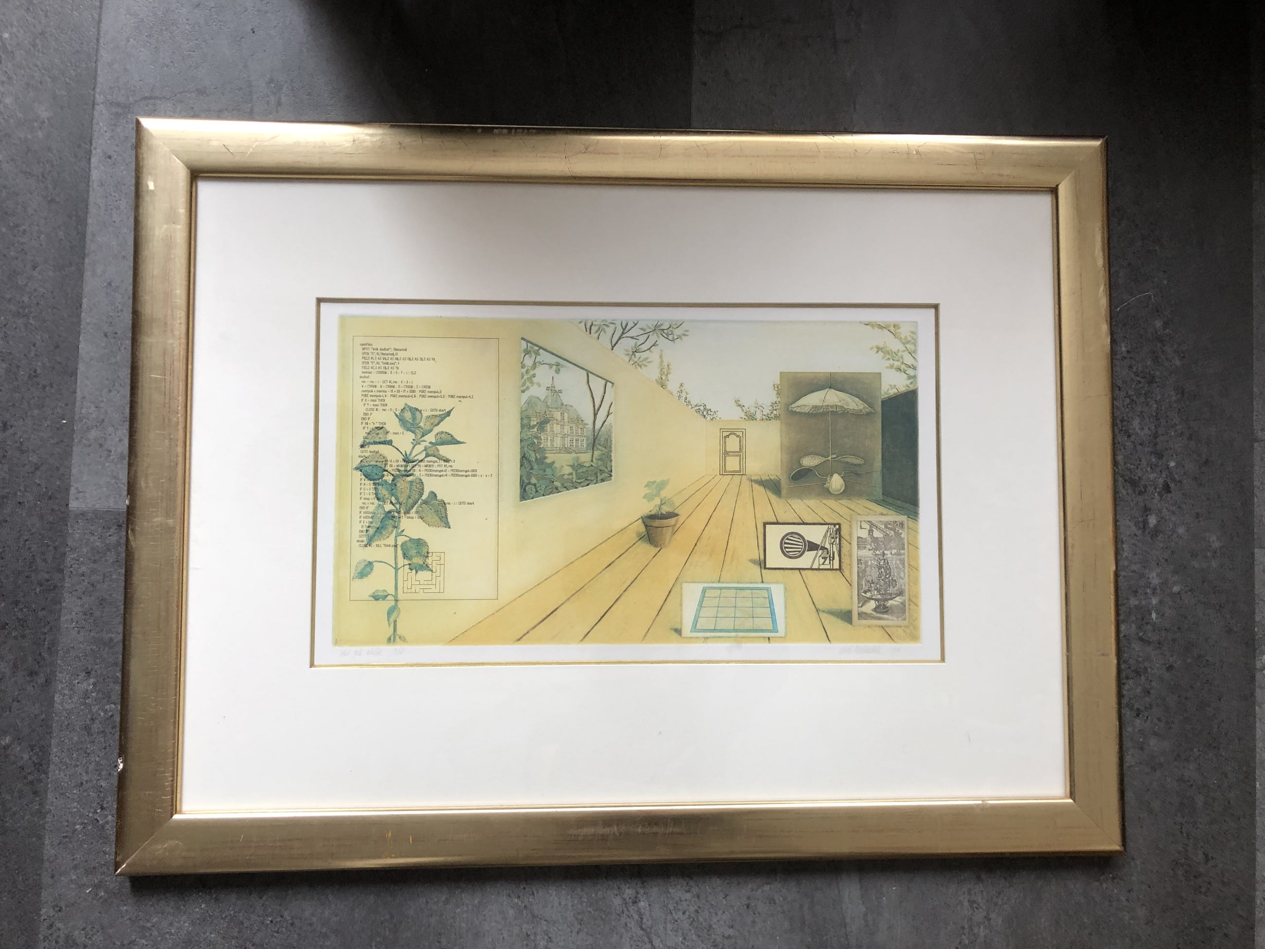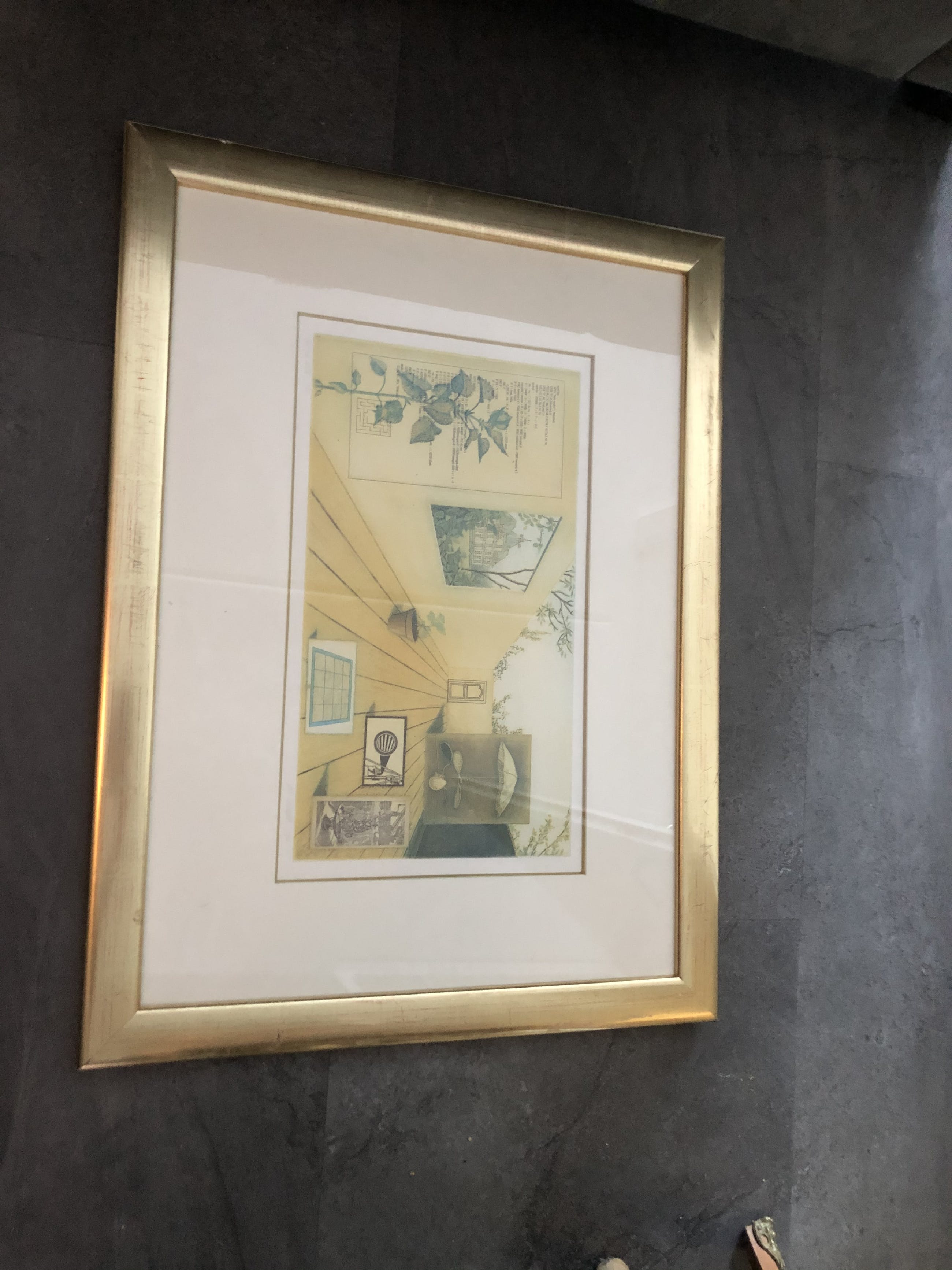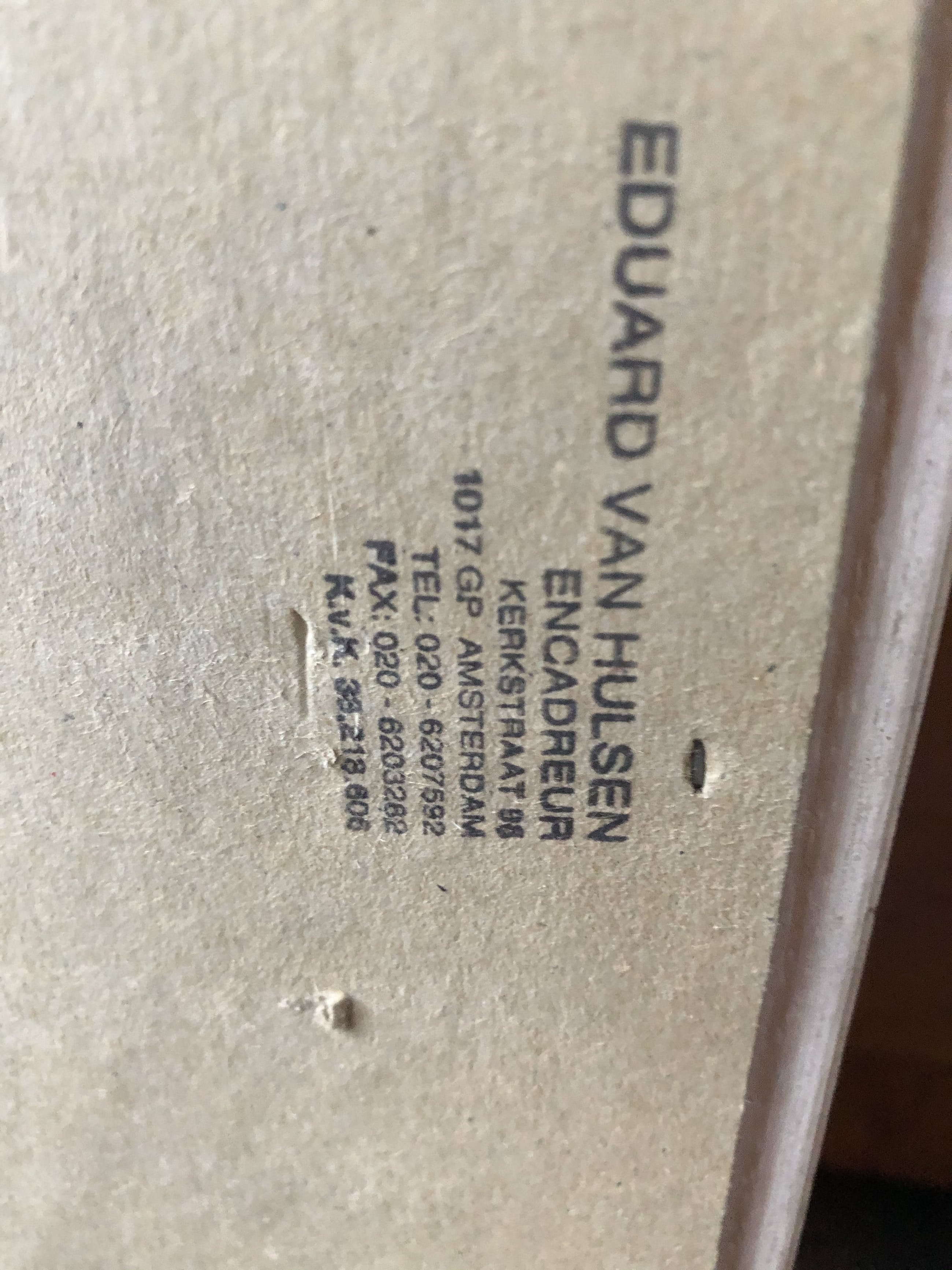 Kunstwerk is in zeer goed staat achter glasplaat, lijstrand is beschadigd.