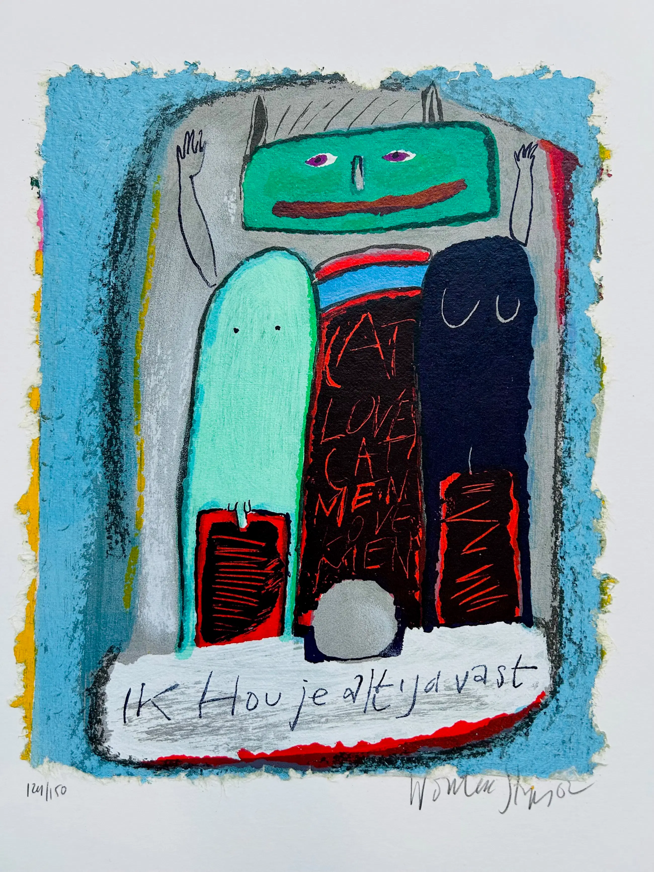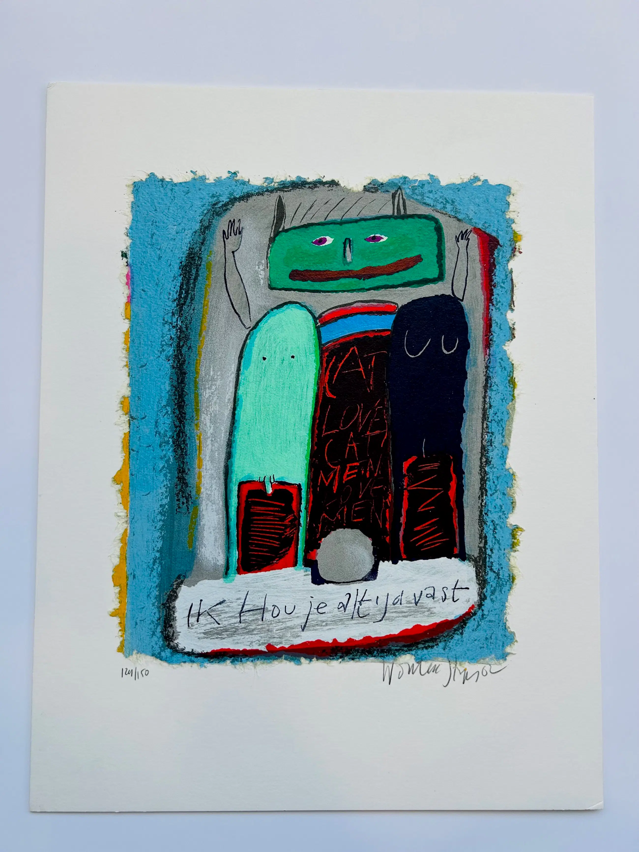 Mooi kleurrijke zeefdruk van Wouter Stips op  karton geplakt. Het werk verkeert in zeer goede conditie. U kunt het werk vooraf komen bekijken bij galerie Rotor of na aankoop ophalen. Het werk kan ook verzonden worden via aangetekende post. Met potlood gesigneerd en genummerd.