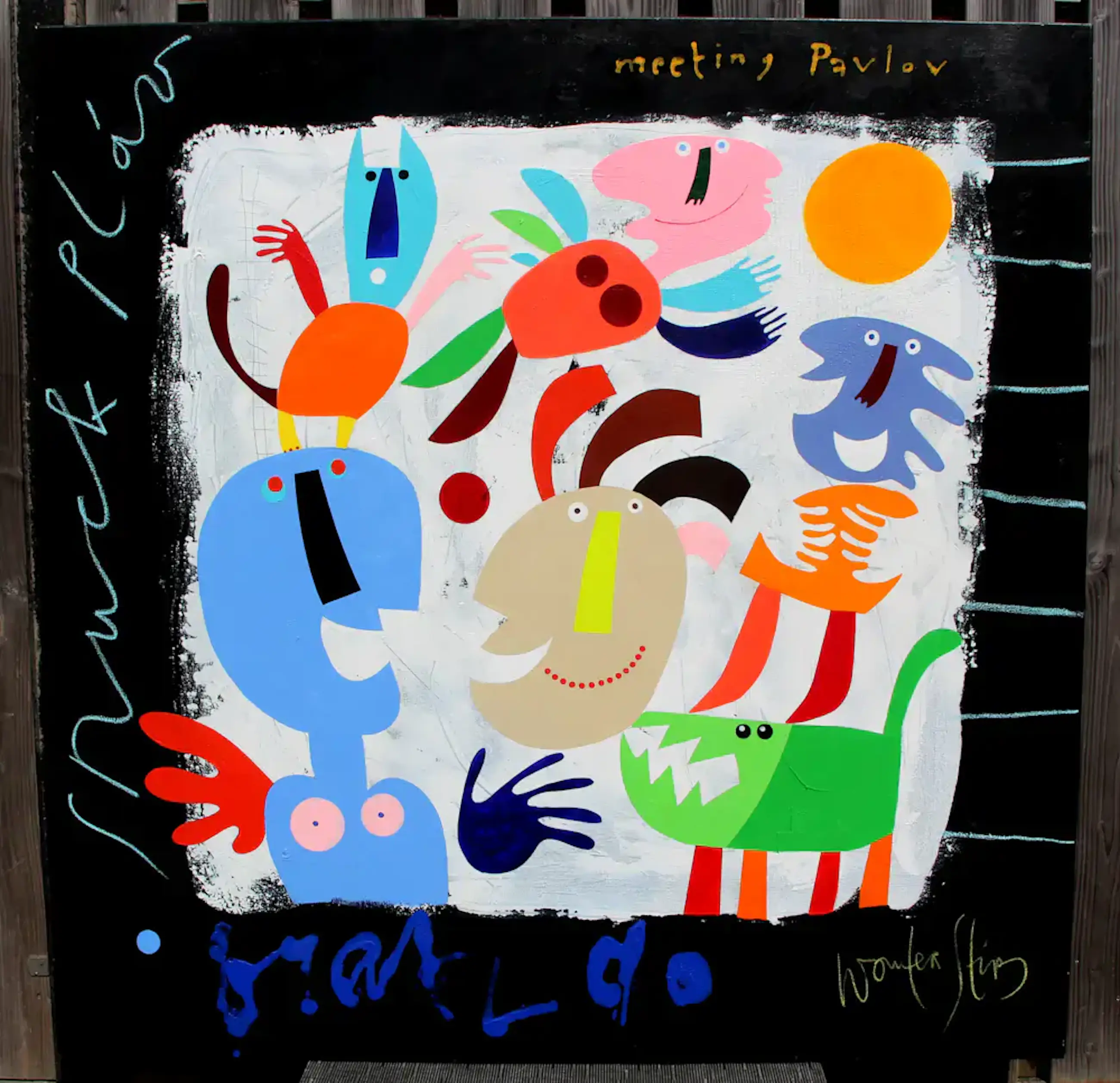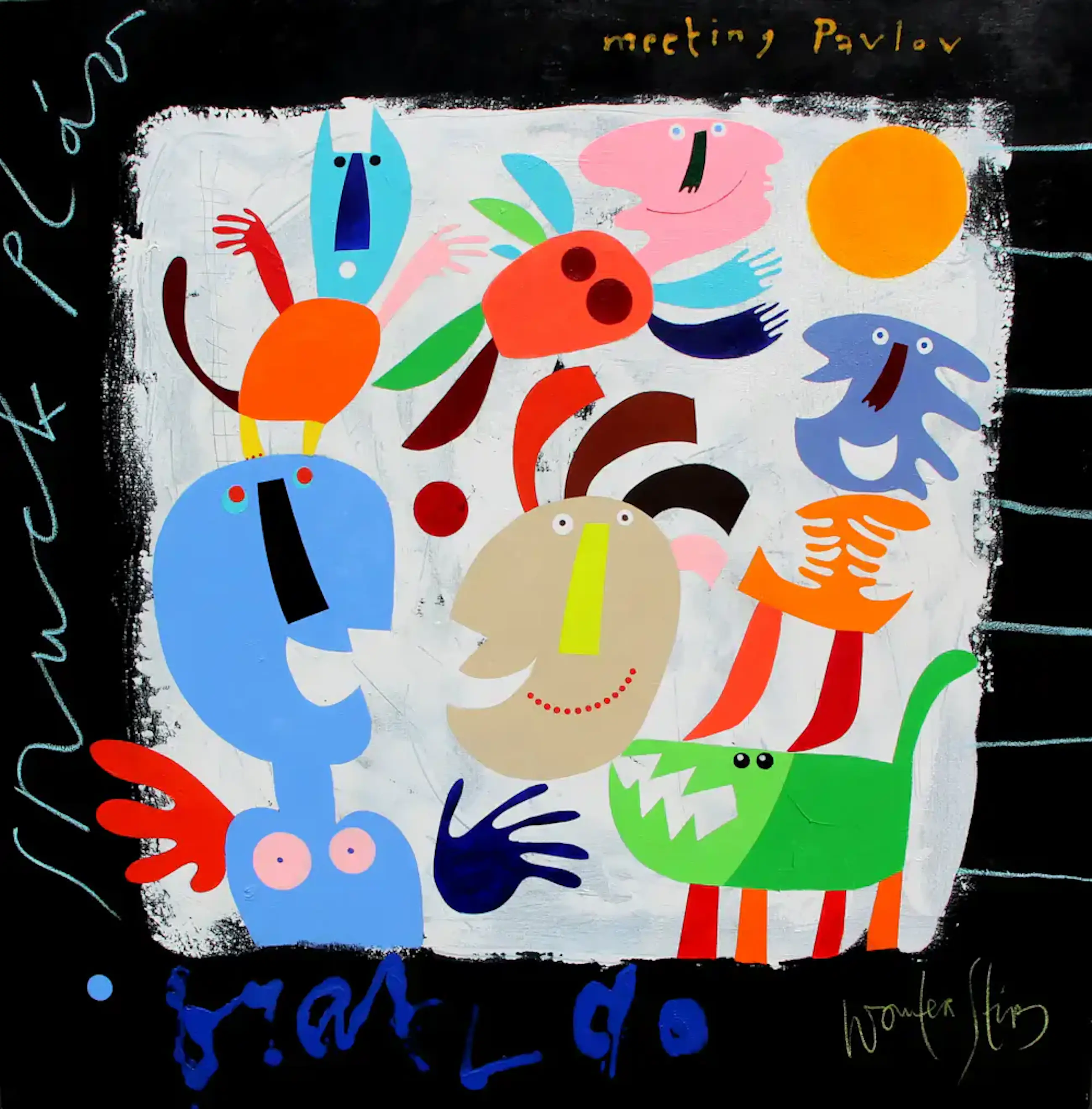 Olieverf op doek van Wouter Stips. Titel: 'Meeting Pavlov'. Afmetingen incl lijst: H160 x b160cm. Afmetingen werk: H150 x b150cm. Het werk is rechts onderaan, met potlood, gesigneerd door de kunstenaar. De authenticiteit van de aangeboden werken worden volledig gegarandeerd. Een certificaat van echtheid kan, op aanvraag, worden gemaild.