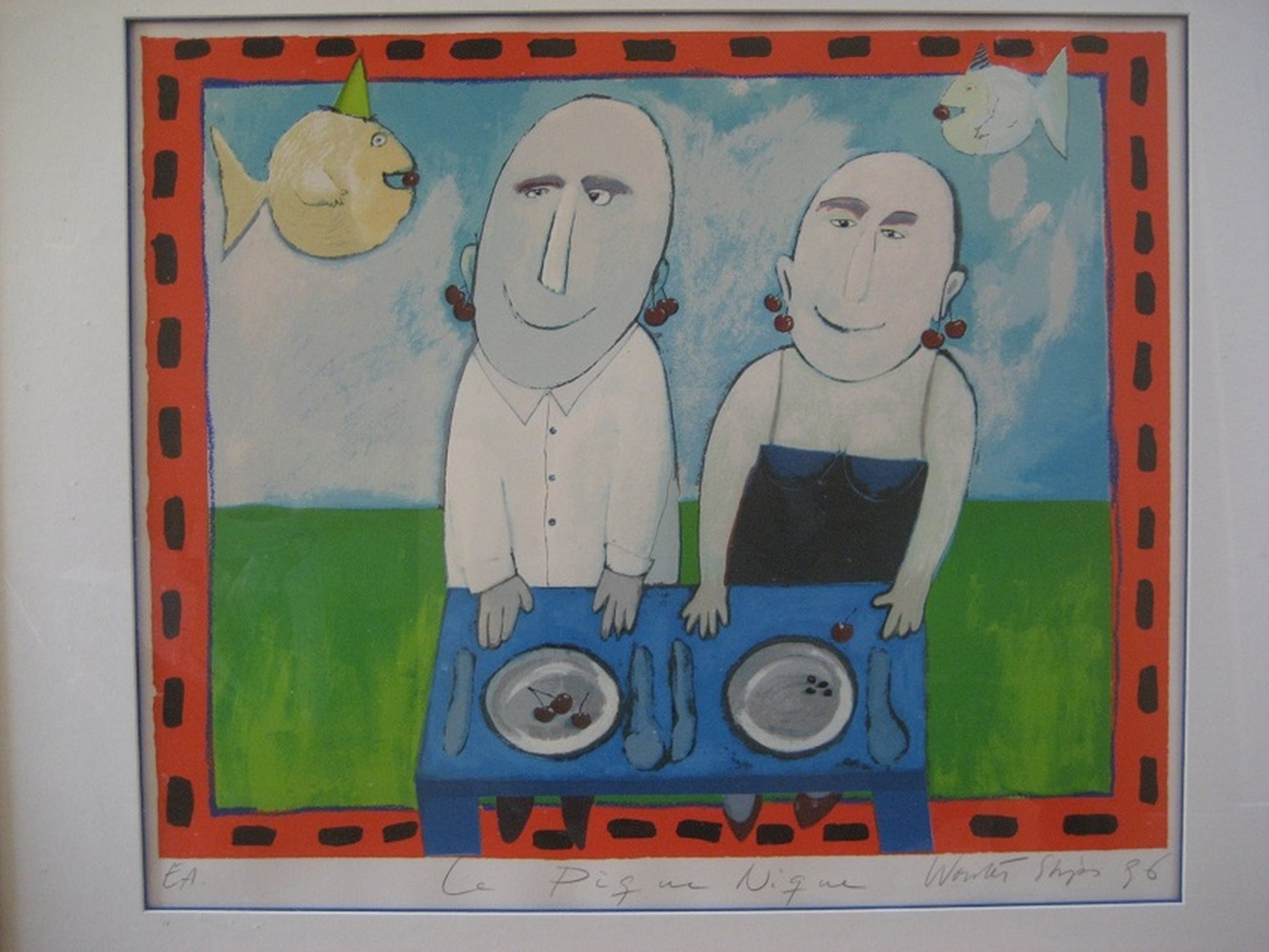 Warme grote zeefdruk met een lief wat ouder stel, die doen wat we allemaal hebben gedaan als kind: kersen aan je oren hangen. Prachtige kleuren, 'really lights up a room'.