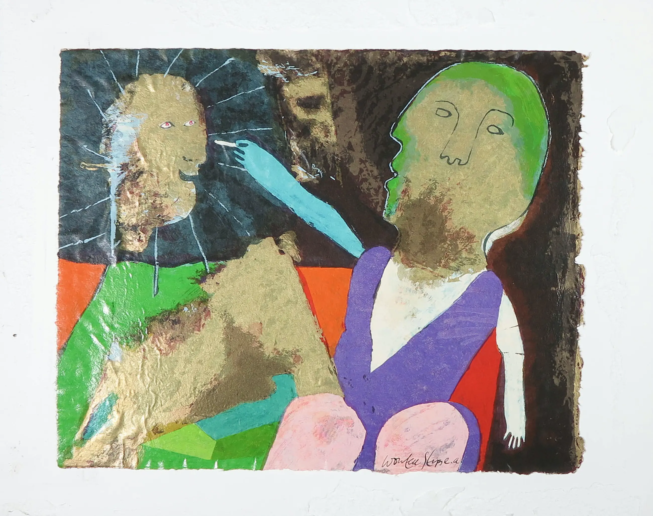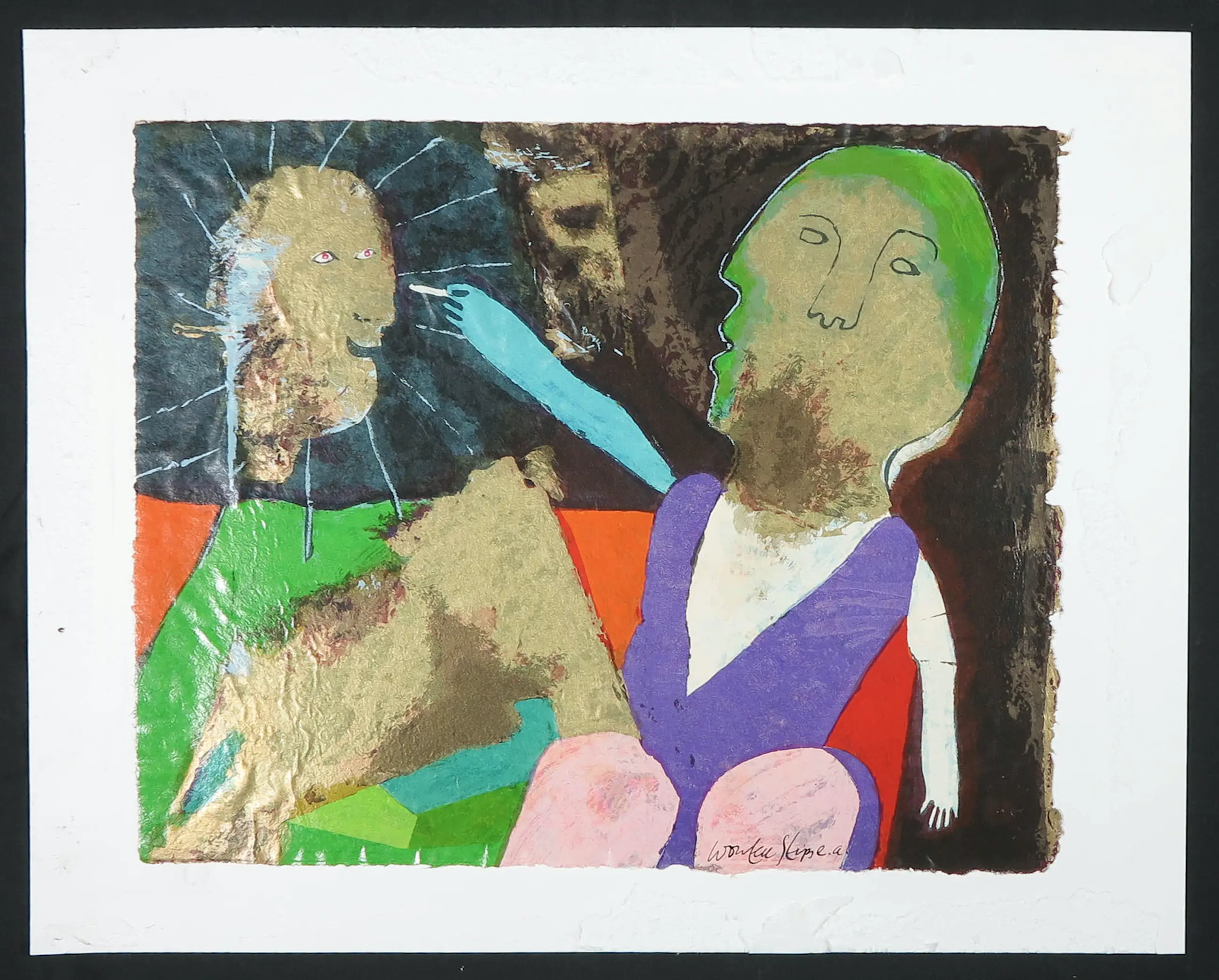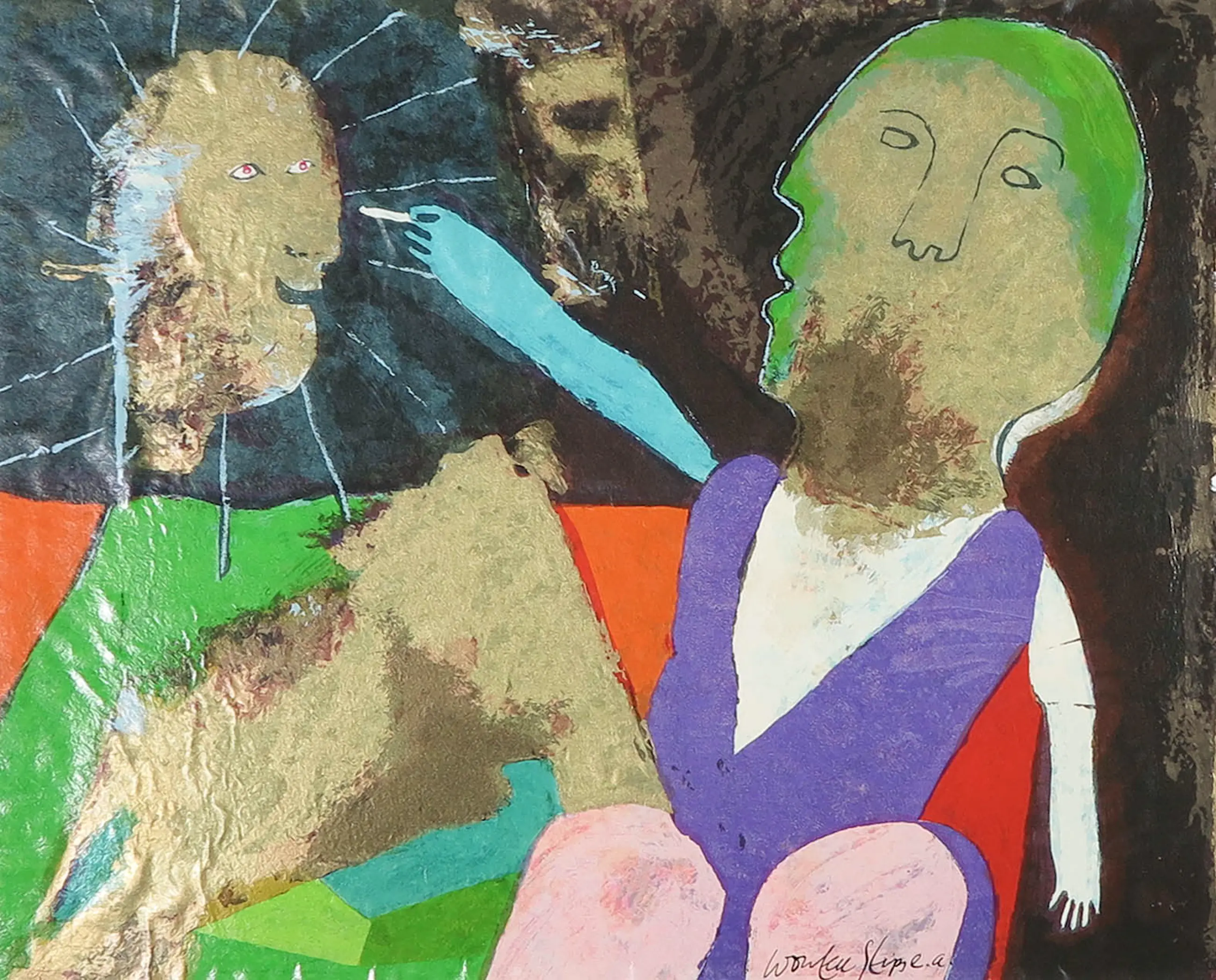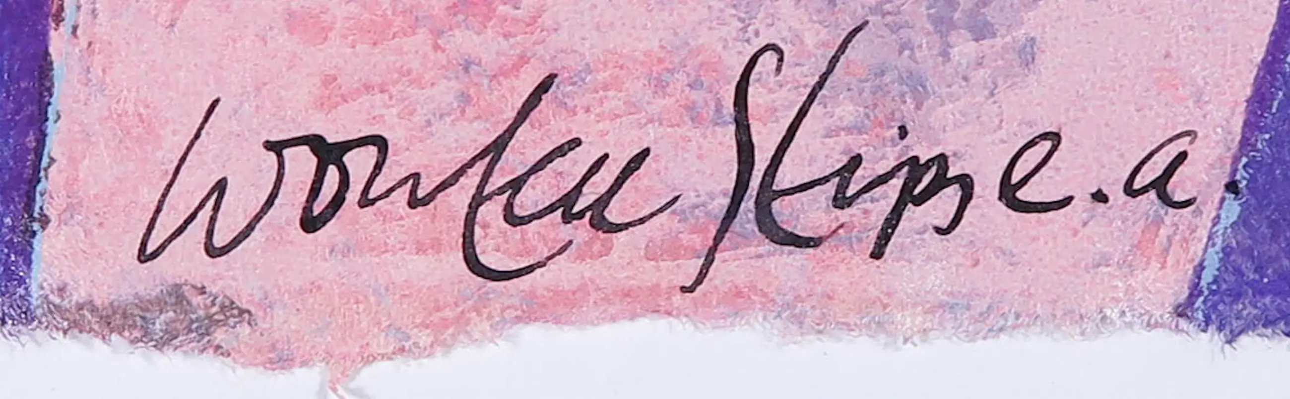 Zeefdruk van Wouter Stips. Het werk is verlijmd op een stuk stevig papier. Let op: de gegeven maten zijn van het papier waarop het werk is bevestigd. De afmetingen van de voorstelling zijn als volgt: 33,5 cm bij 41 cm.