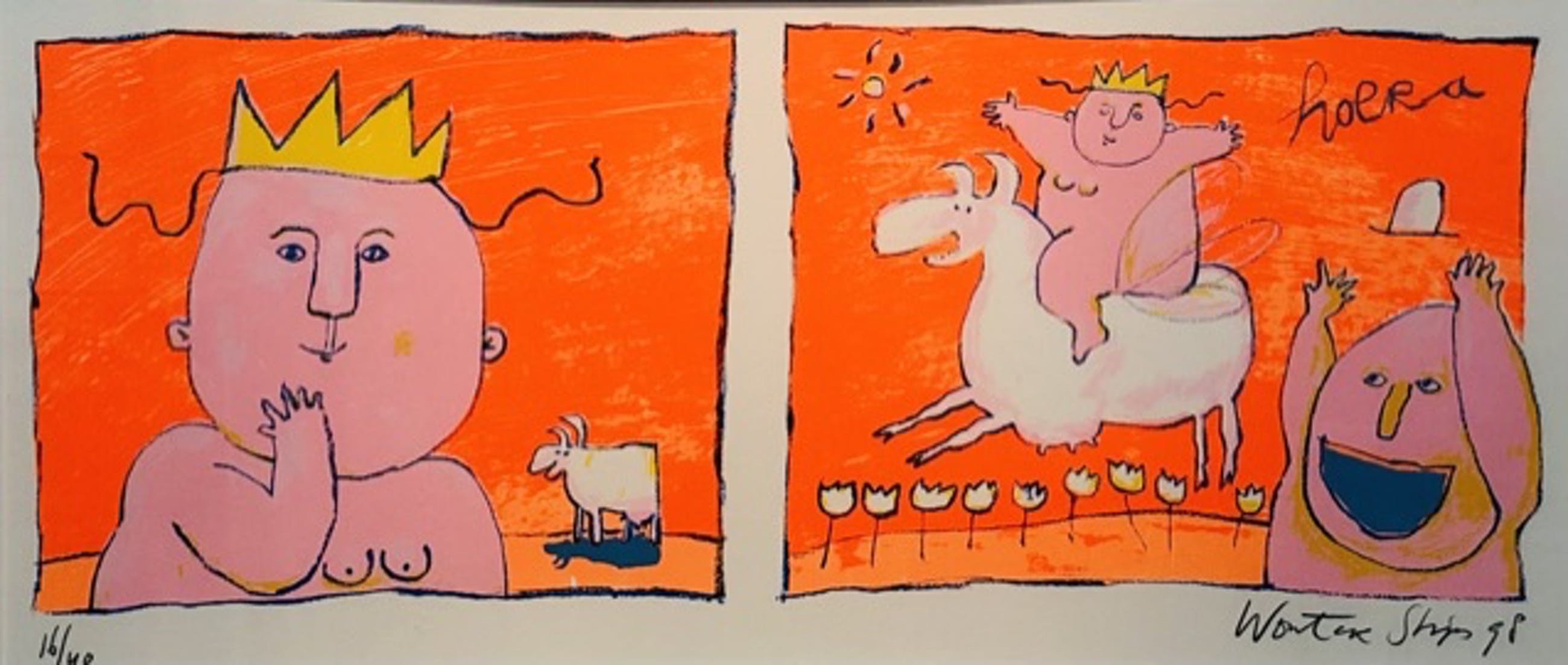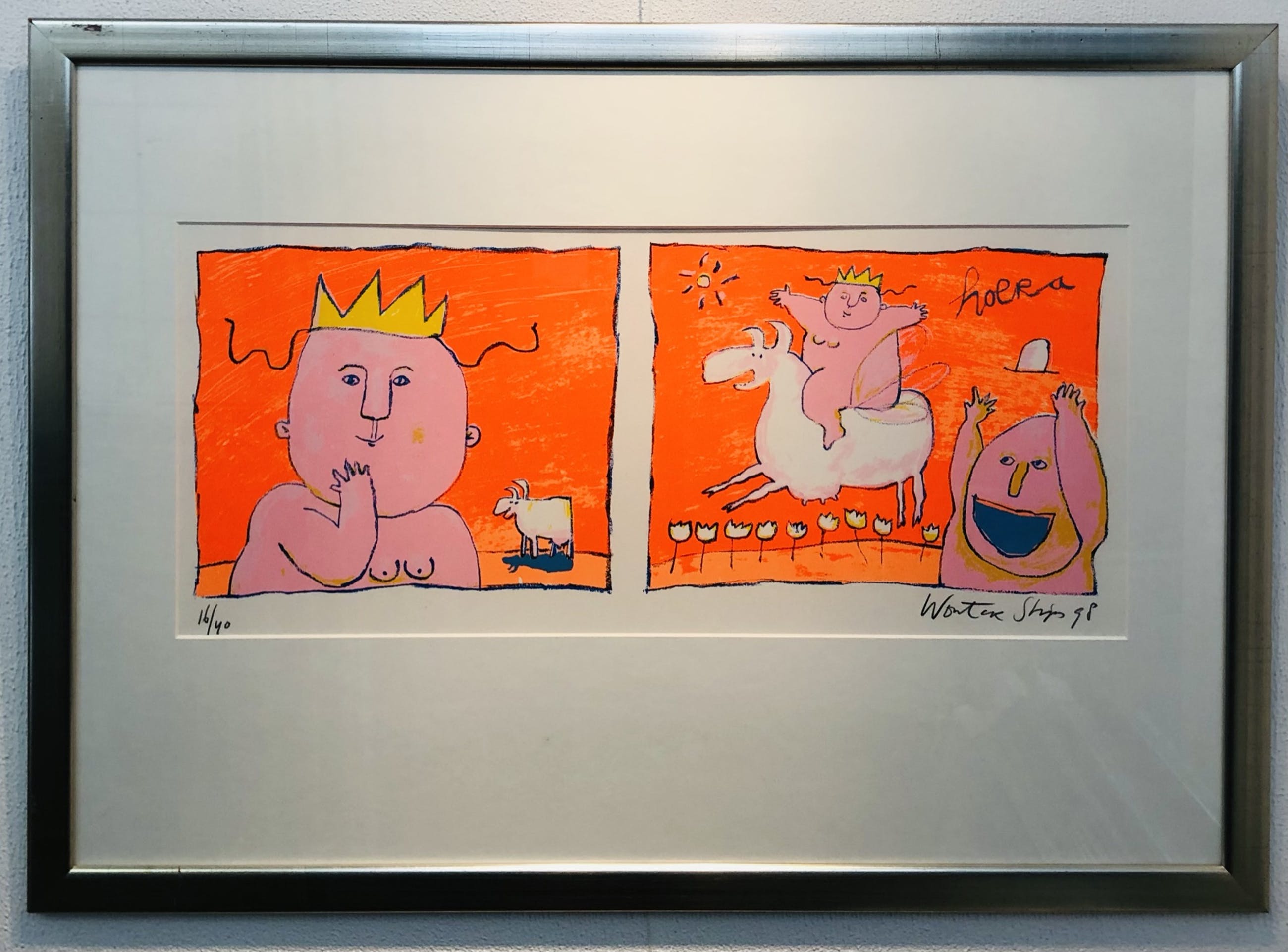 Leuk kleurrijk werk van de Hilversumse kunstenaar Wouter Stips met passe partout en lijst. De lijst is niet nieuw maar goed toonbaar. Het werk kan zo aan de muur worden opgehangen. Het werk kunt u vooraf komen bekijken en beoordelen. Het werk kan na aankoop afgehaald worden bij galerie Rotor in Gorcum of verzonden worden per koerier worden verzonden binnen Nederland en België. U kunt het werk ook laten opslaan in onze opslagkamer en in een later stadium ophalen. De foto is door het glas van de omlijsting heen genomen.