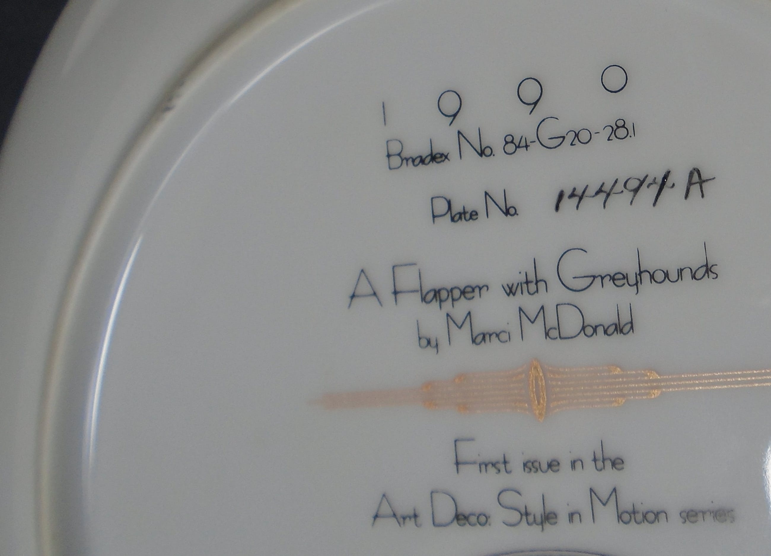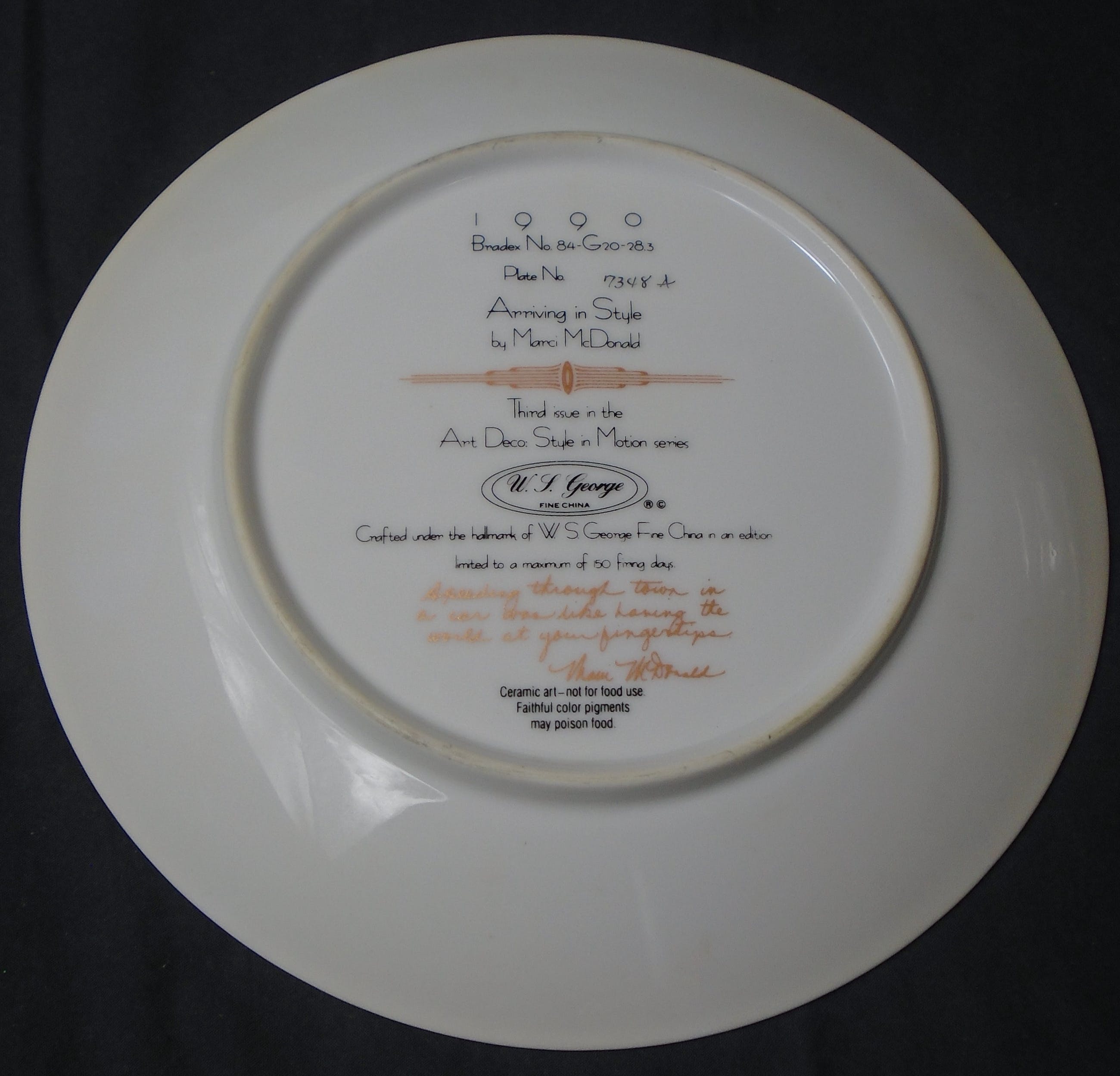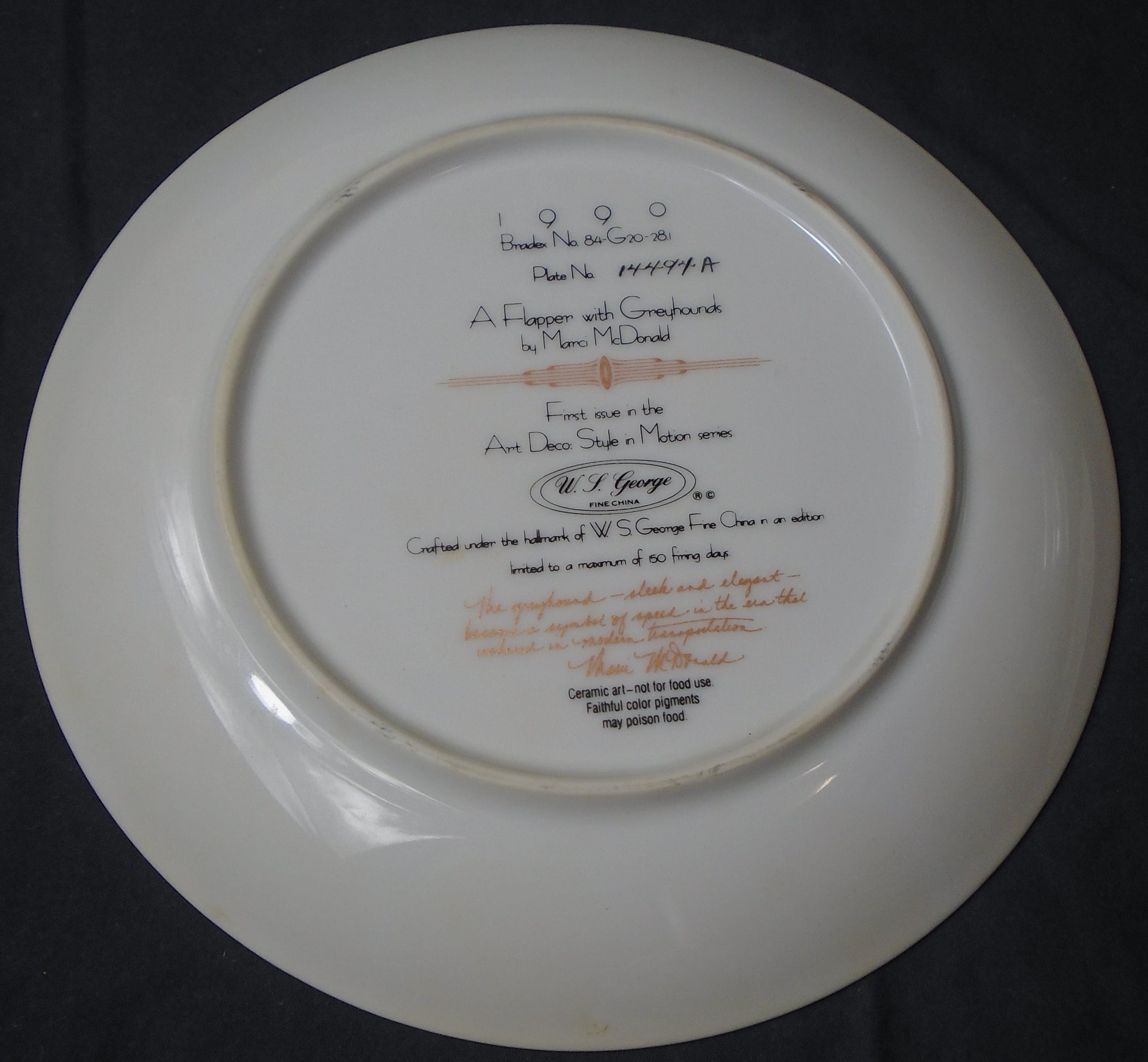 3 Plates: Art Deco Style in Motion series by W.S. George The plates measure 8-1/2" (21.5cm) in diameter. The back of each plate has the plate number and Bradex number and personally signed by the artist Marcy McDonald. No cracks, chips or flaws. Weight 400 grams