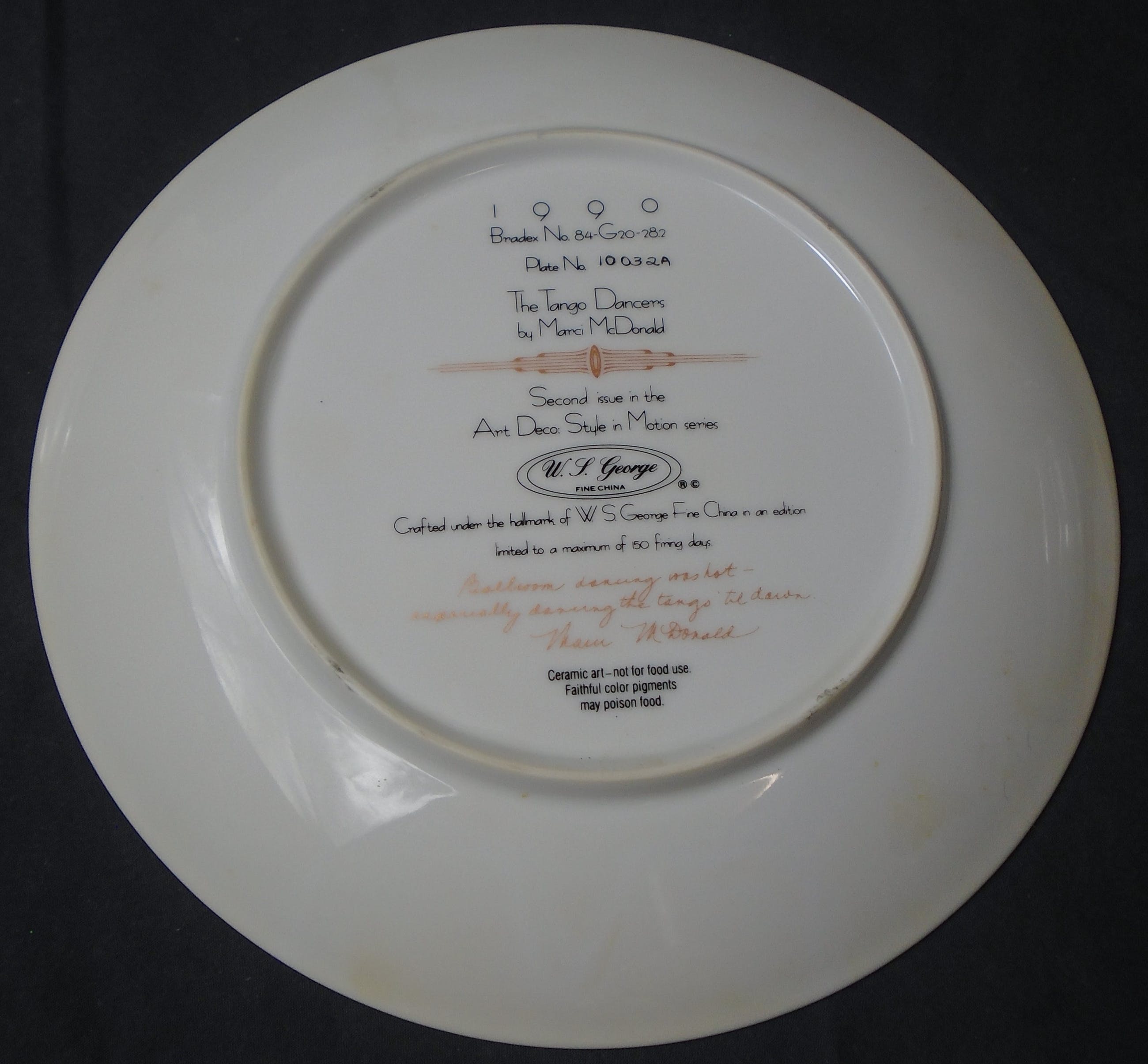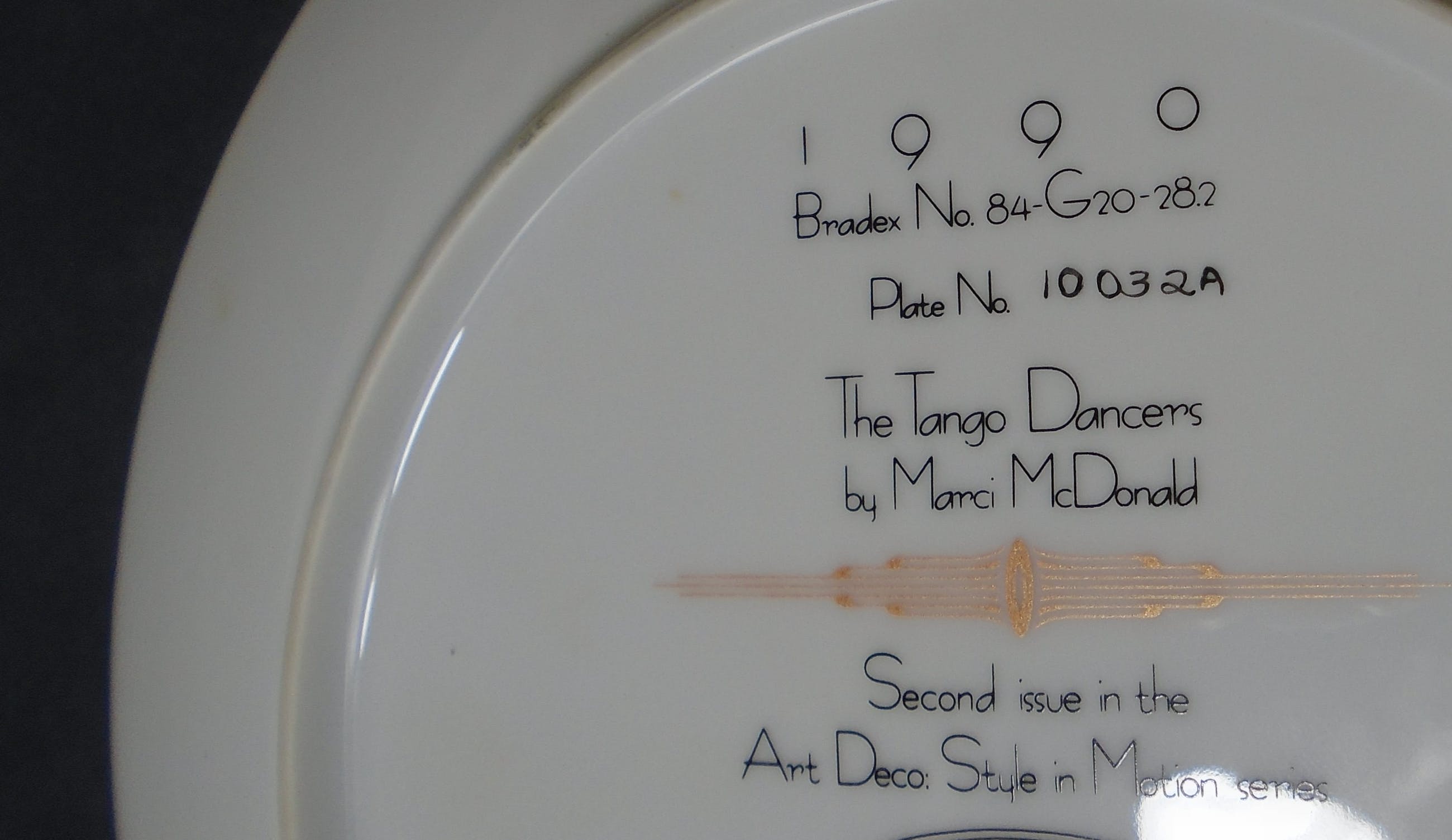 All plates limited to a maximum of 150 firing days. NOT for food use! A limited edition ------------- 1990 Bradex No: 84-G20-28.2 Plate No. 10032A 'The Tango Dancers' by Marci McDonald Second issue in the Art Deco style in Motion series W.S. George