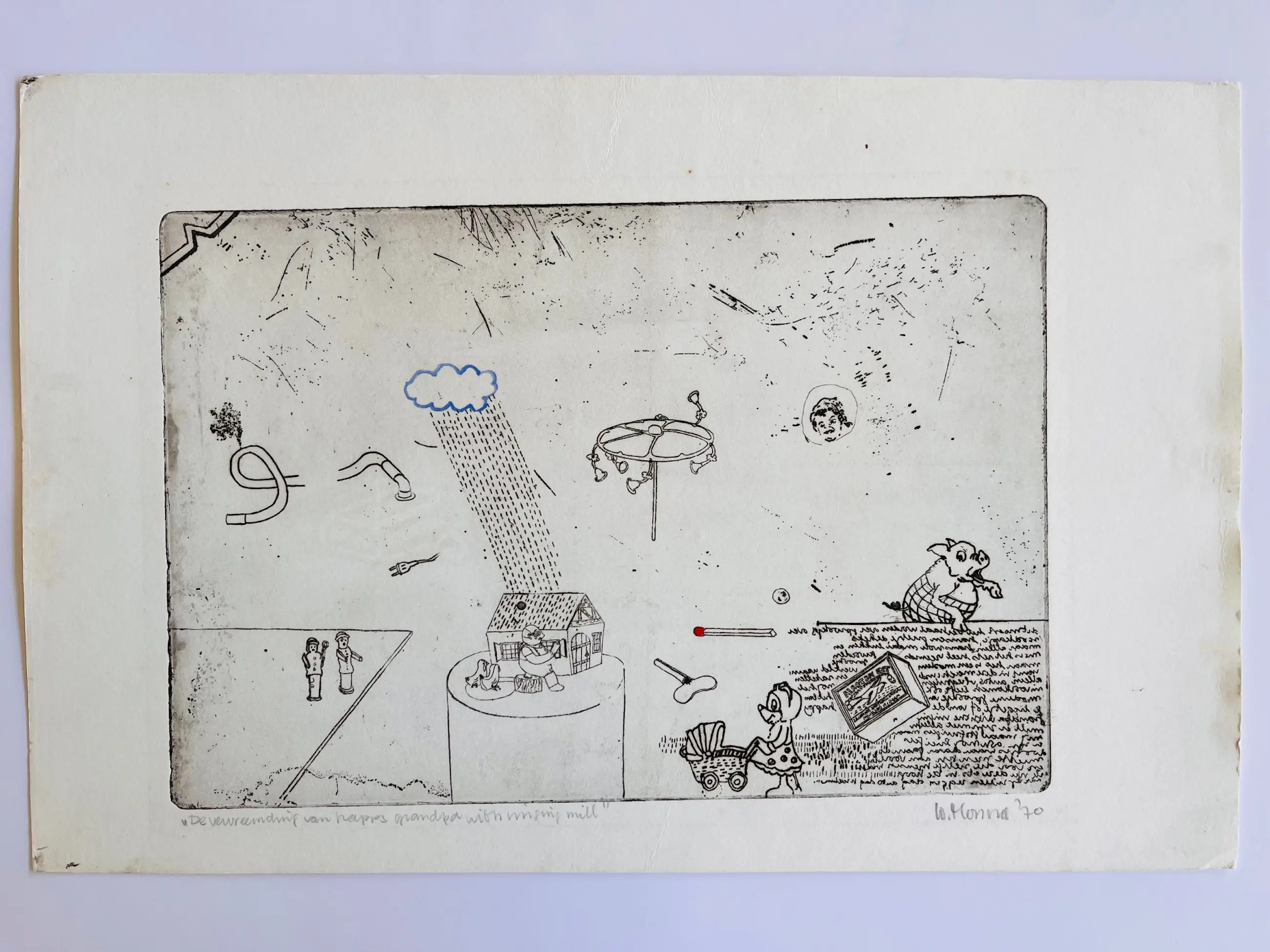 Leuke ingekleurde droge naald ets van Wytze Monna (1946) uit de jaren zeventig, Geïnspireerd op het werk van Holstein en de strips van Polle. Gesigneerd en genummerd. Het werk verkeert in goede conditie. De maat is de totale bladmaat de indruk is dus wat kleiner. U kunt het werk vooraf komen bekijken bij galerie Rotor of na aankoop ophalen. Het werk kan ook verzonden worden via aangetekende post. Ook kunnen wij uw aankopen gratis laten opslaan in onze speciale opslagruimte. Voor uw inlijsting bent u bij ons ook aan het goede adres.