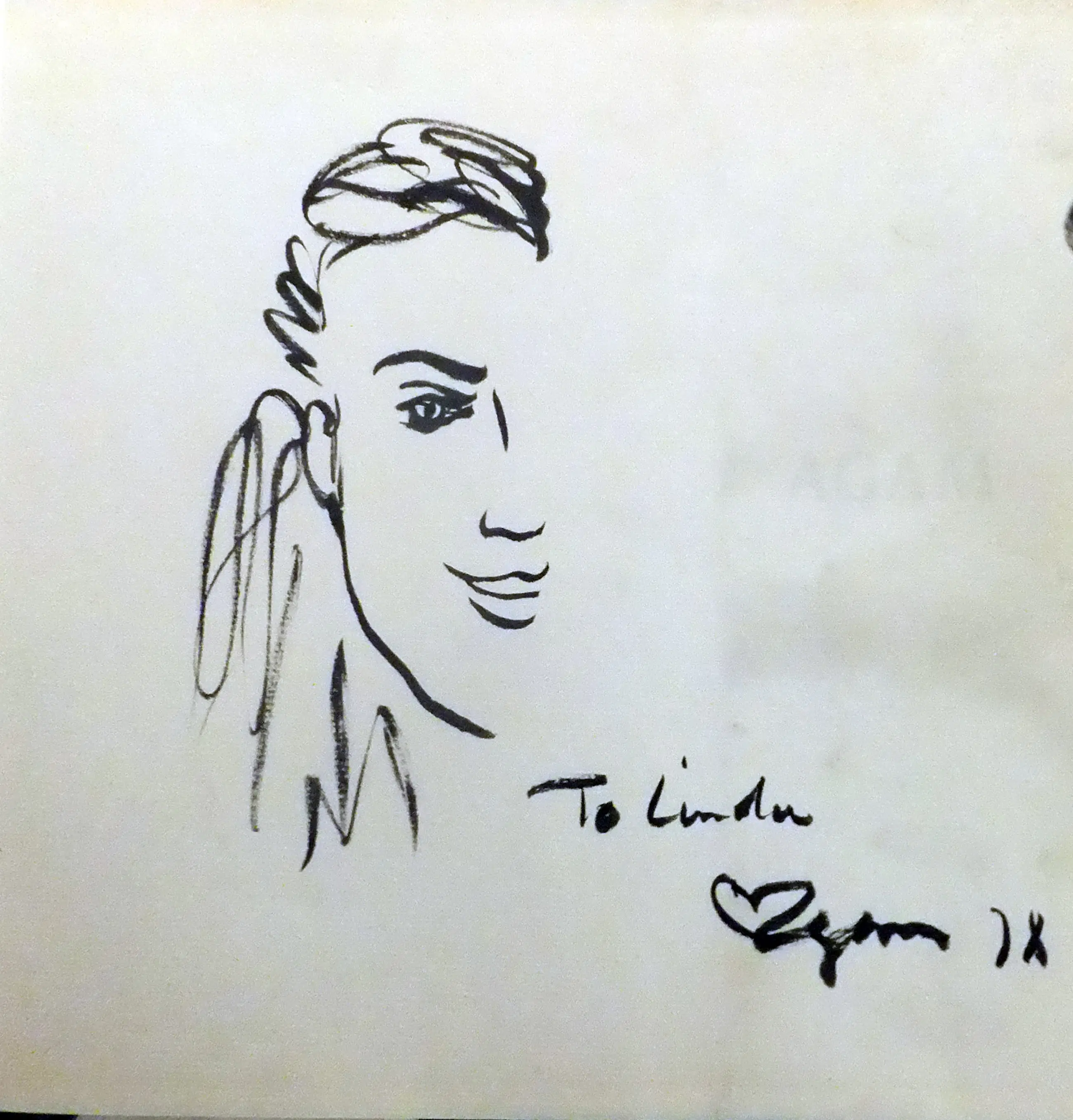 een tekening van een vrouwengezicht To Linda opgedragen en gesigneerd