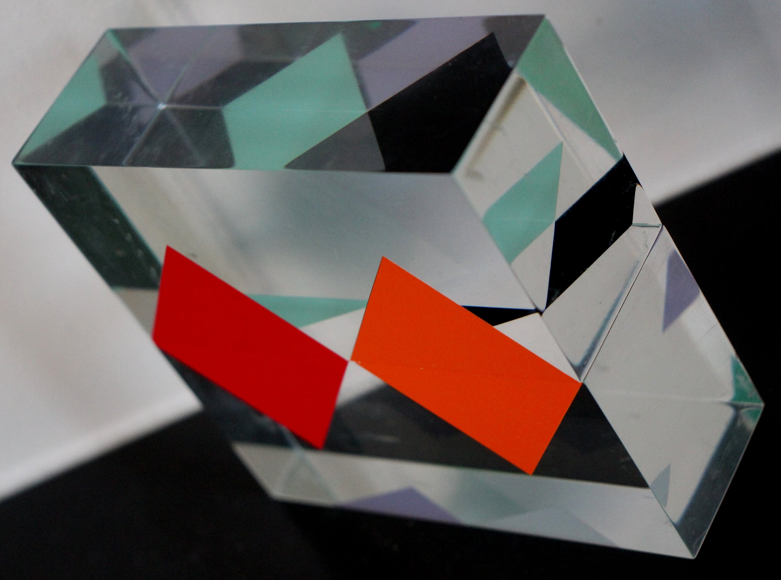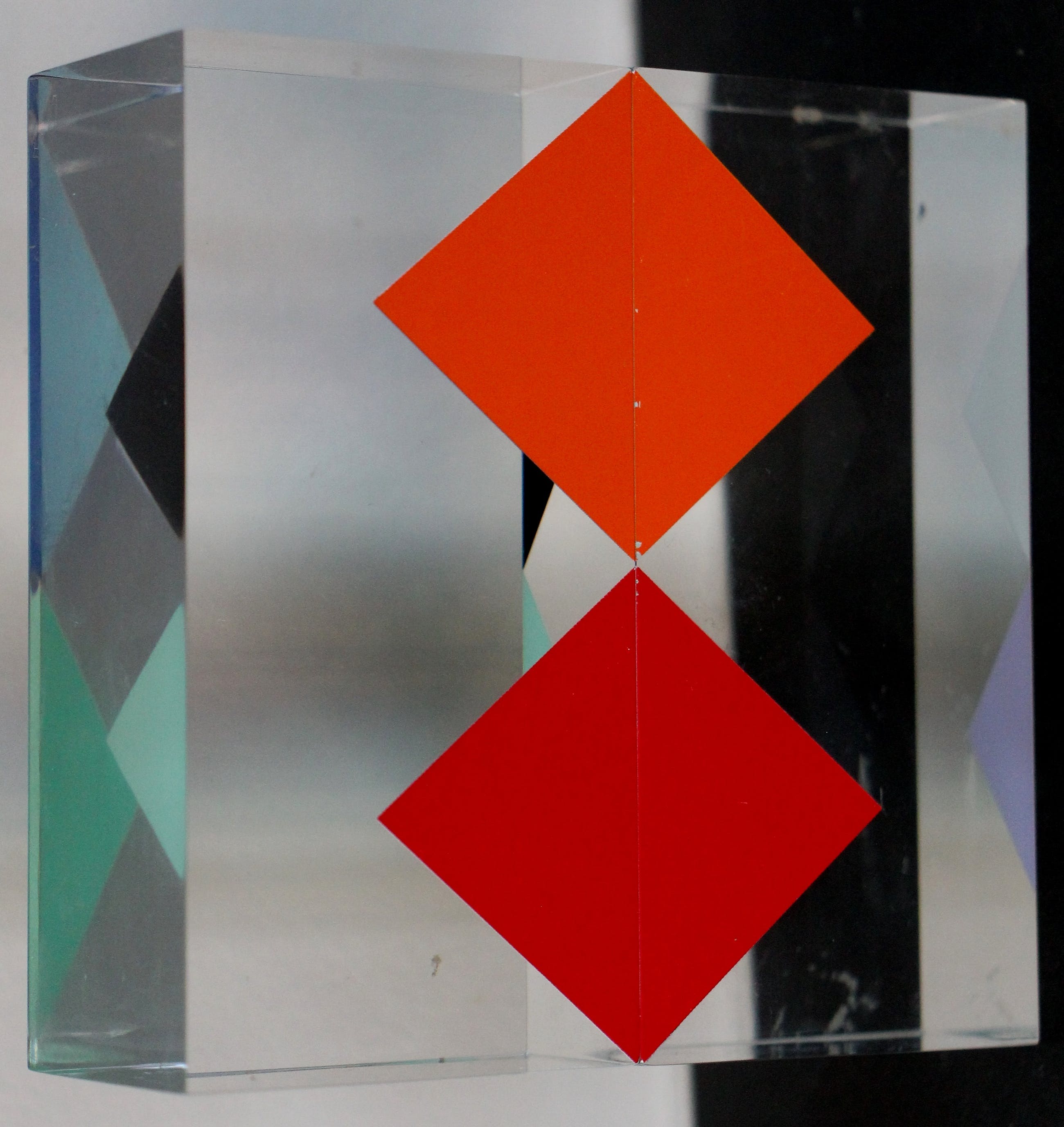 Sculptuur van plexiglas, van Yaacov Agam. Nummer: HC 5/11. Afmetingen werk: H10 x b10 x d3.4cm. Het werk is onderaan, gesigneerd door de kunstenaar. De authenticiteit van het aangeboden werk wordt volledig gegarandeerd. Een certificaat van echtheid kan, op aanvraag, worden gemaild.