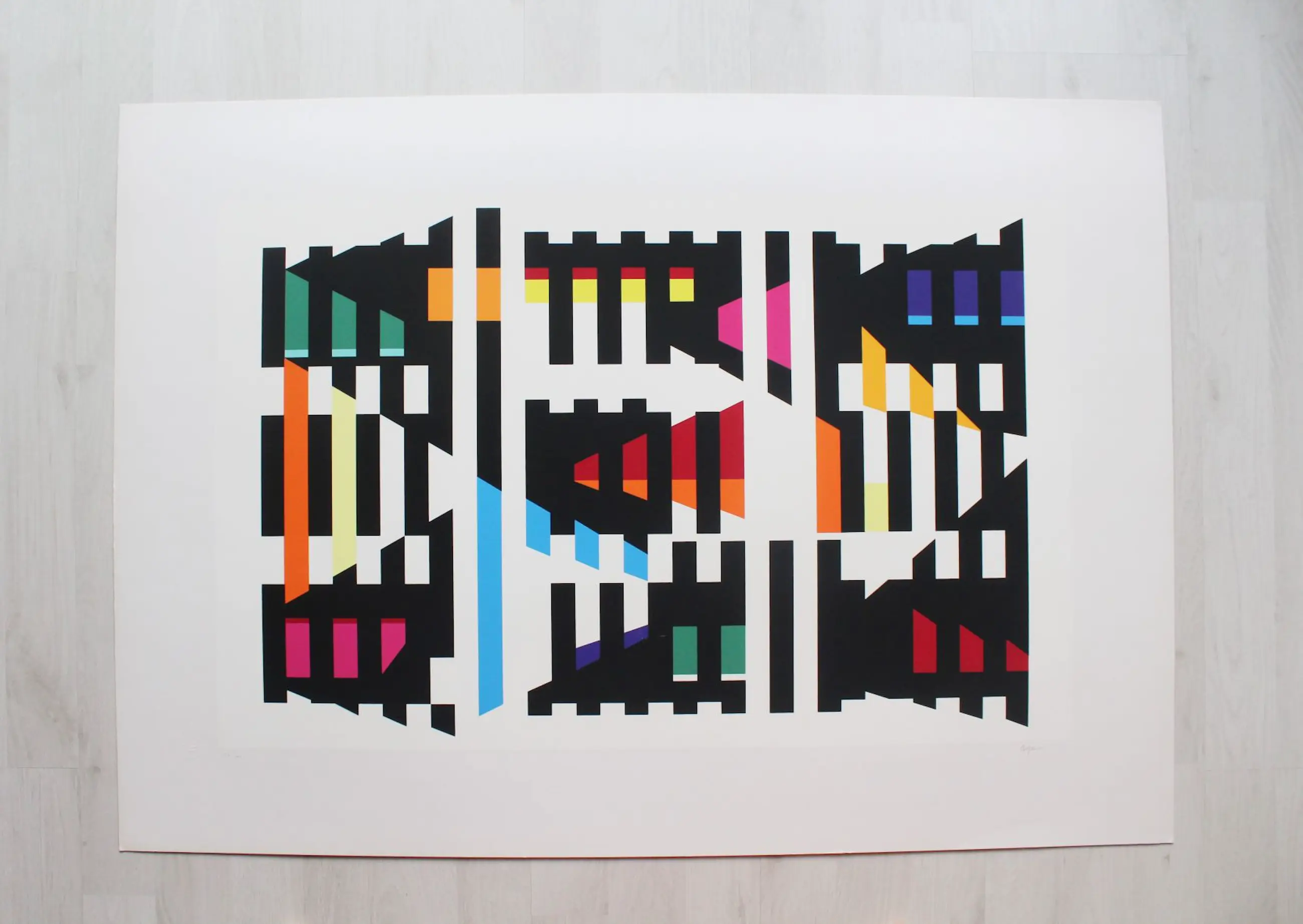 Exclusief werk van Yaacov Agam (*1928). Techniek: zeefdruk op karton. Titel: "HOMMAGE À GB" 1973. Gelimiteerde oplage van 200. Handgesigneerd en genummerd. Uitgegeven door Edition Denise René, Parijs. Heel goede staat.
