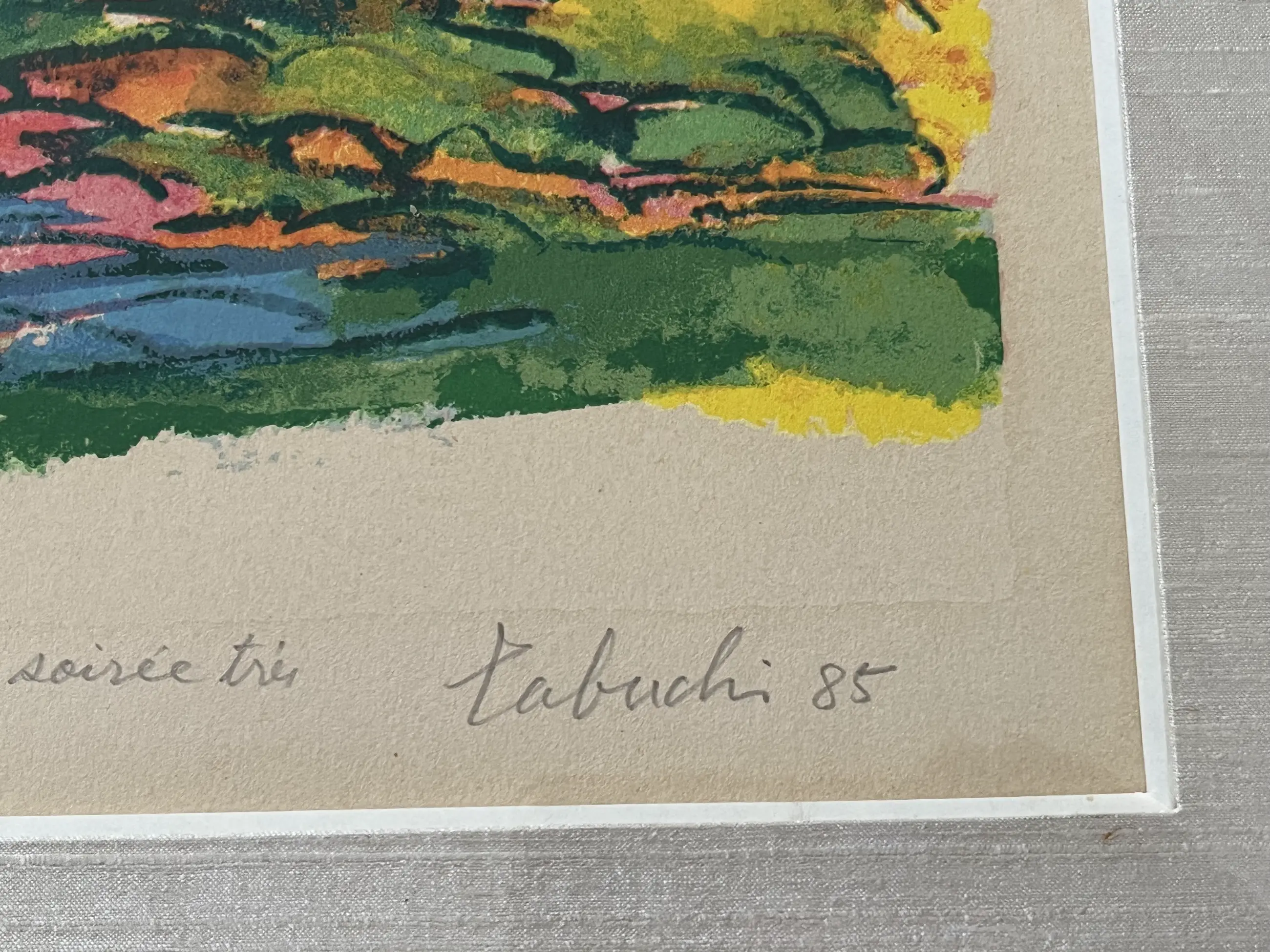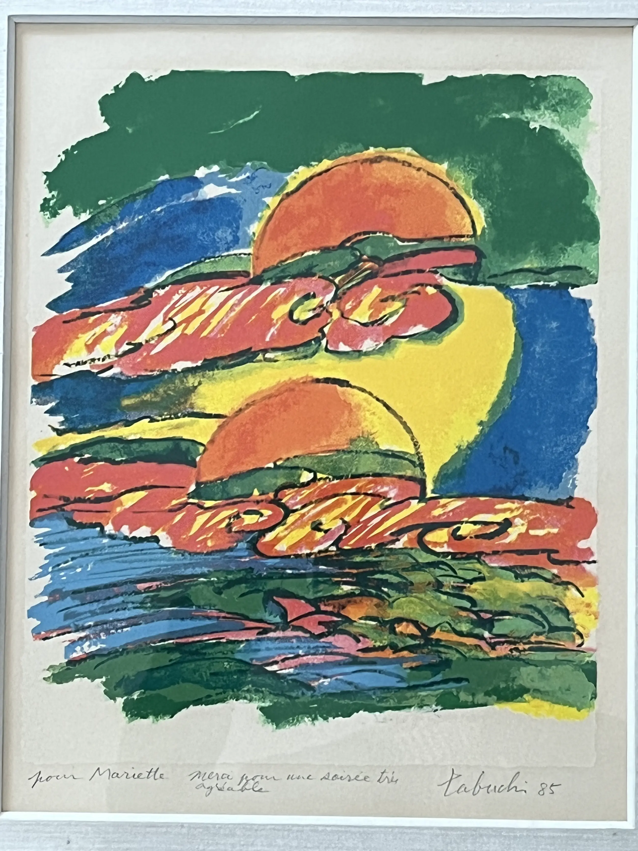 Karakteristiek werk uit 1985. Handgesigneerd met opdracht. Gelijst in goudkleurige lijst ( lichte gebruikssporen) Afmeting afbeelding 32 x 26,5 cm. Inclusief lijst. 54,5 x 46,5 cm.