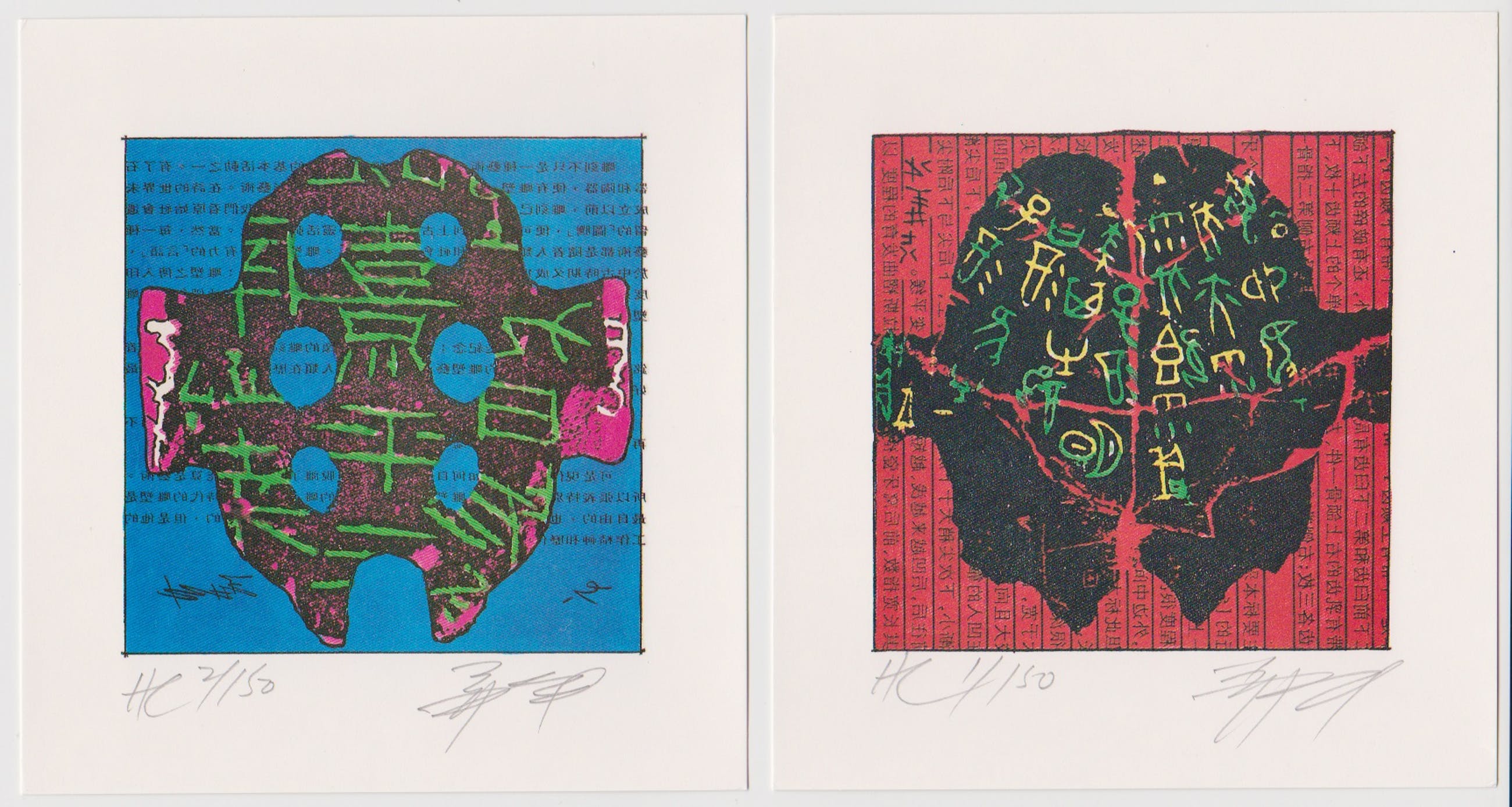 Twee fraaie handgesigneerde lithografien van Yee Cheung. Titels: Abstracte Composities I en II. Genummerd HC 1/150 en 2/150. Afmetingen: 15 x 14 cm.