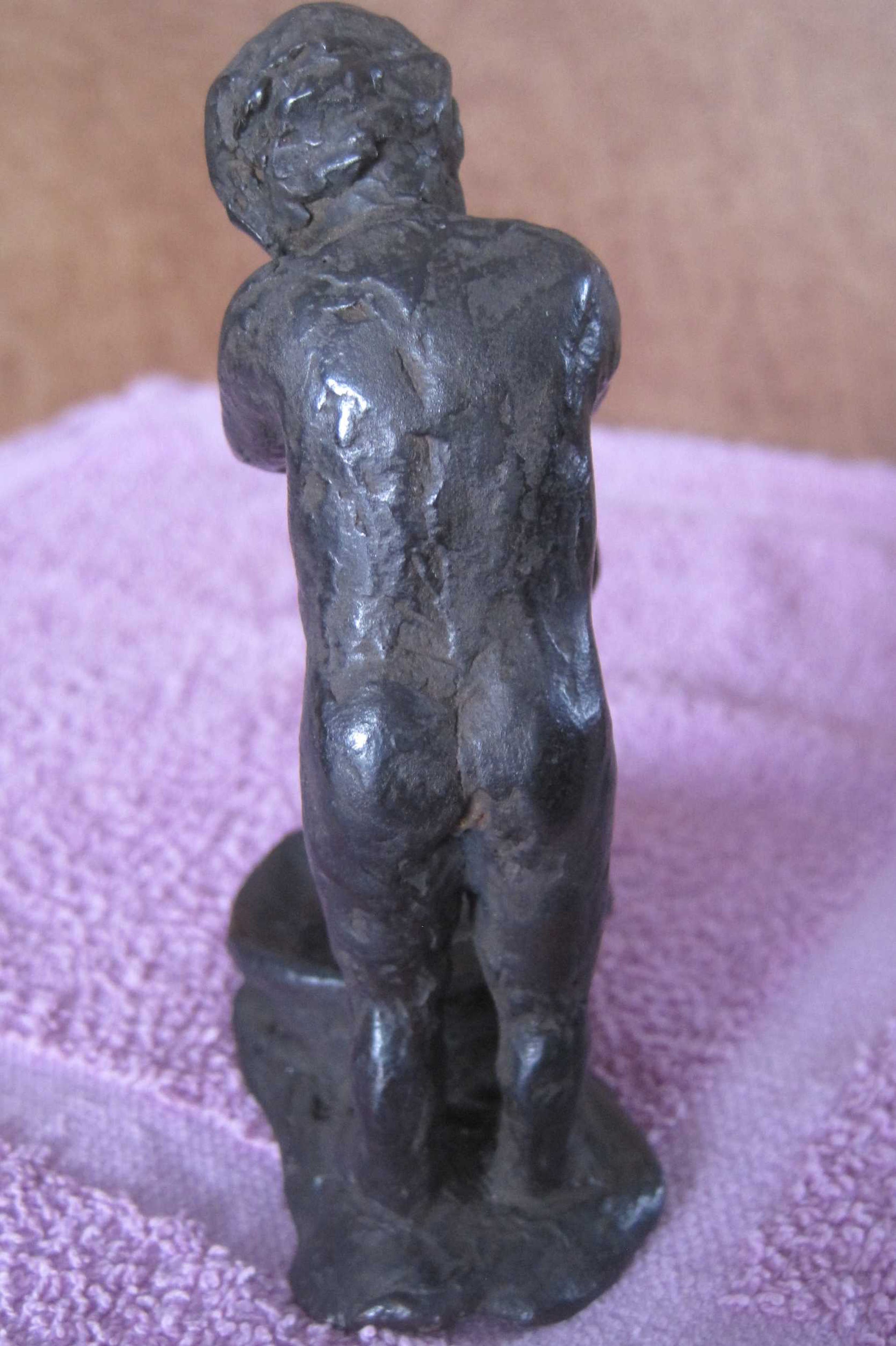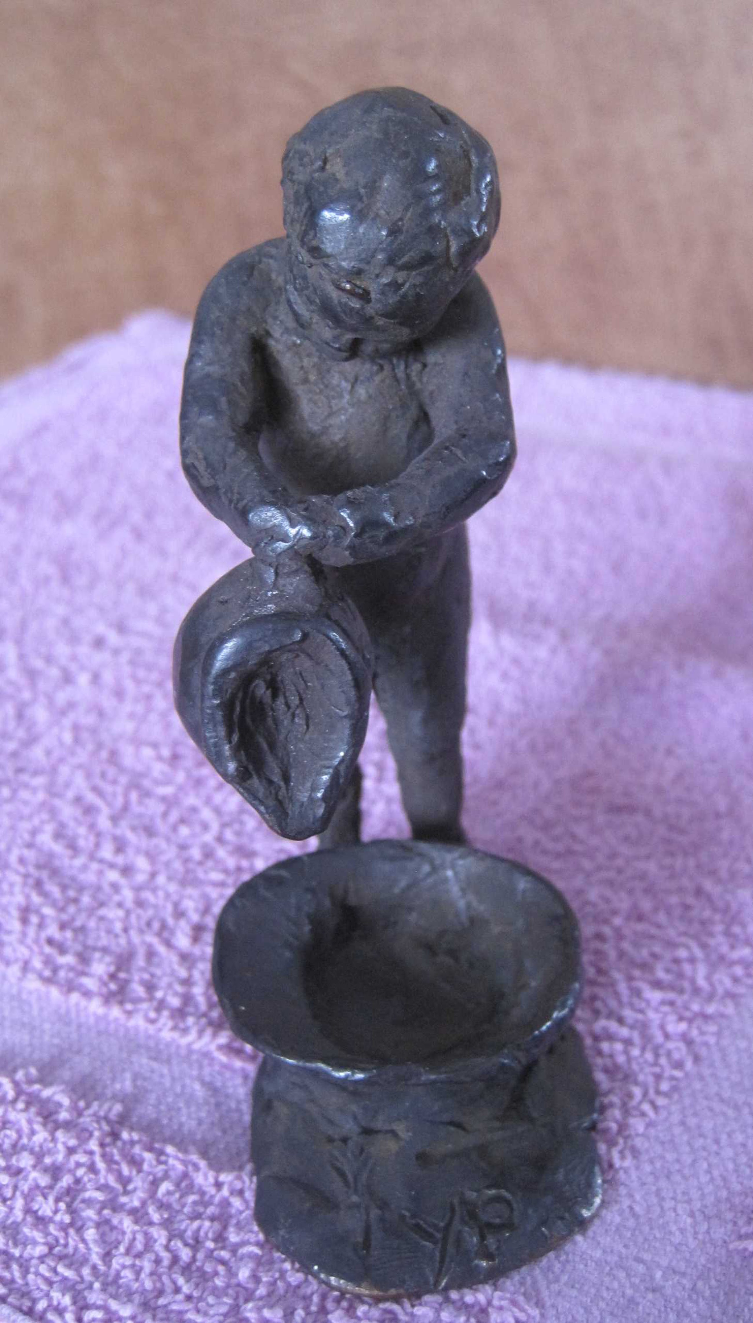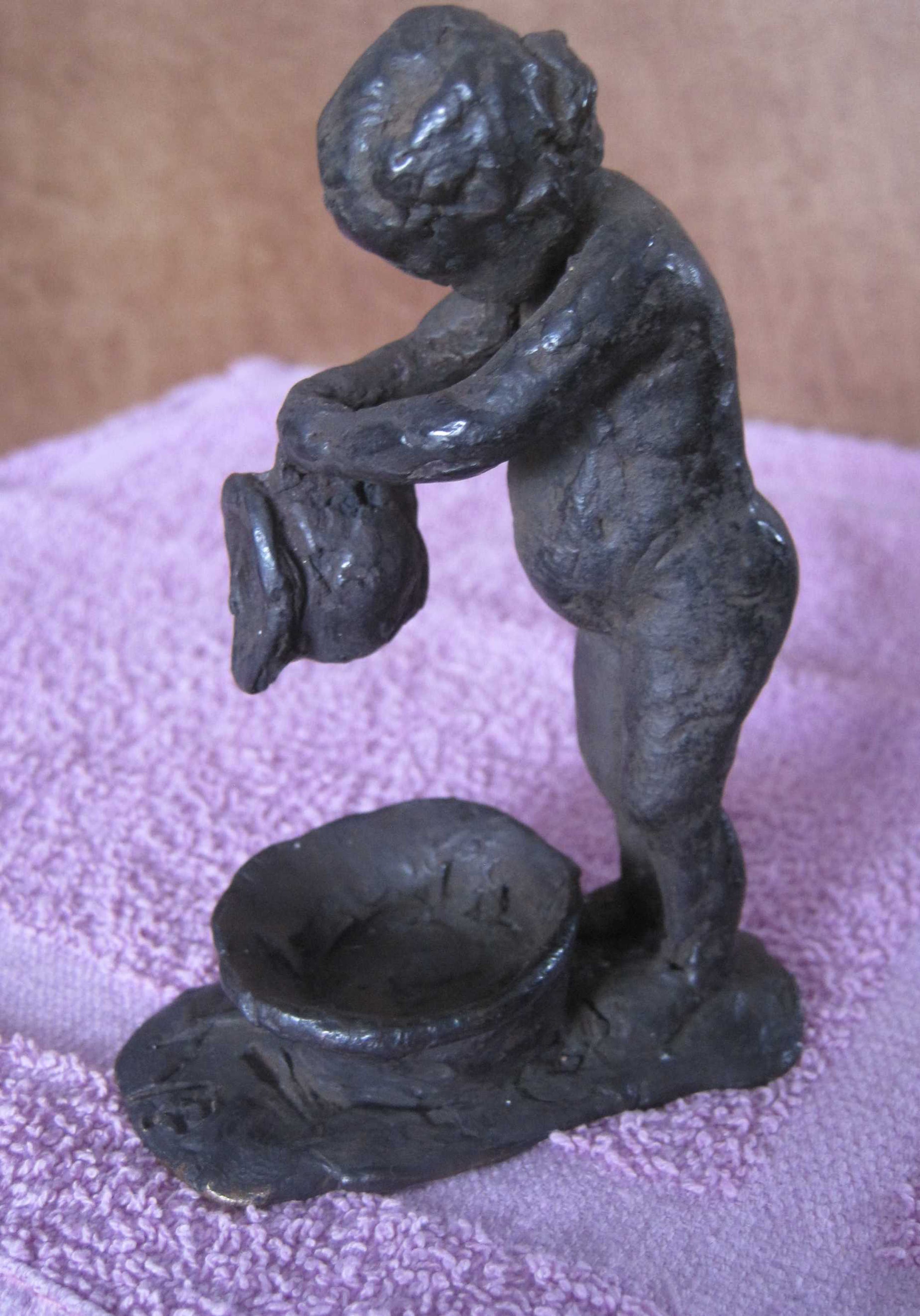 Heel lief bronzen beeldje van een kind wat met water aan het spelen is. Voor het formaat is het een zwaar beeldje: 420 gram.