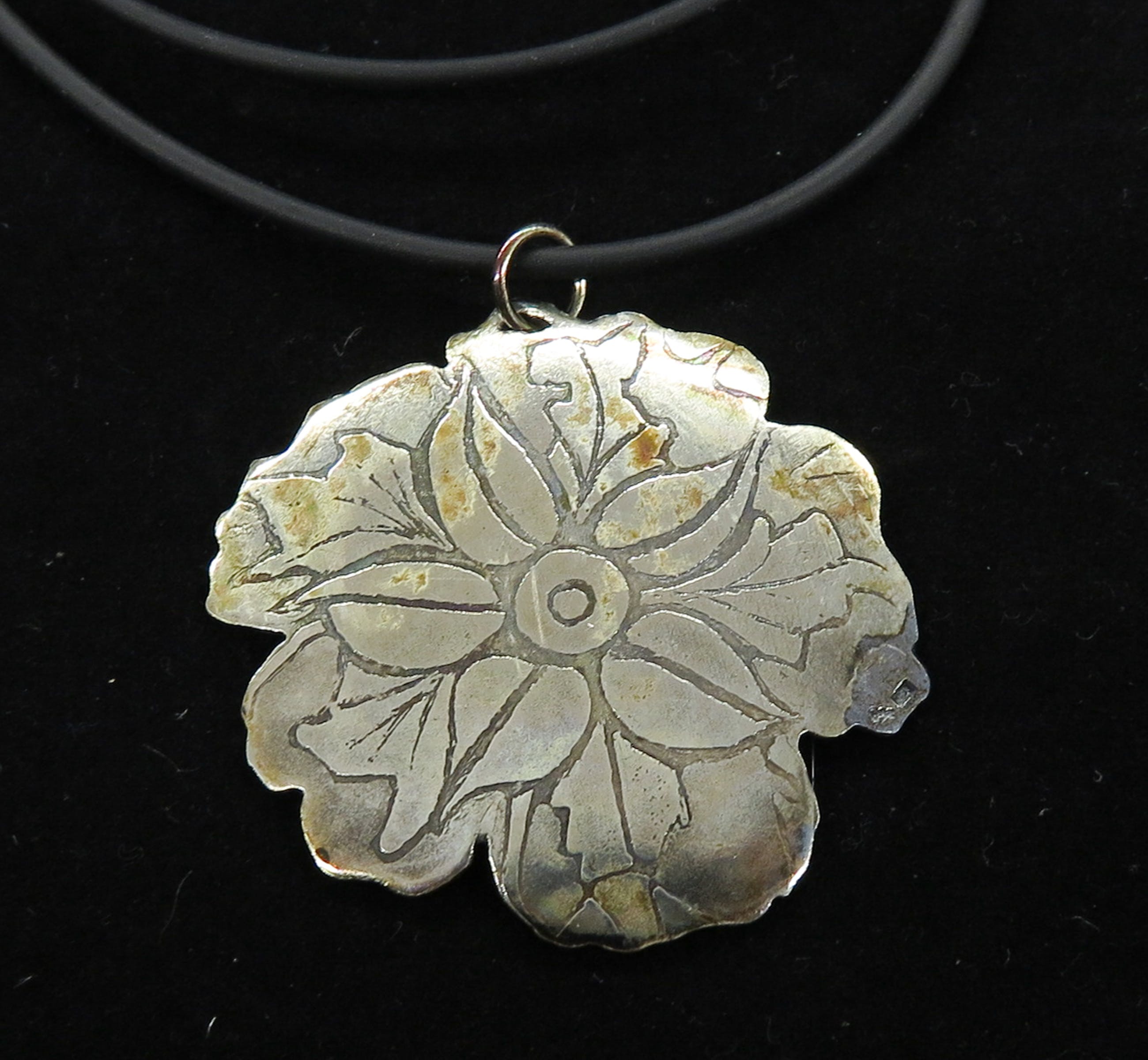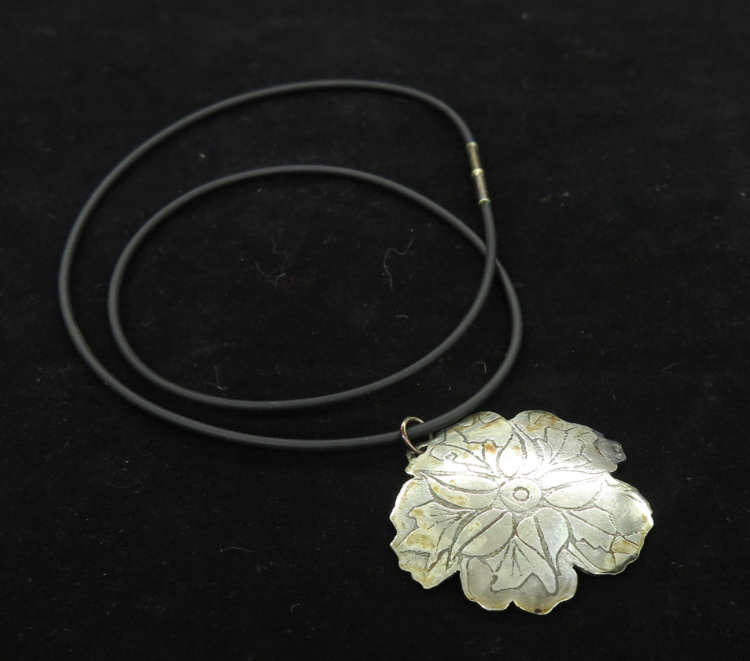 Zilveren hanger met met koord en zilveren sluiting, door Yoka Voorbach. De hanger is gemerkt (925), de sluiting is door ons getest.