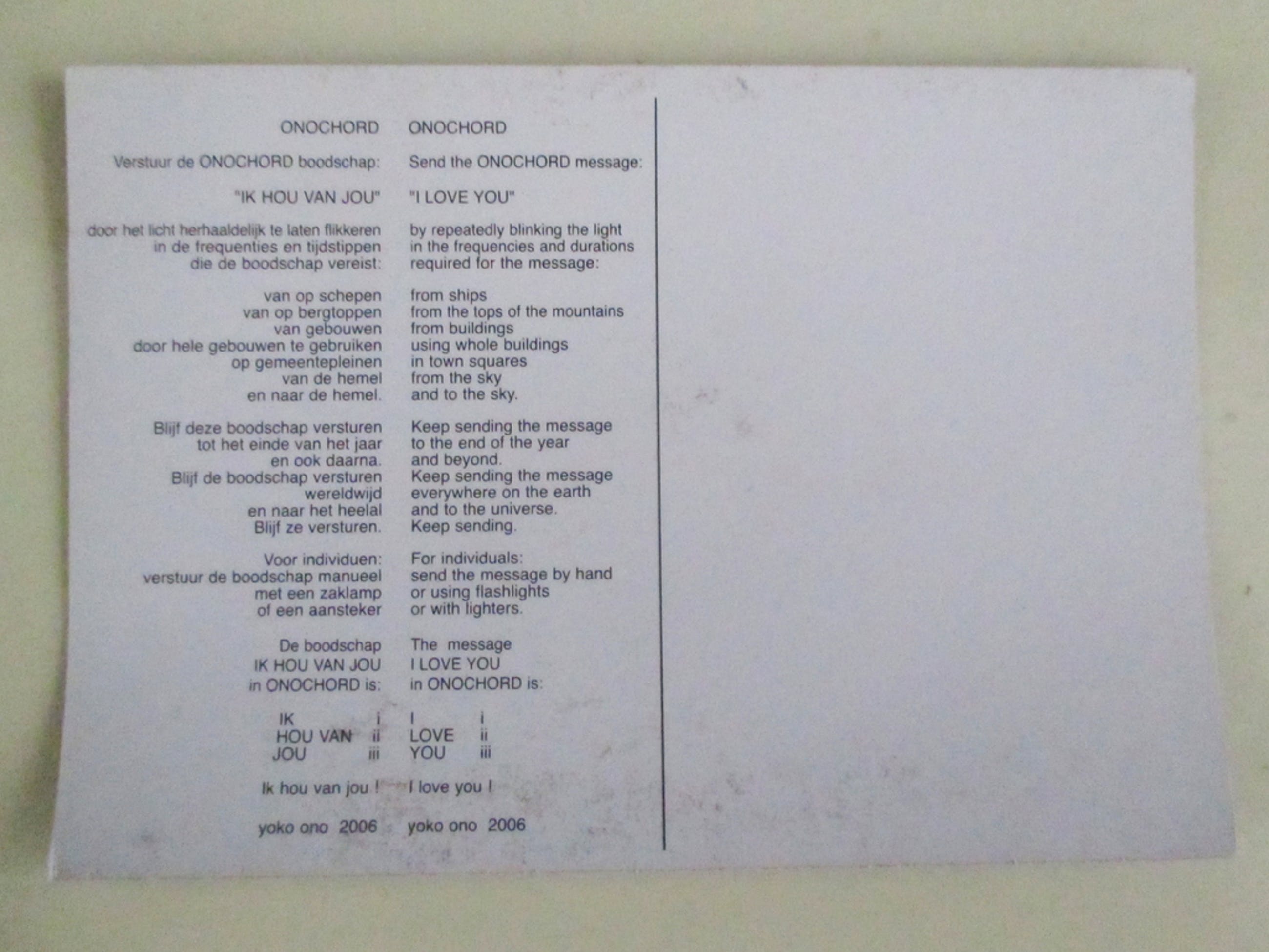 In juni 2006 kwan Yoko Ono naar Antwerpen om haar solo-tentoonstelling te openen in galerie M3.Het werk van Yoko Ono is zeer interactief. Ze nodigt de bezoekers uit om actief deel te nemen aan de kunstwerken Het werk ONOCHORD bestaat uit een lampje en een instructiekaart waarmee ze je uitnodigt de boodschap 'I love you/Ik hou van jou' te versturen via lichtsignalen. Dit werk sluit aan bij Yoko's Grote Hoop: imagine ,,dat iedereen zich plots realiseert dat het zonder geweld kan''.