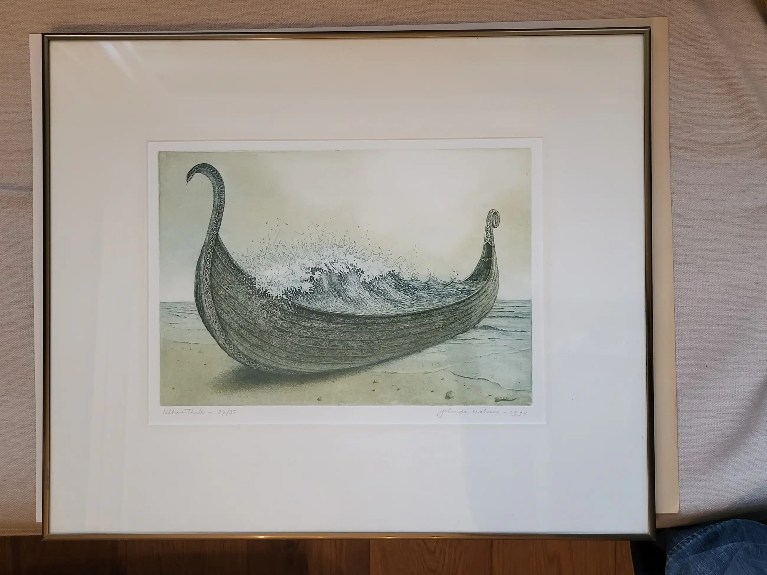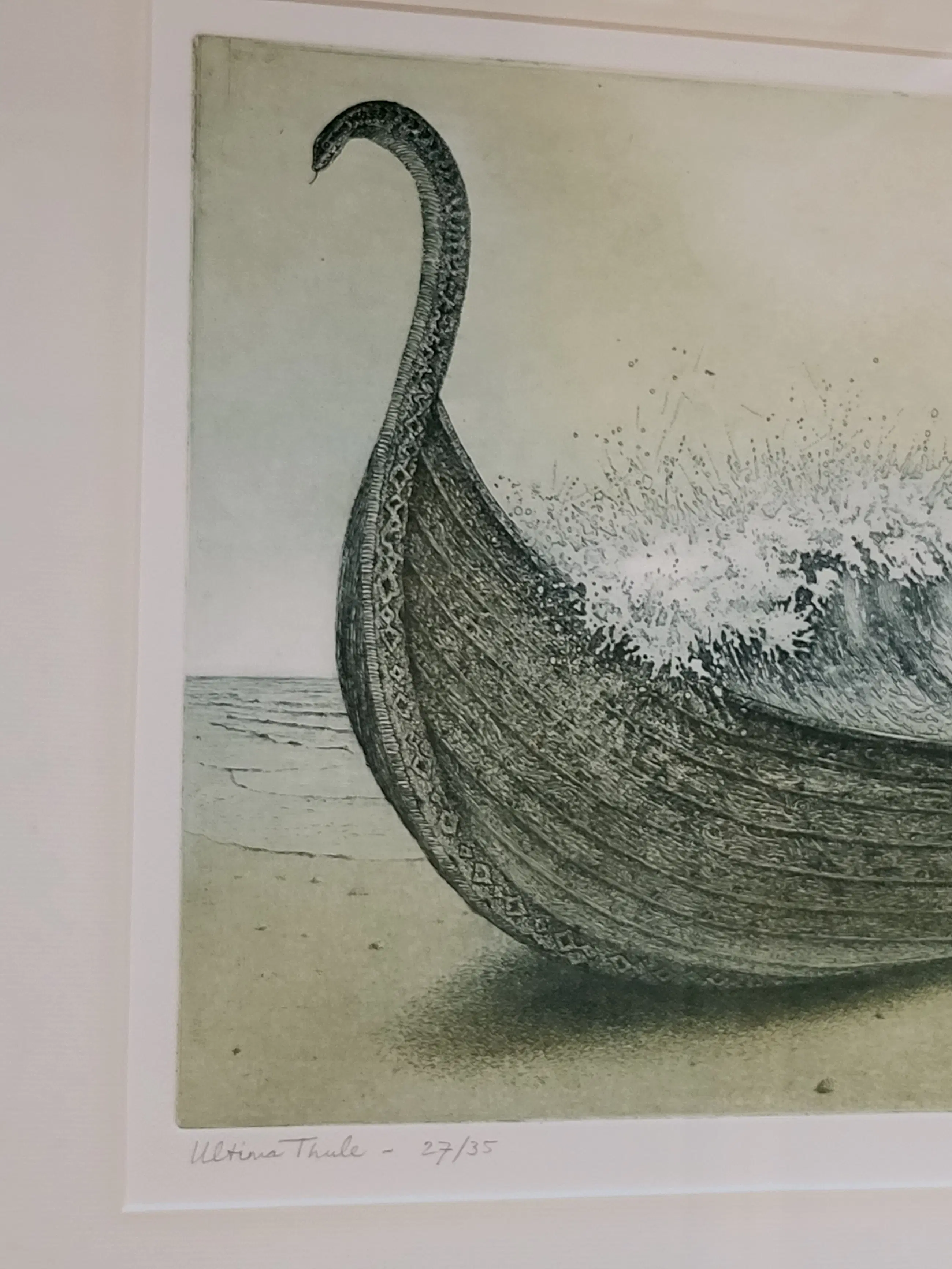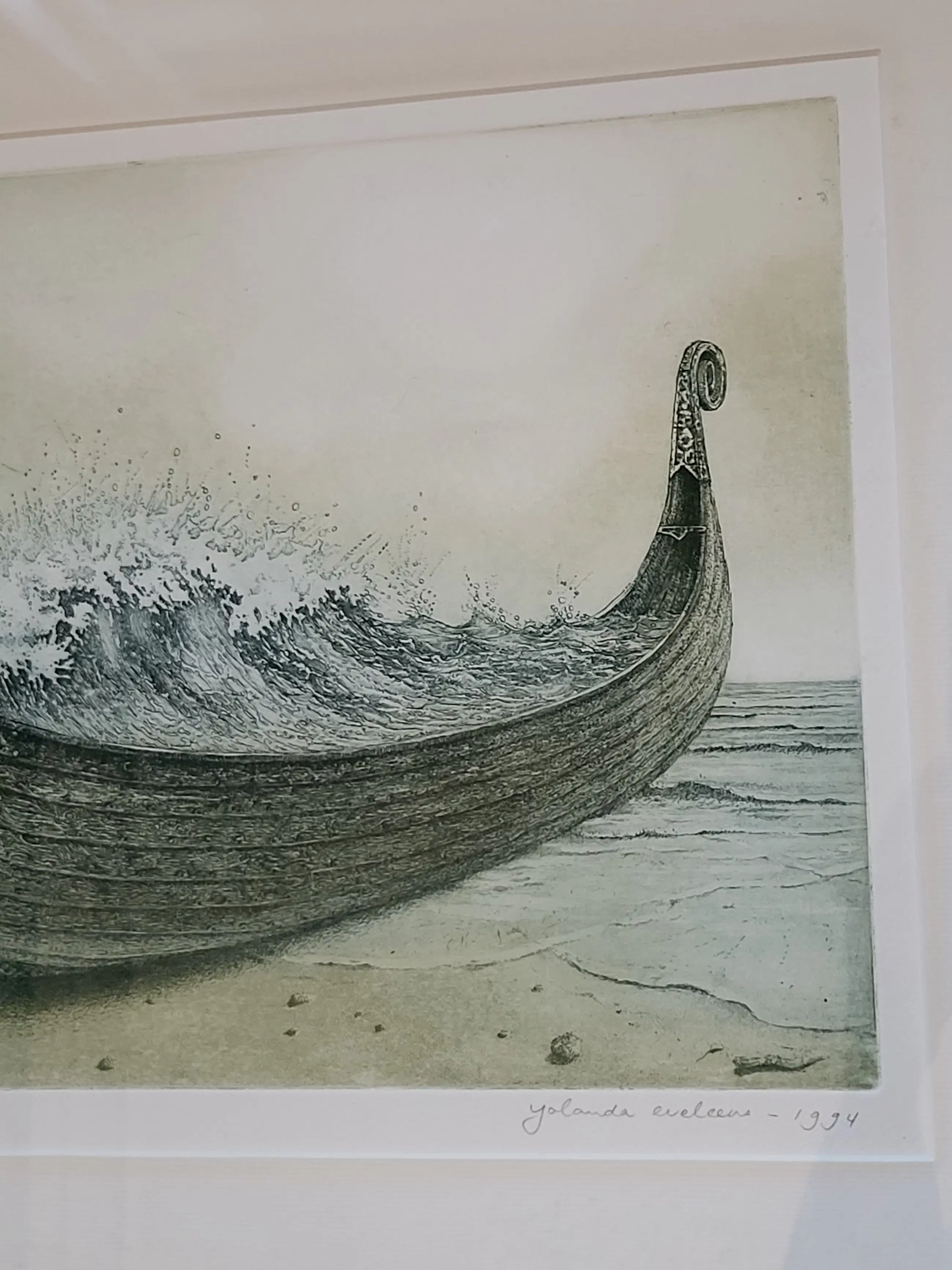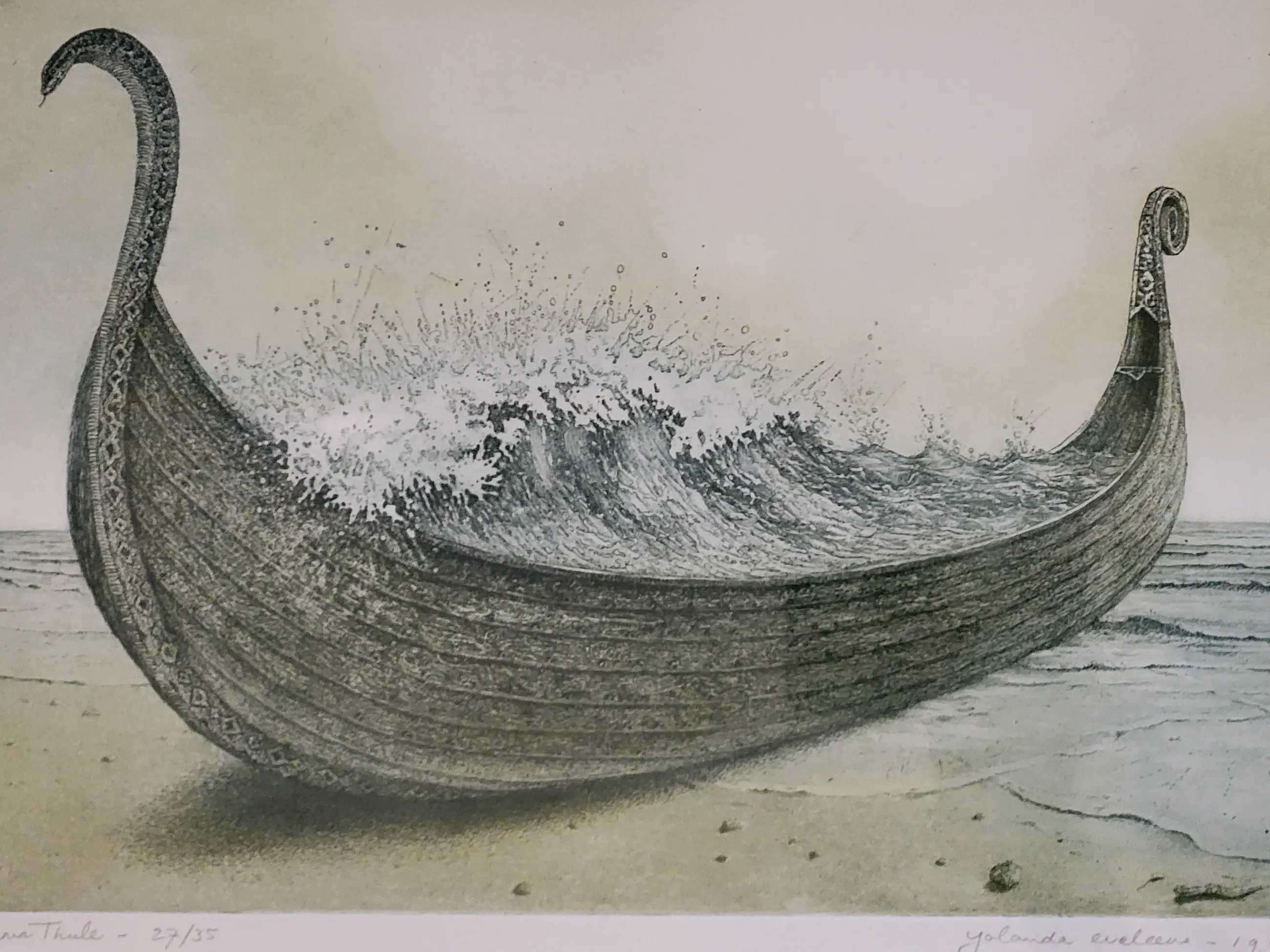 'Aan het ‘einde van de wereld’ gestrand Vikingschip dat zelf drager is van turbulent water.'