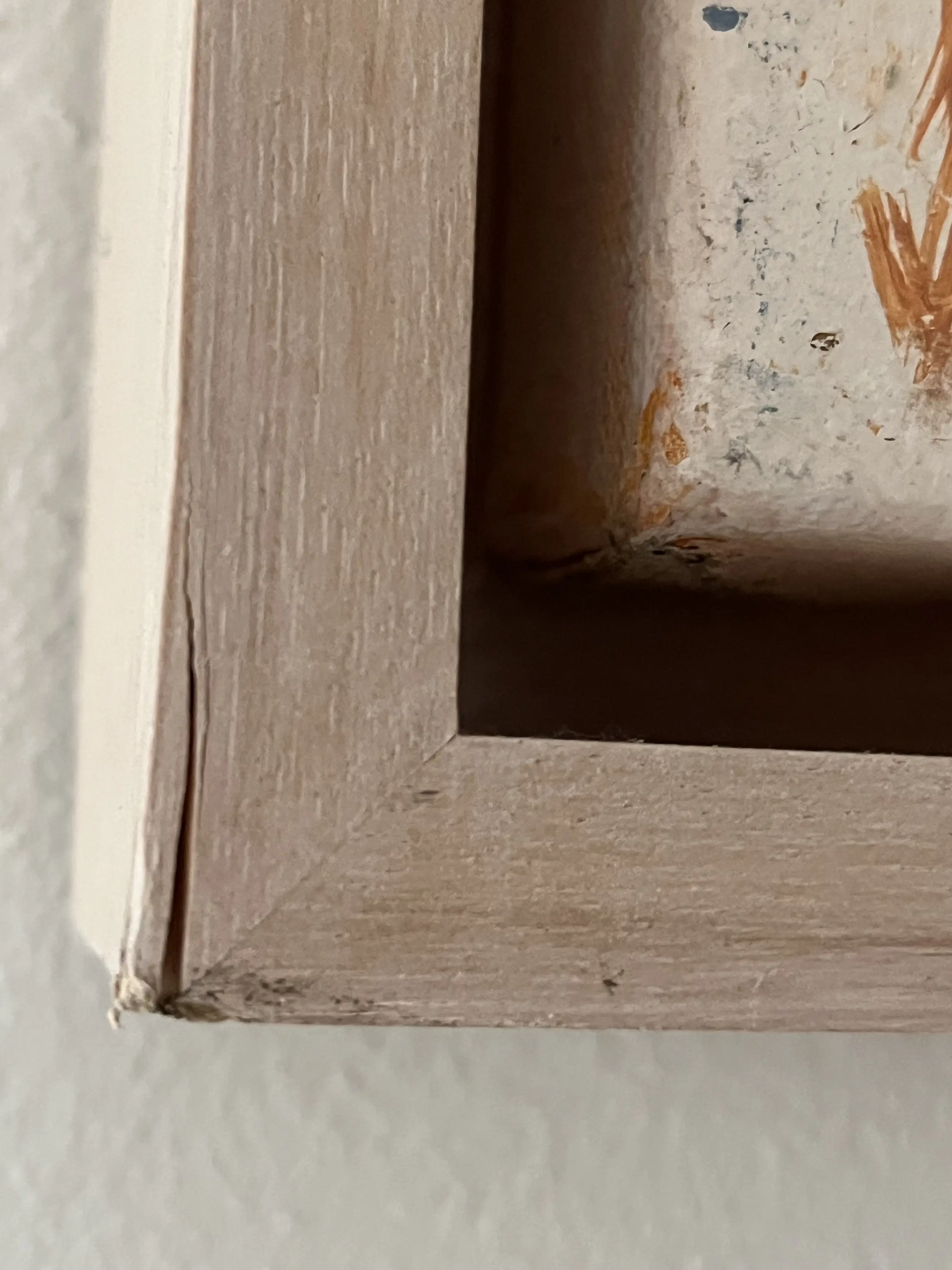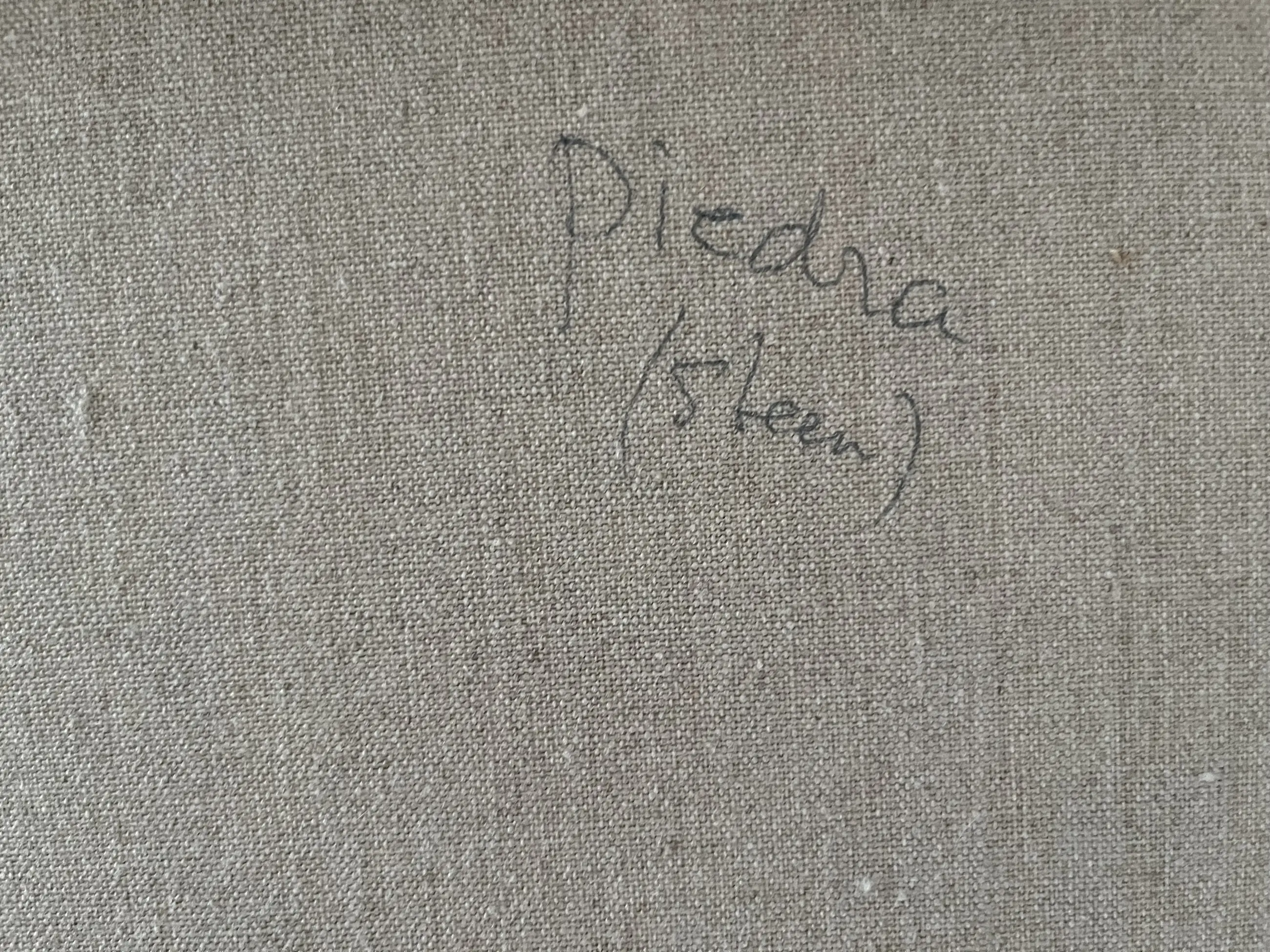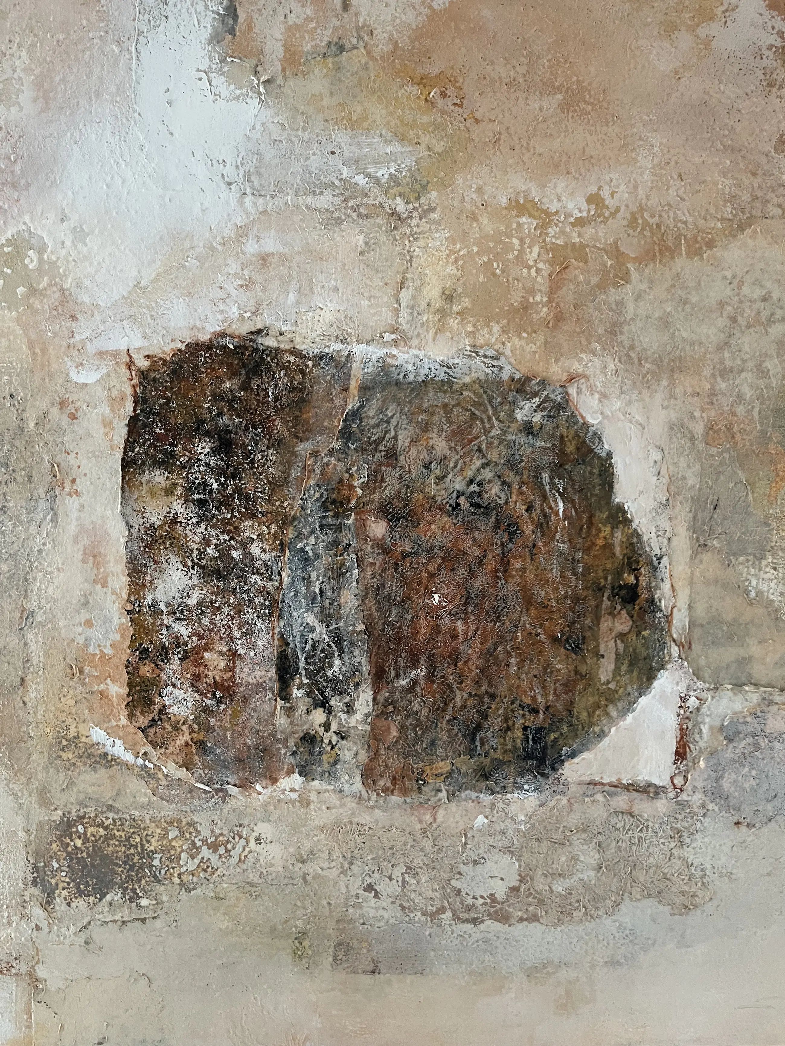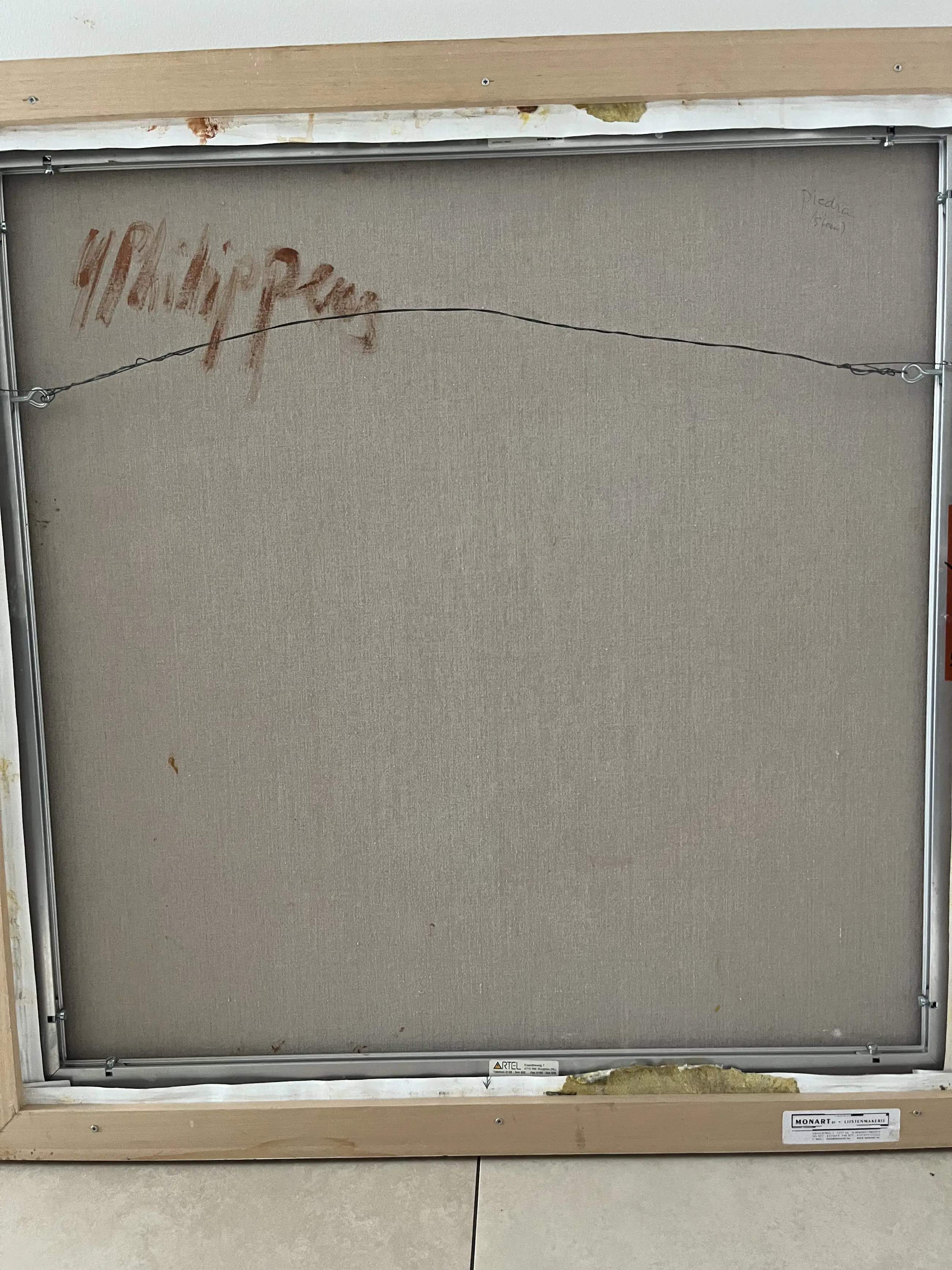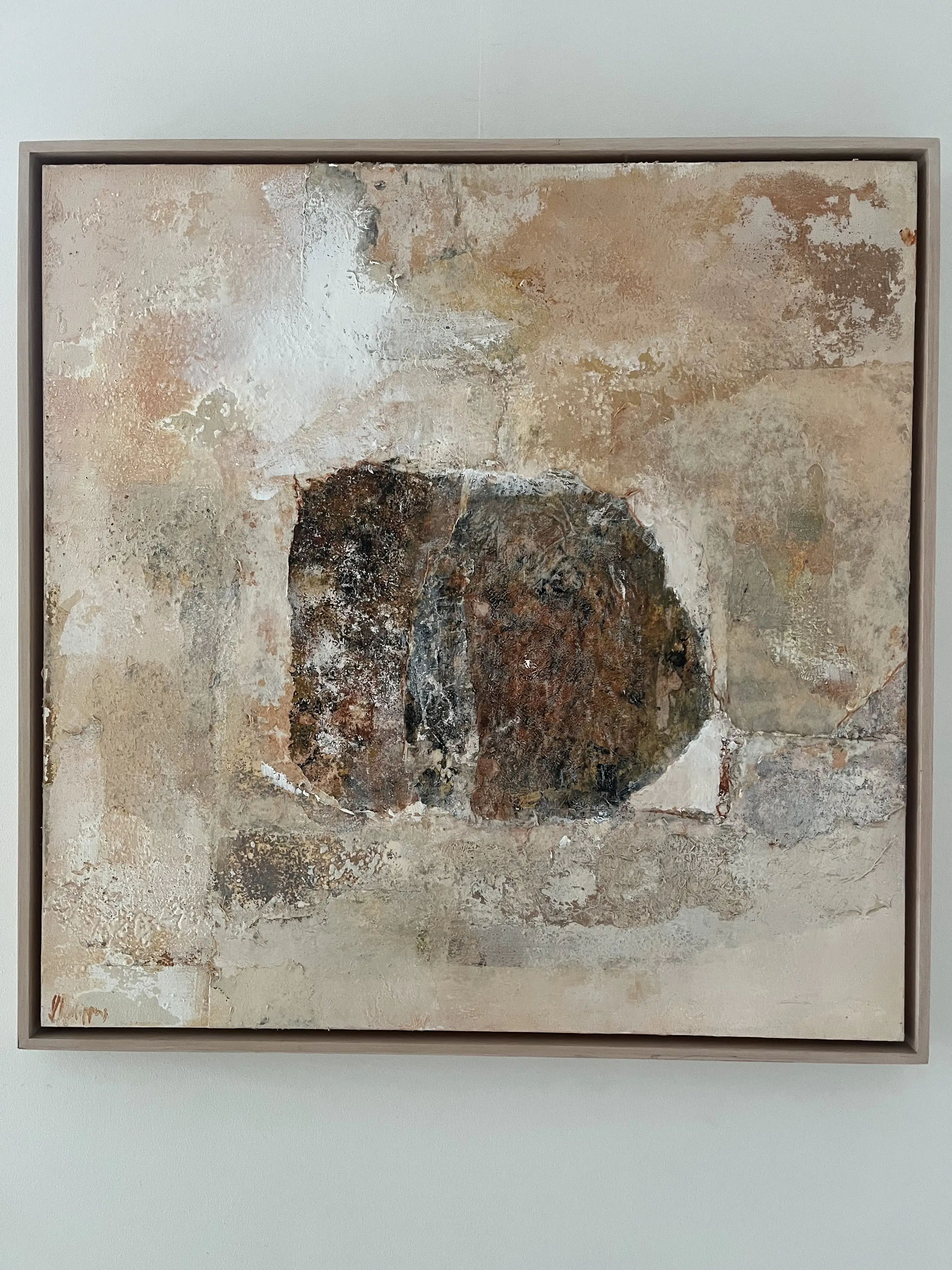 Gemengde techniek op doek. Gelijst in witgewassen houten baklijst. Baklijst heeft in rechterhoek een kleine imperfectie welke te herstellen is. Door het gebruik van aardse kleuren kan het schilderij in zowel een moderne als een klassieke inrichting. Afmeting doek 100 x 100 cm. Inclusief baklijst 105 x 105 cm.