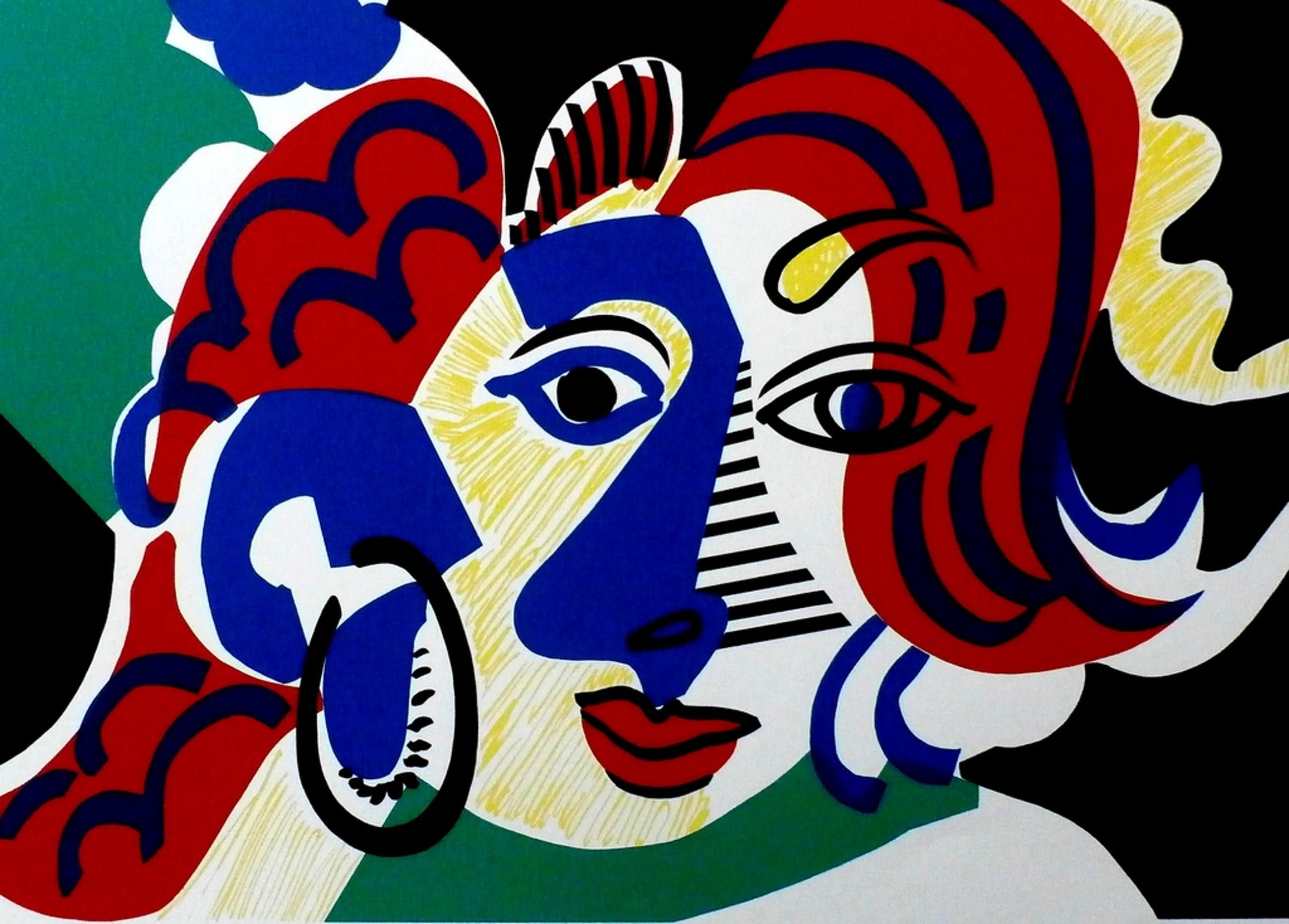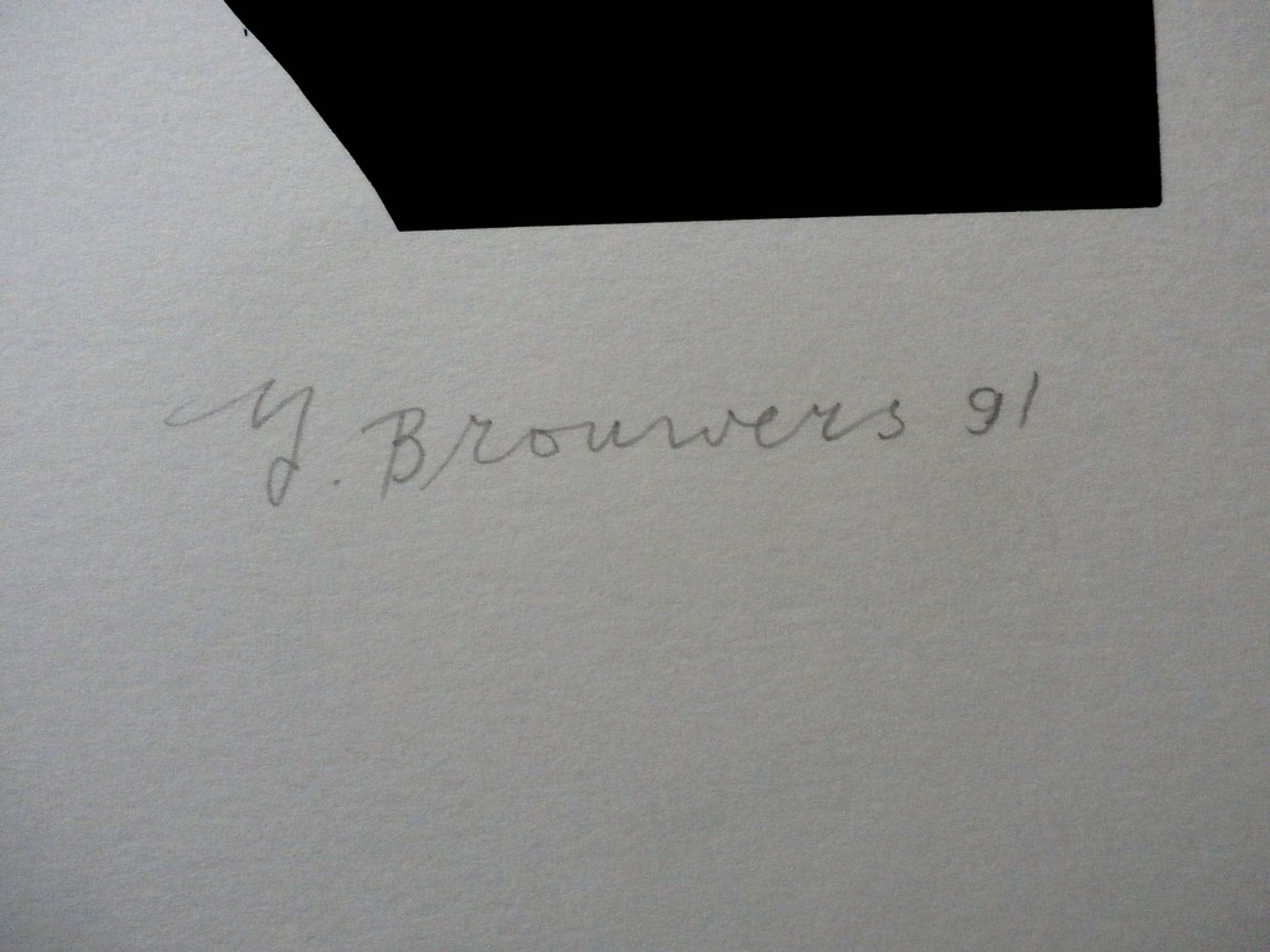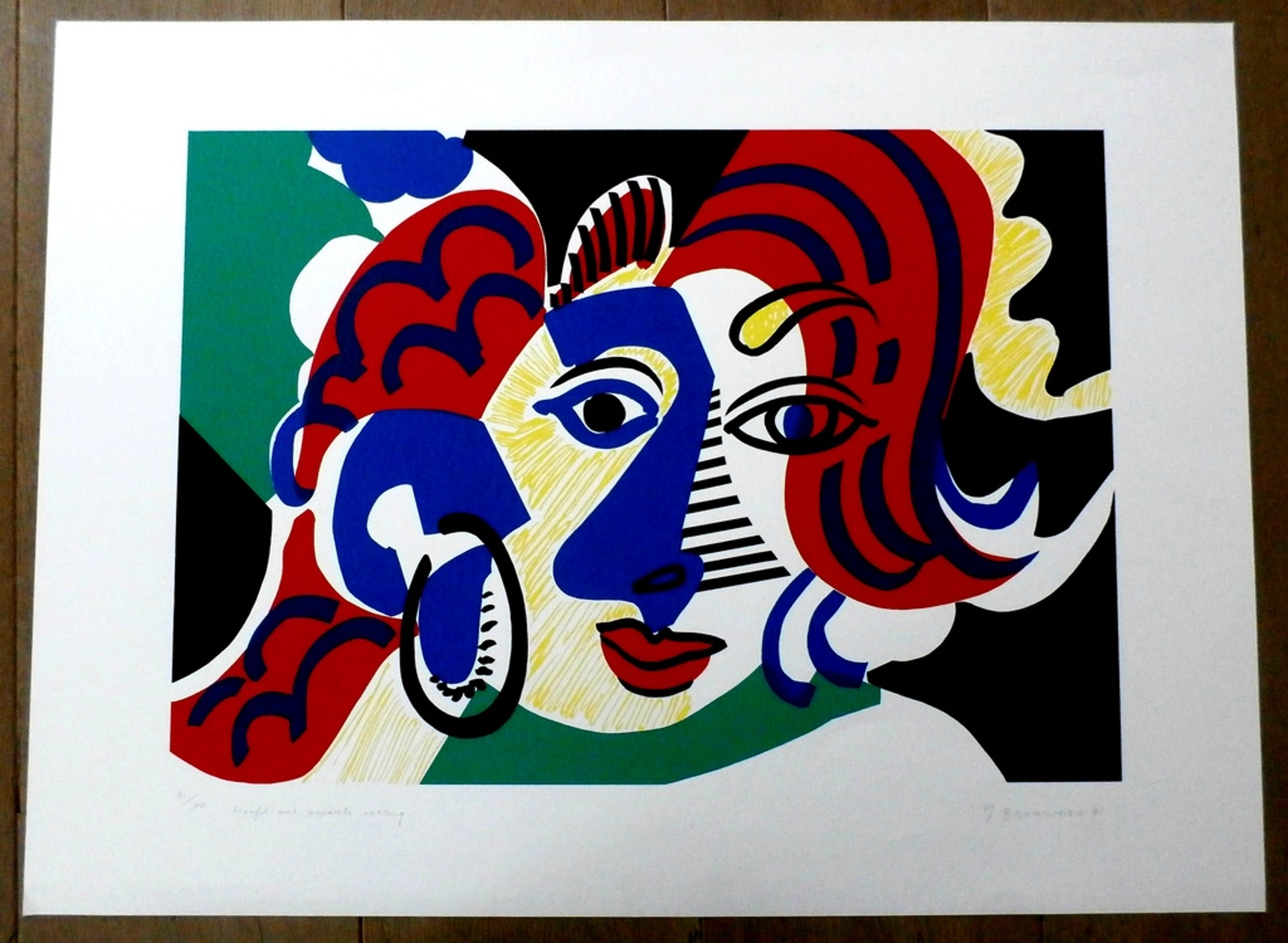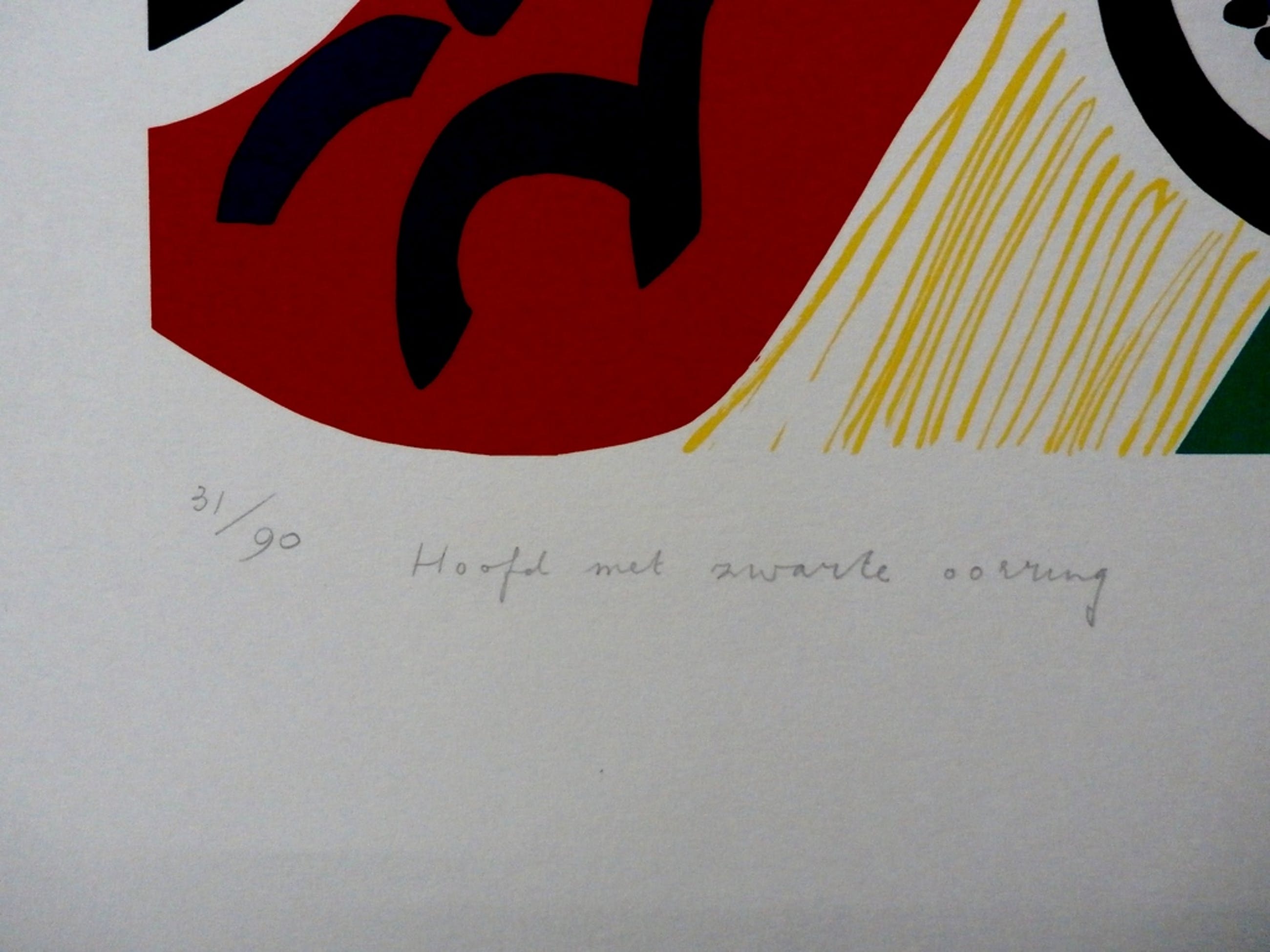 Kleurrijke Zeefdruk van Yolande Brouwers uit 1991.Titel: Hoofd met zwarte oorring. Nummer: 31/90. Afmetingen blad: H60 x b80 cm. Afmetingen voorstelling: H44 x b62 cm. Conditie: in goede staat. De authenciteit van het, aangeboden, werk wordt volledig garandeerd. Een certificaat van echtheid kan, op aanvraag, worden meegestuurd.