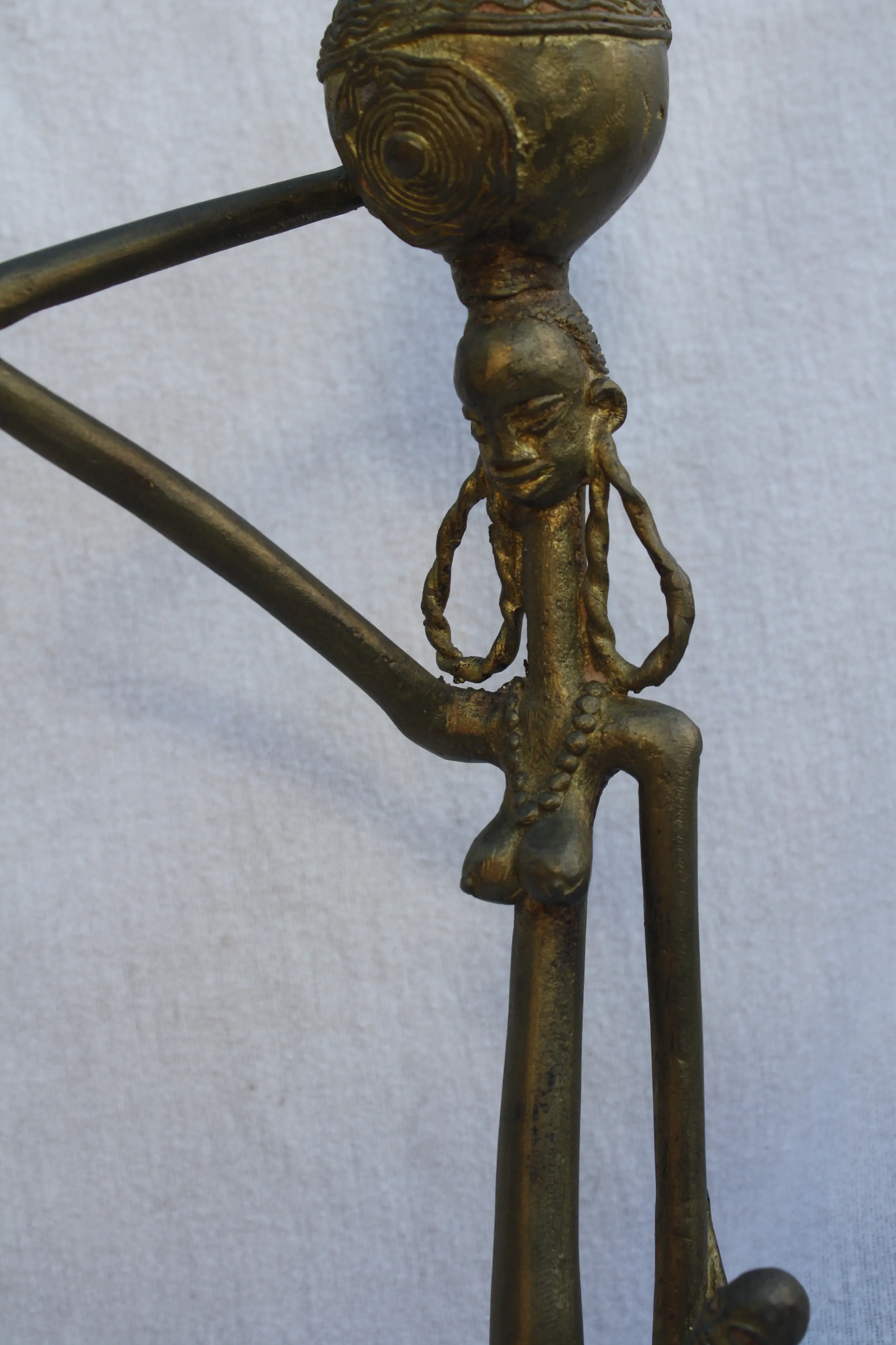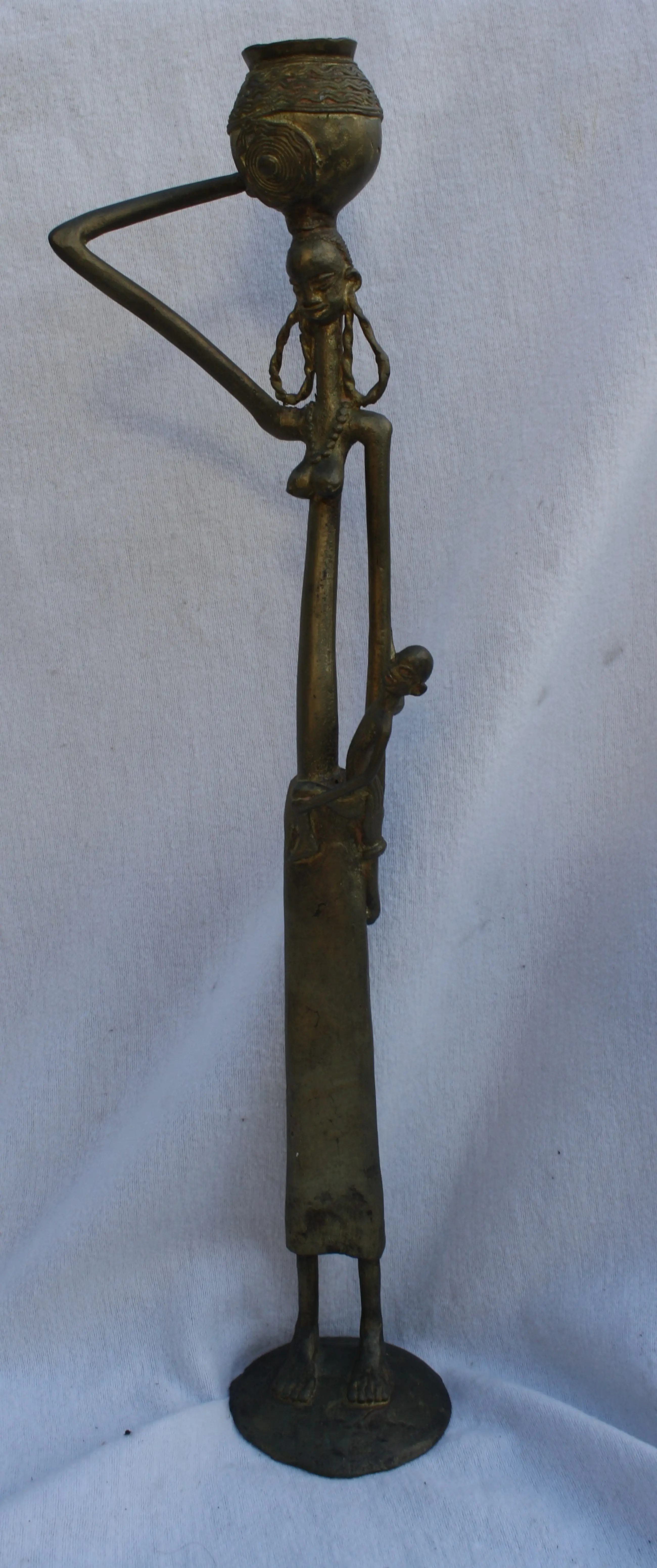 Grote Bronzen Vuur Vergulde Peuhl verloren wassen beeld uit Ouagadougou Burkina Faso Sculptuur van Gitane Peuhl die melk verkoopt Standbeeld van een staande vrouw met een melk kalebas op haar hoofd en kind op de arm.