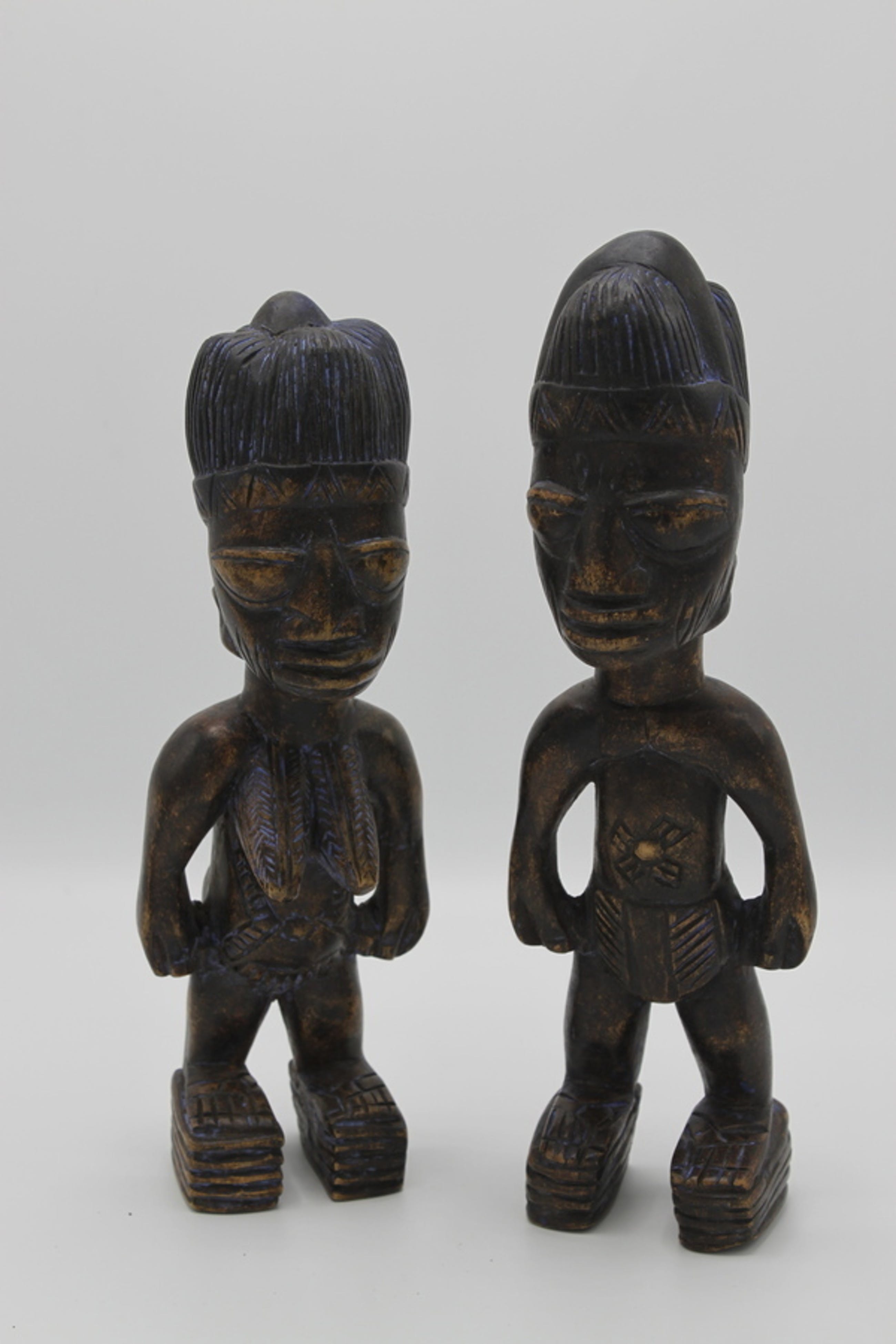 In de traditionele cultuur wordt geloofd dat tweelingen over bepaalde spirituele gaven en zelfs magische krachten zouden beschikken. In de Yoruba religie staat de representatie van de tweeling bekend als ‘Ibeji’. Onder deze naam staan deze beelden dan ook bekend bij liefhebbers van etnografica. Vaak worden de beelden separaat verkocht, deze 2 zijn bijpassend en worden samen aangeboden.