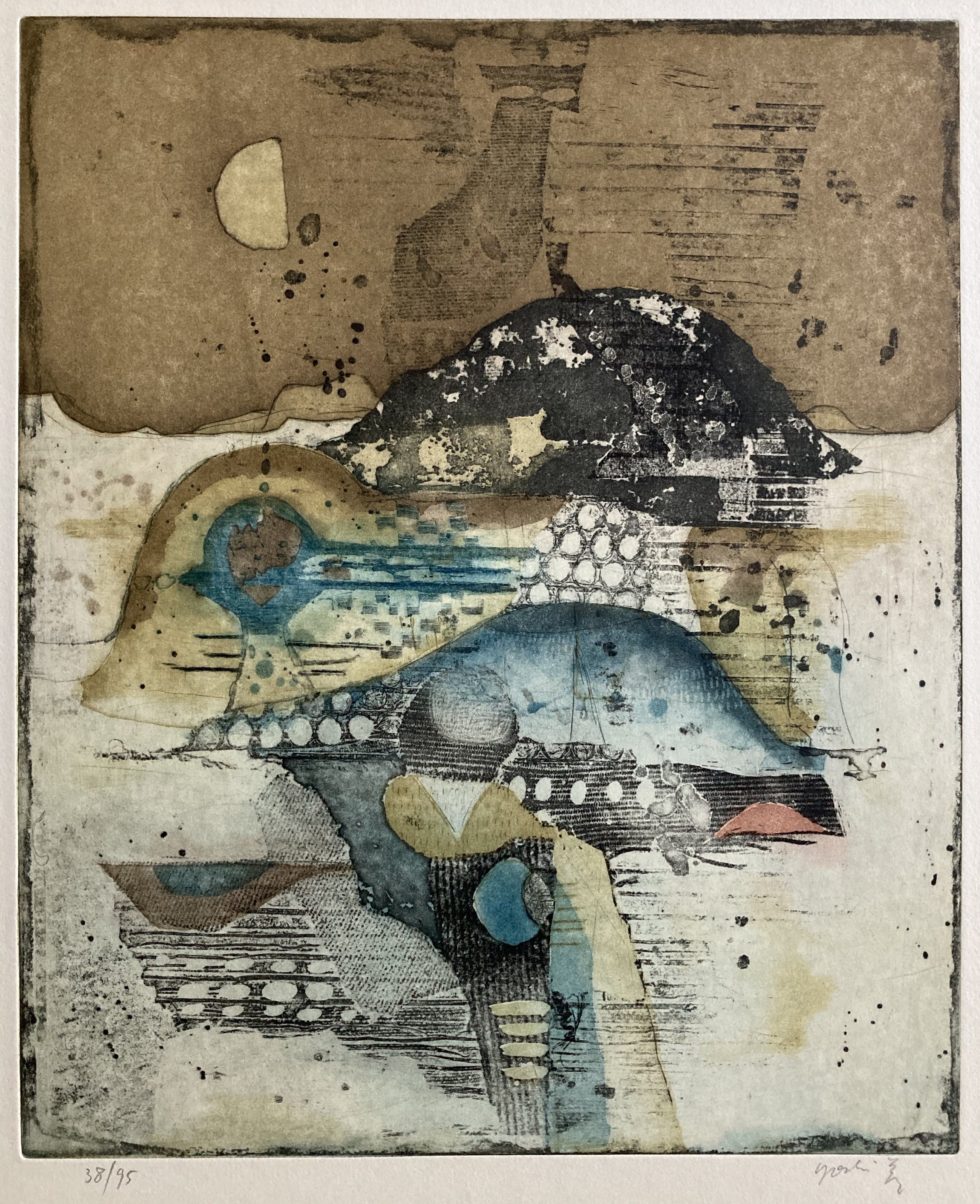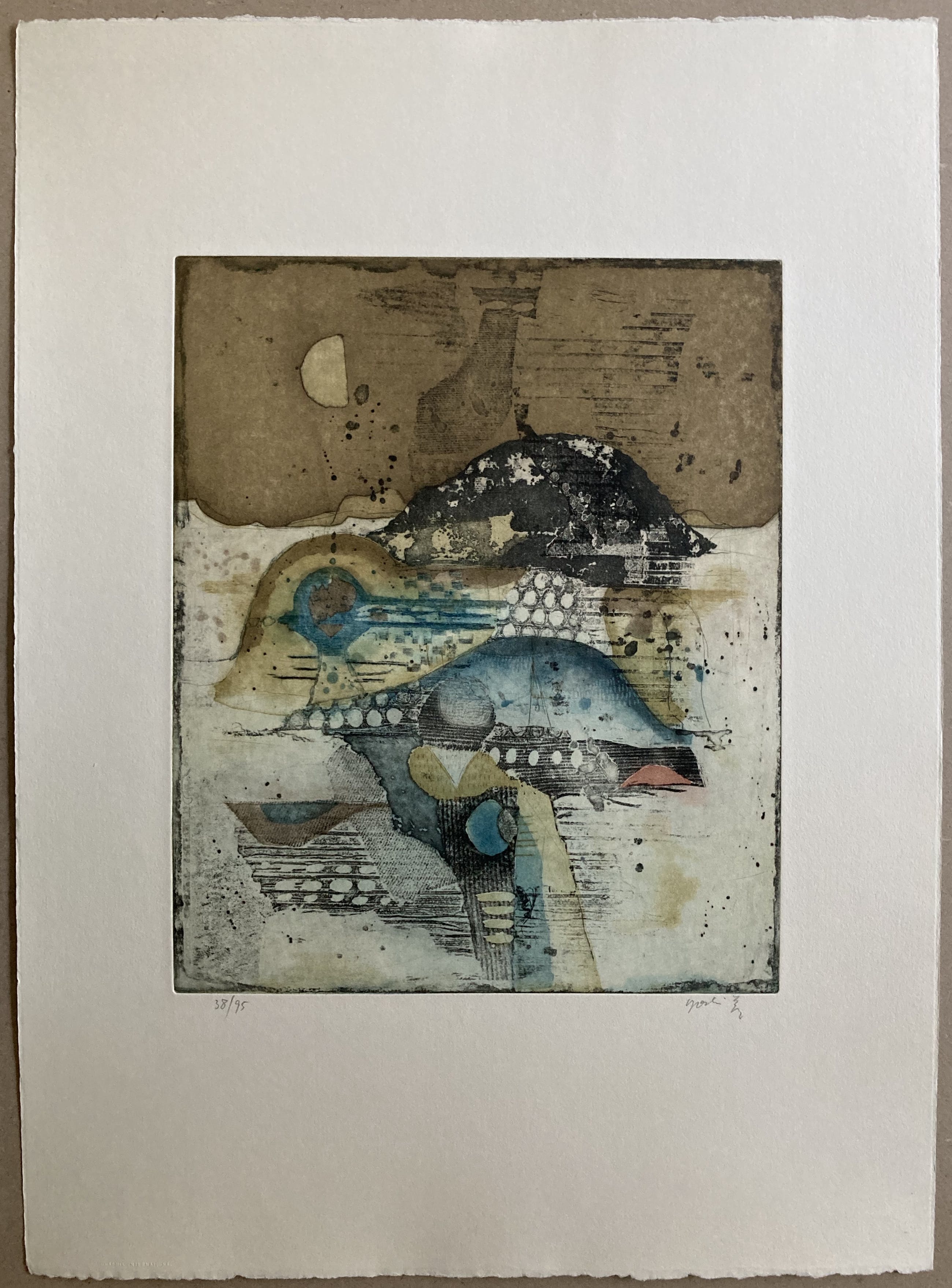 Gesigneerde en genummerde originele aquatint-ets door de belangrijke Japanse kunstenaar die van 1960-1965 kunst studeerde in Tokio en van 1966 tot 1969 afstudeerde aan de Academie voor Schone Kunsten in München Vanaf 1974 hield hij zich bijna uitsluitend bezig met aquatint-etsen, waarbij hij nieuwe technieken uitvond waarvoor hij wereldwijd bekend werd en die hij later dichter bij zijn kunststudenten aan de Ludwig Maximilians-universiteit in München en later aan het Salzburg College bracht.