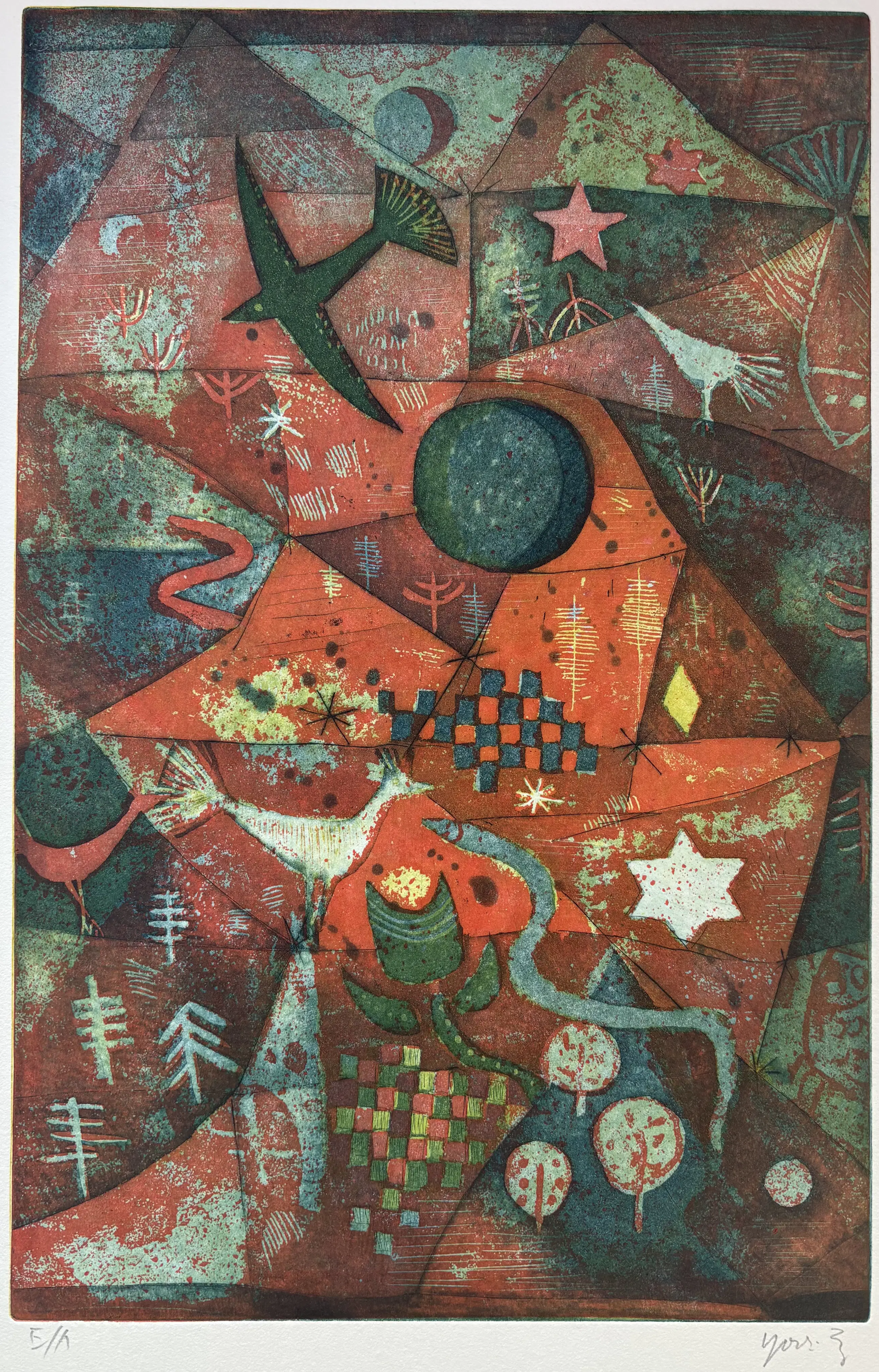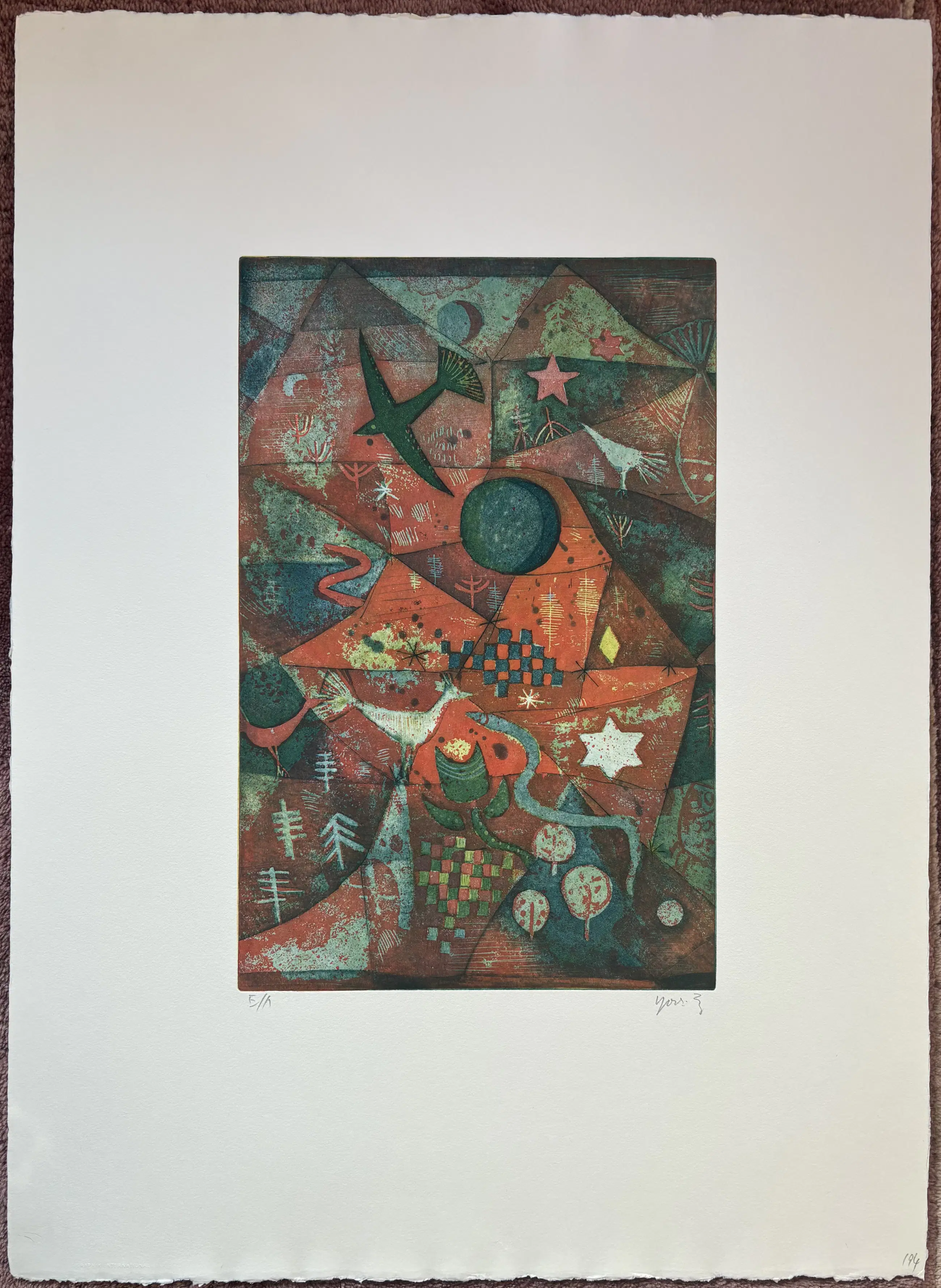 Ets uit 1986 in nieuwstaat, gedrukt op geschept Mayspies-papier. Titel: Tiergarten II. Bladformaat: 68 x 50 cm; prentformaat: ca. 40 x 26 cm. Oplage: 95+ exemplaren/afdrukken. Nr. 194, Catalogue raisonné van de prenten.