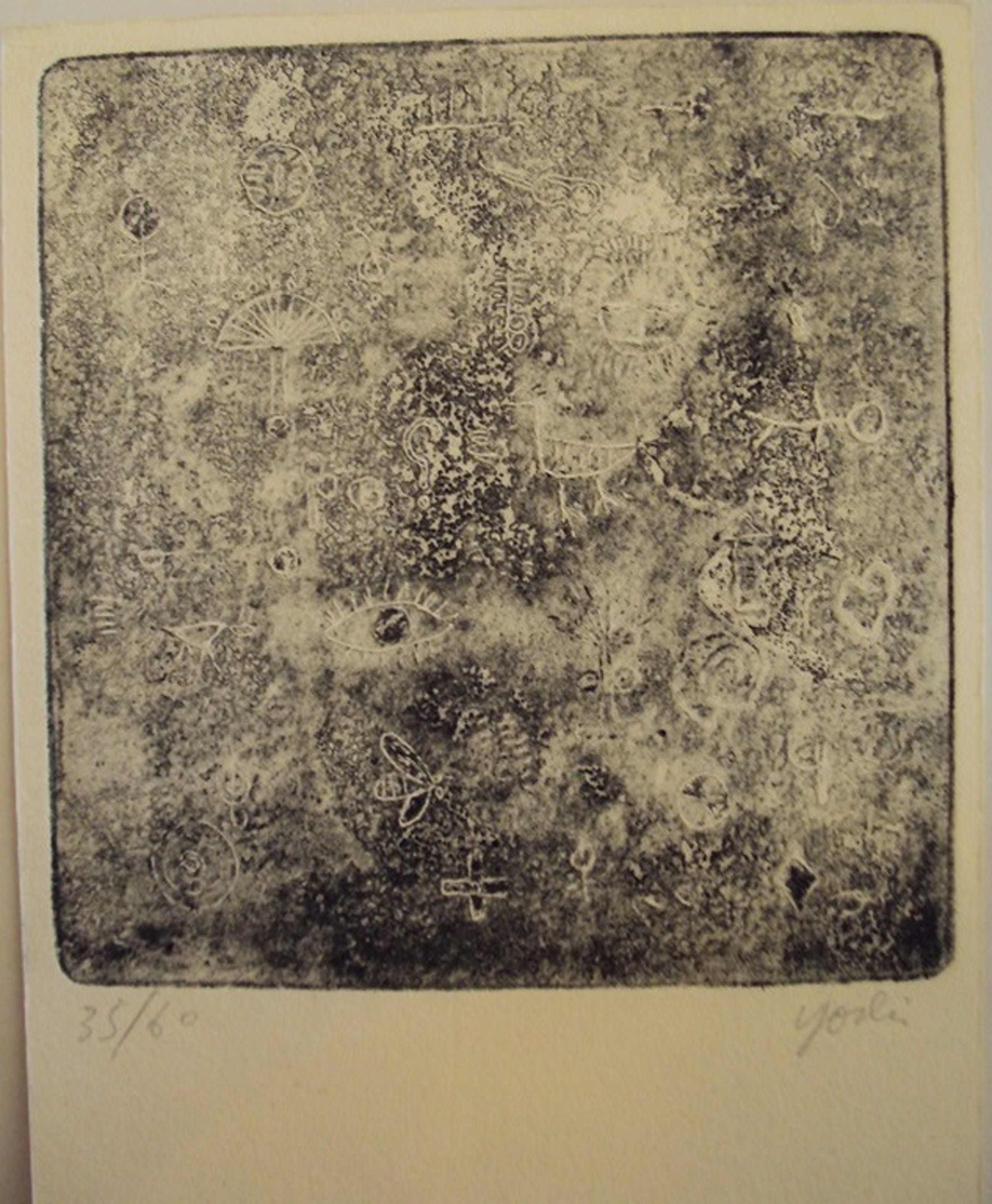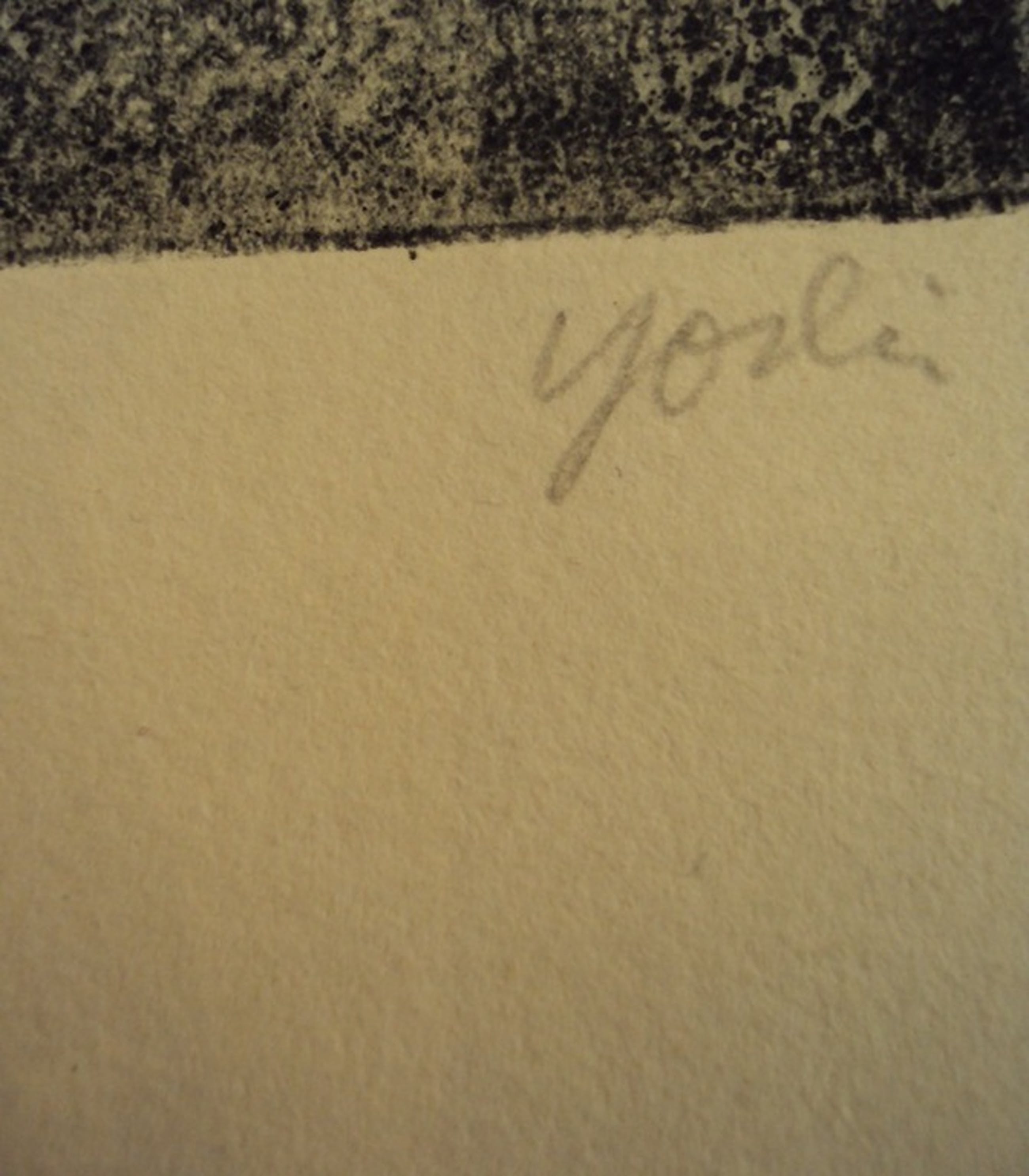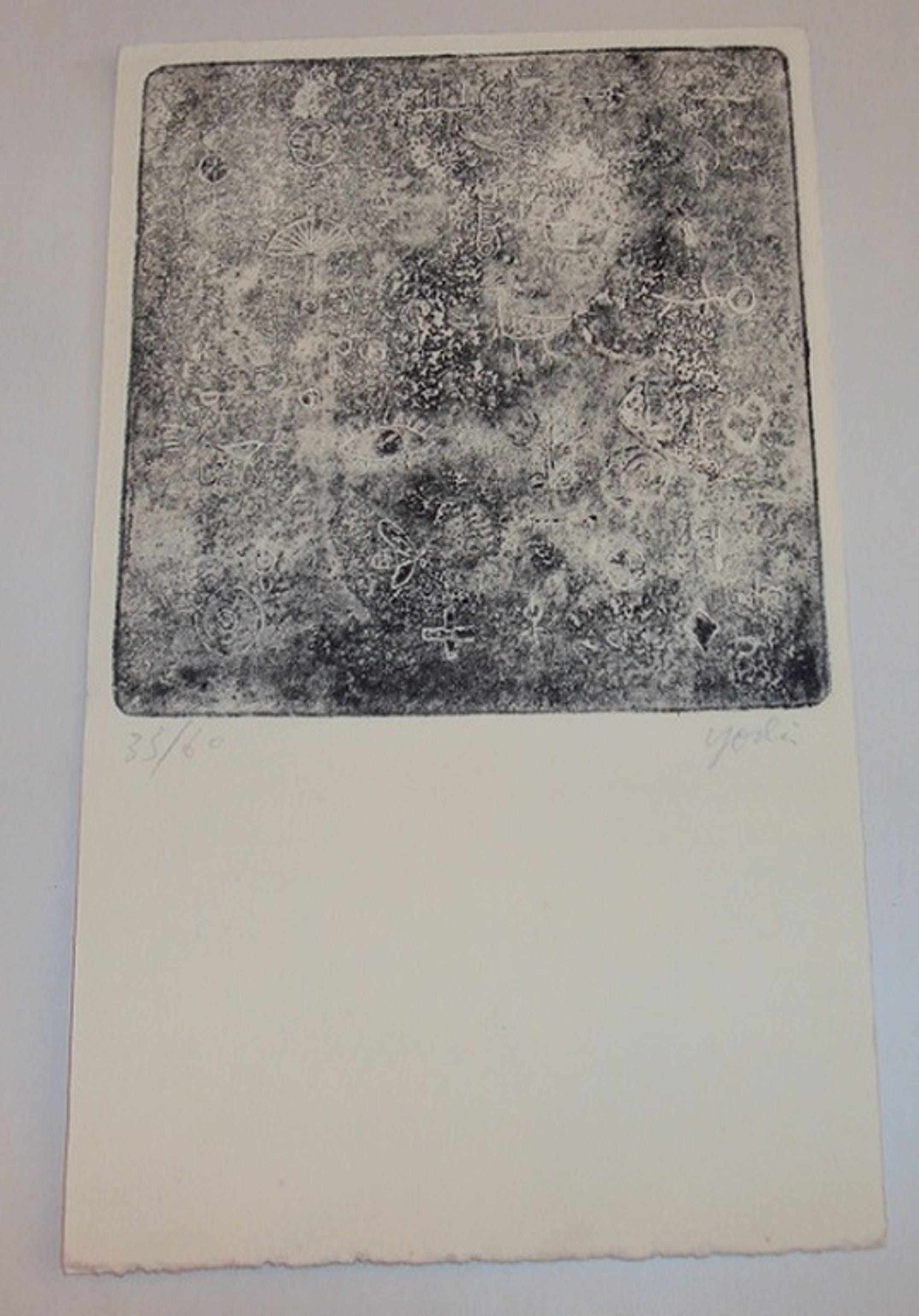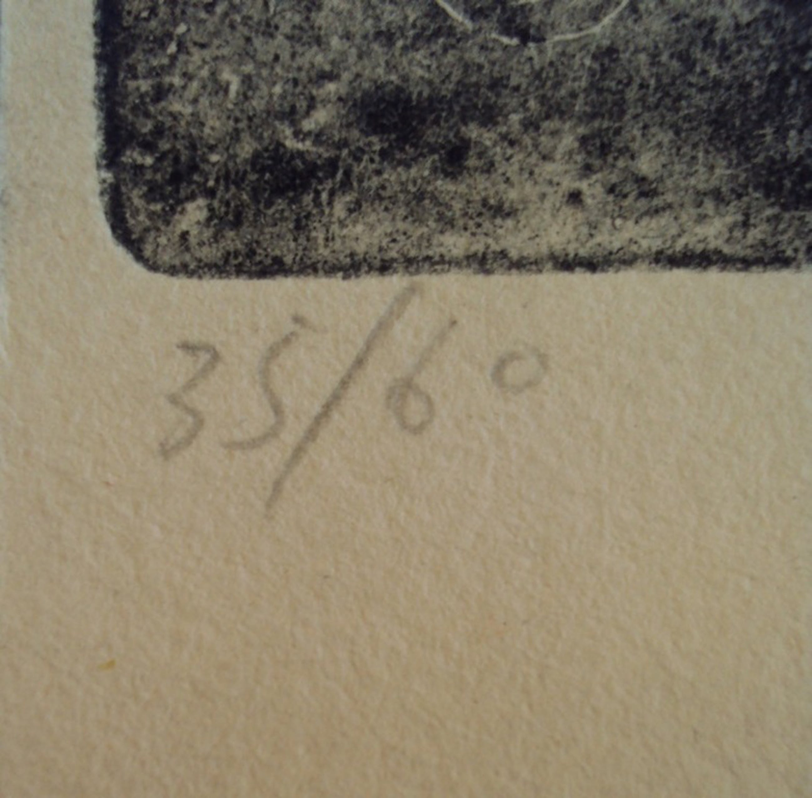 Klein etsje van de japanse kunstenaar Yoshi Takahasi(1943 Tokio, 1998 Duitsland) Hij kwam in 1960 naar duitsland om moderne kunsten te leren. Hij heeft ook in Parijs gewerkt. Hij begon met schilderen, later leerde hij etsen, en dit vak heeft hij de rest van zijn leven beoefend. Beeldmaat 12 bij 12 cm. Papiermaat 15 bij 22 cm. Handgesigneerd. Nummer 35 uit 60. Het is niet ingelijst; Het is net een zoekplaatje. Hij heeft enorm veel tentoonstellingen gehad en is vooral in Duitslande erg populair. Hij is niet zo bekend in Nederland. Op wikipedia kunt u meer informatie vinden over de kunstenaar.