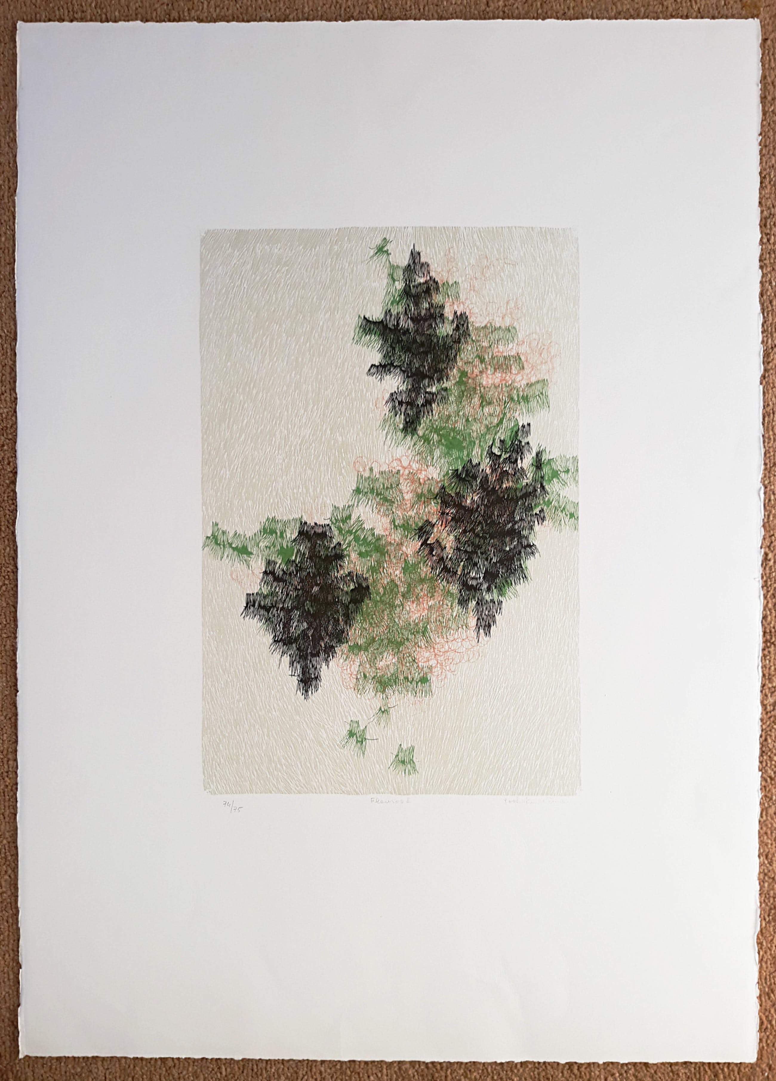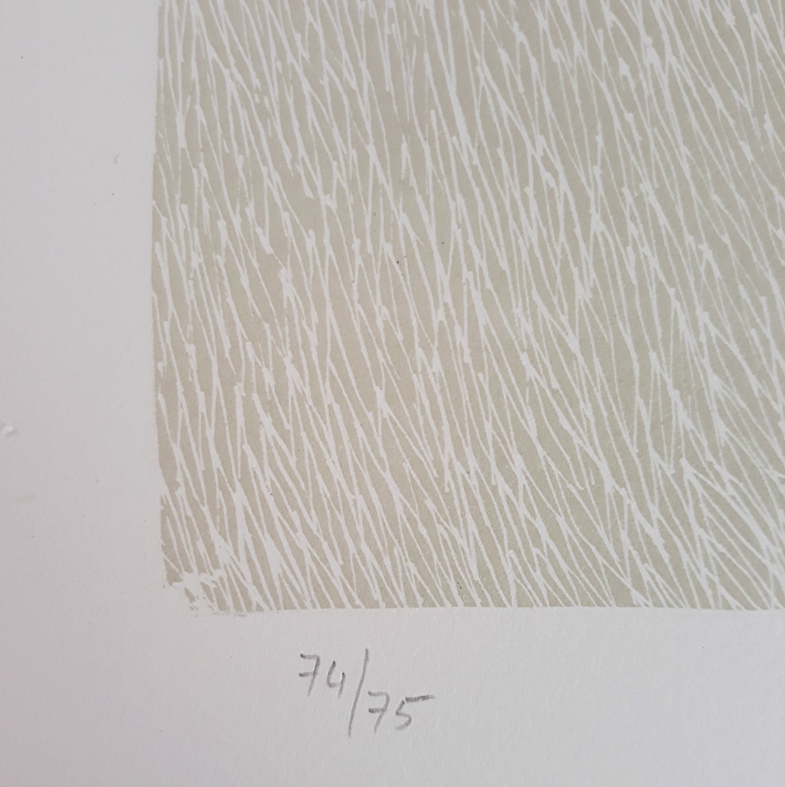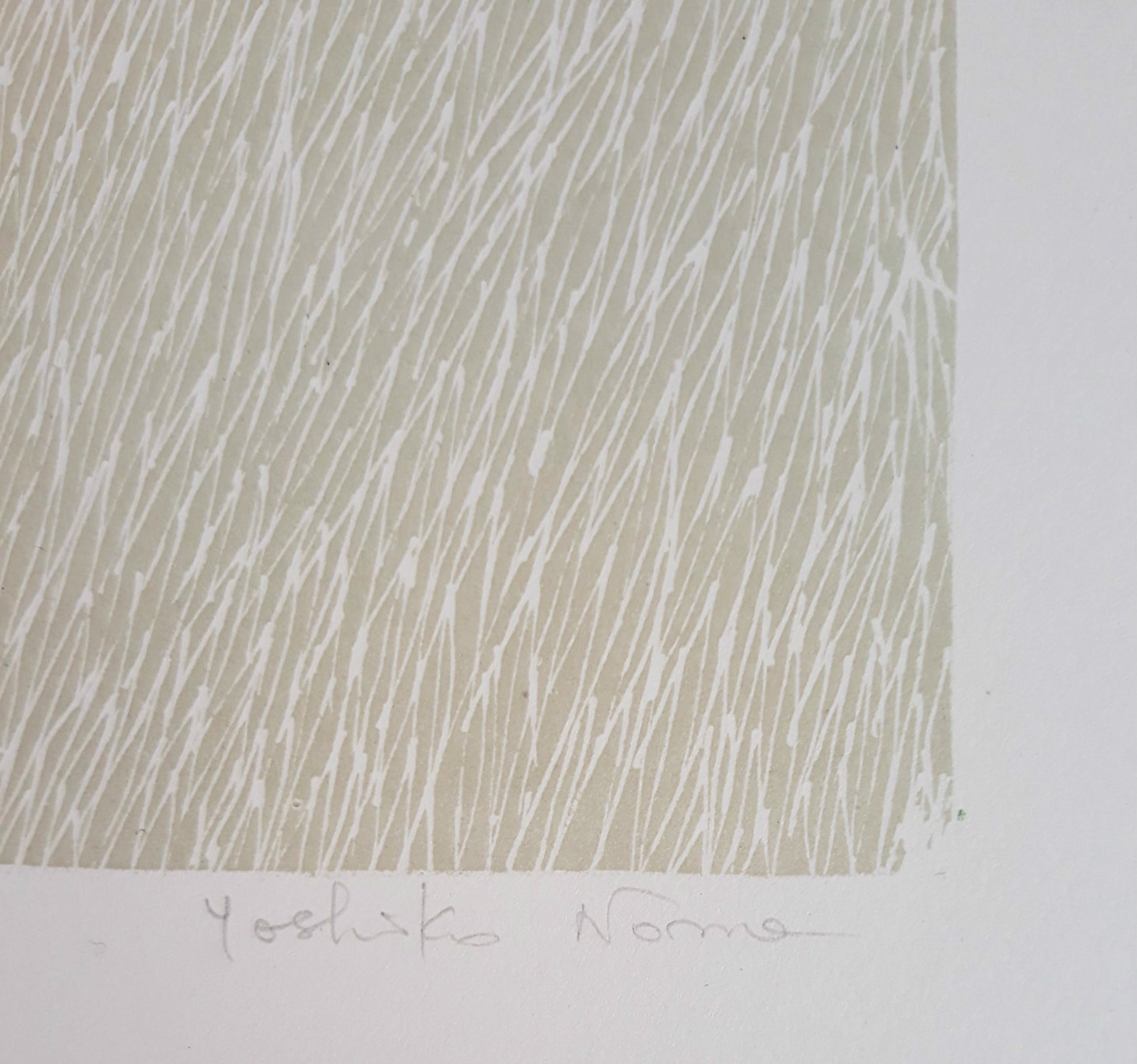 Zeer mooi werk uit 1968 van de japanse kunstenares Yoshiko Noma. Litho op geschept papier (met watermerk van Spirale Milano), met potlood gesigneerd, getiteld en genummerd (74/75). In zeer goede conditie; er zitten een aantal zeer kleine kreukjes in de witte marge maar die zijn totaal niet storend.
