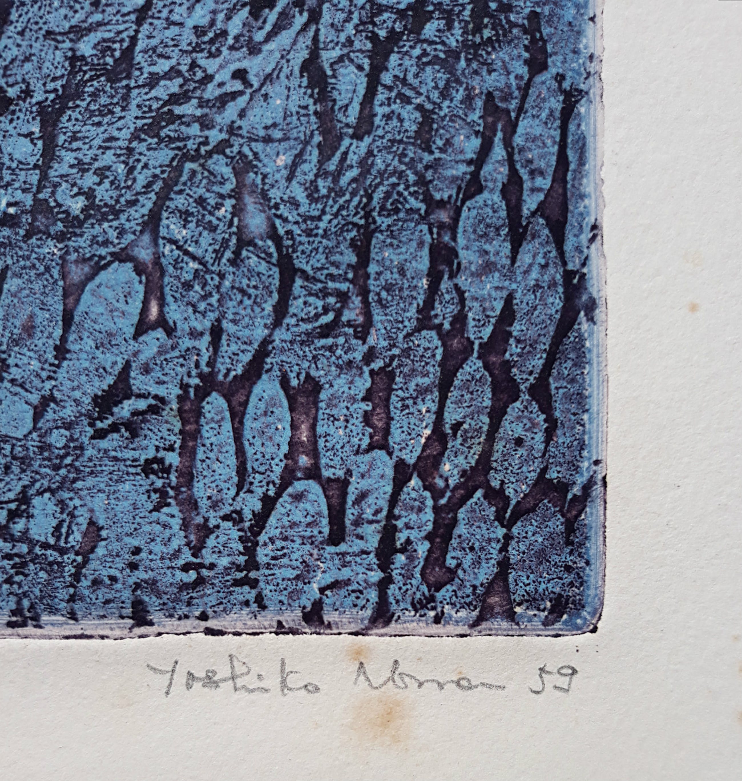 Prachtig werk van de japanse kunstenares Yoshiko Noma. Ets op Rives papier, met potlood gesigneerd, gedateerd (‘59) en getiteld, een Épreuve d’Artiste exemplaar. In goede conditie; in het hele blad zitten foxing plekjes, vooral aan de achterkant. Aan de voorkant van het blad minder en de plekjes in het beeld zijn niet te zien. Ingelijst met passe-partout is het werk prima.