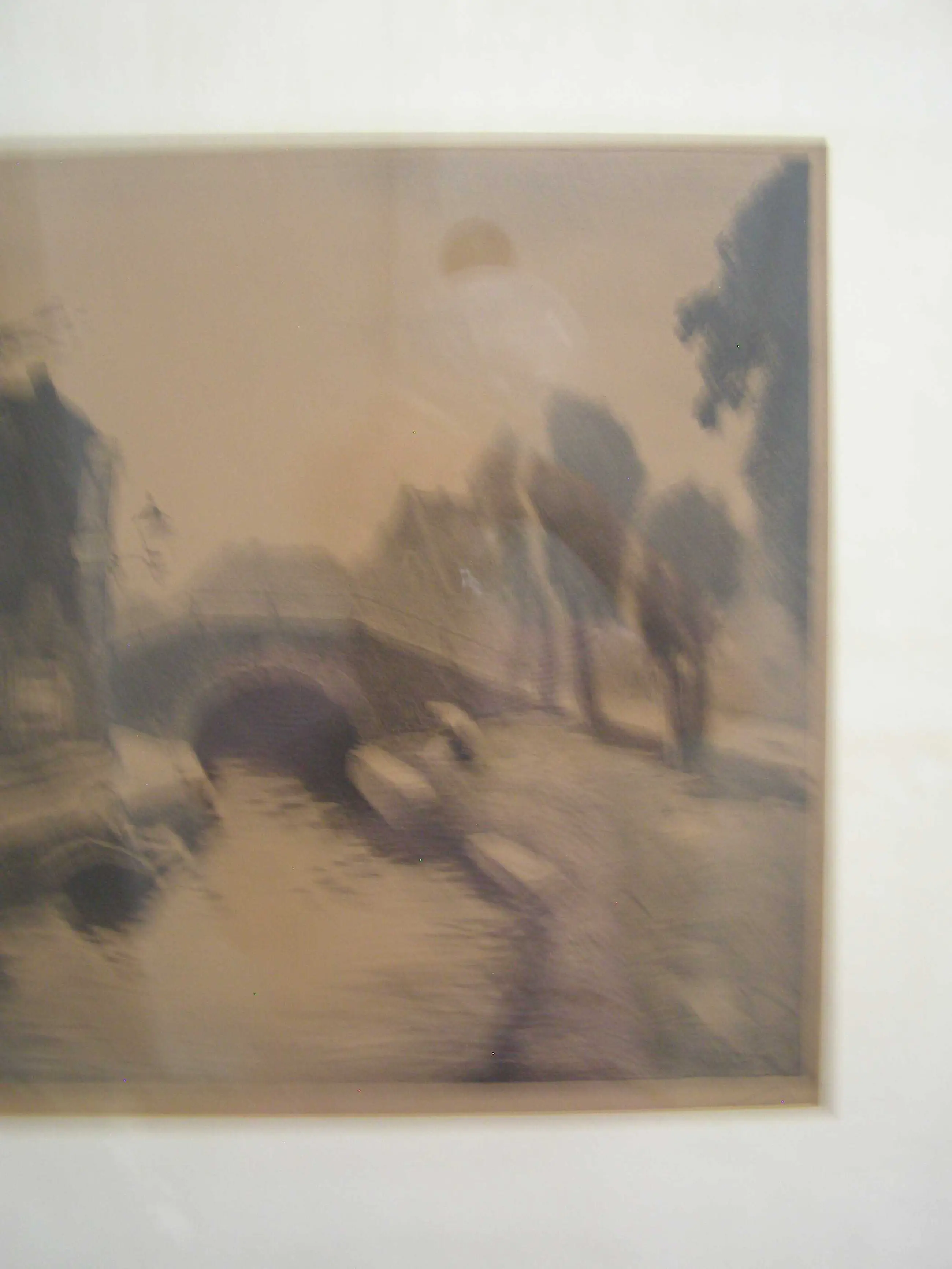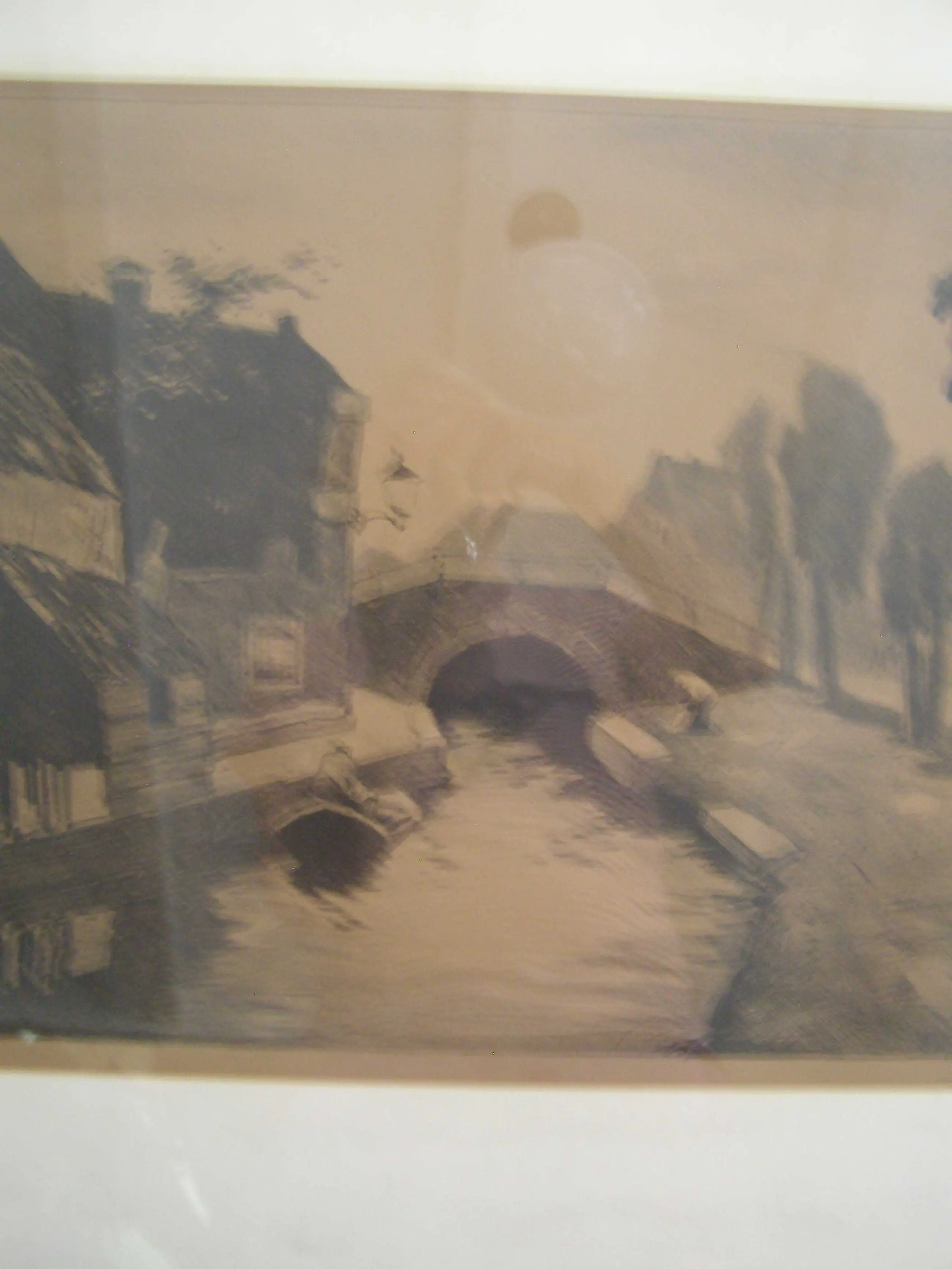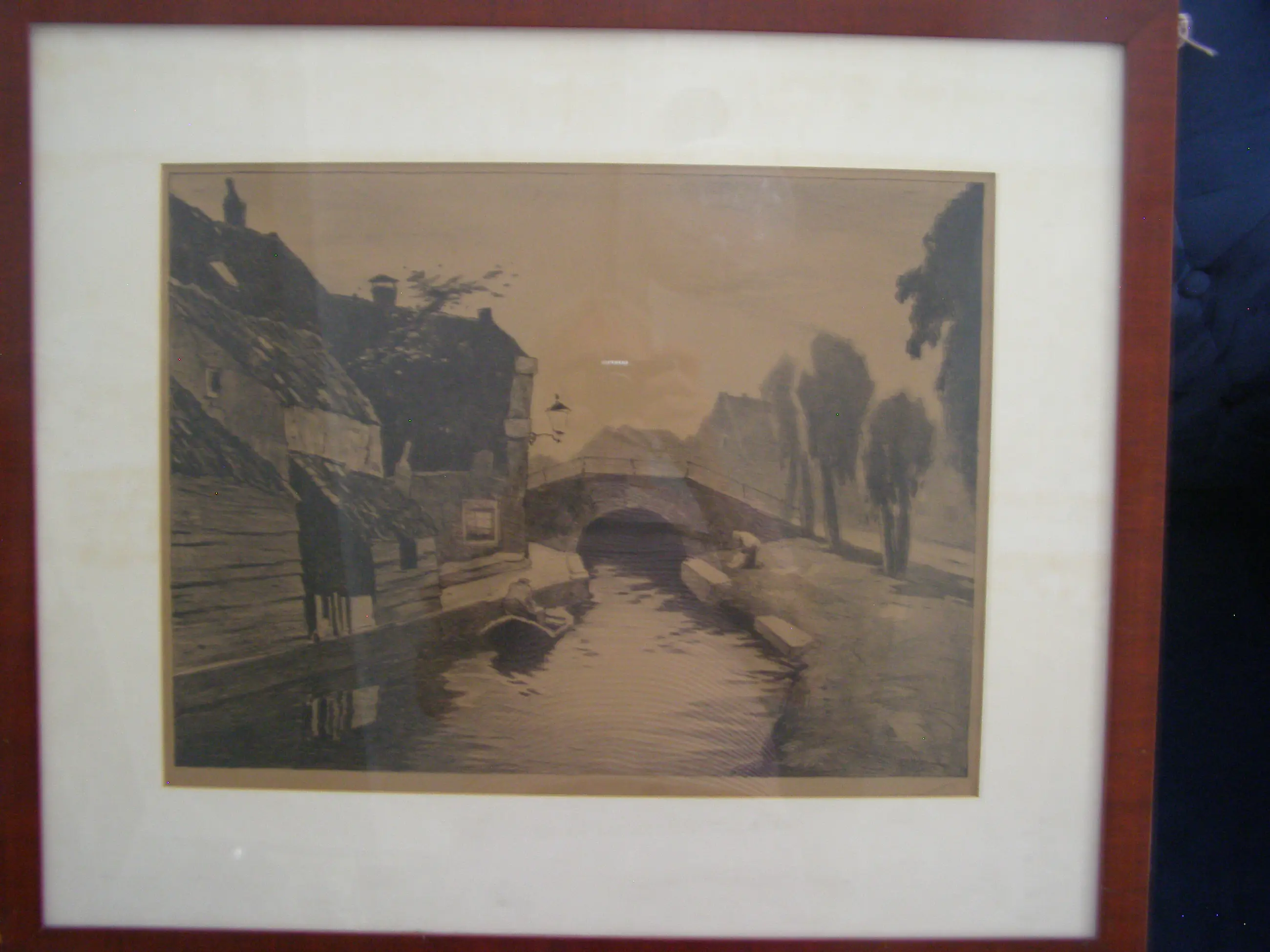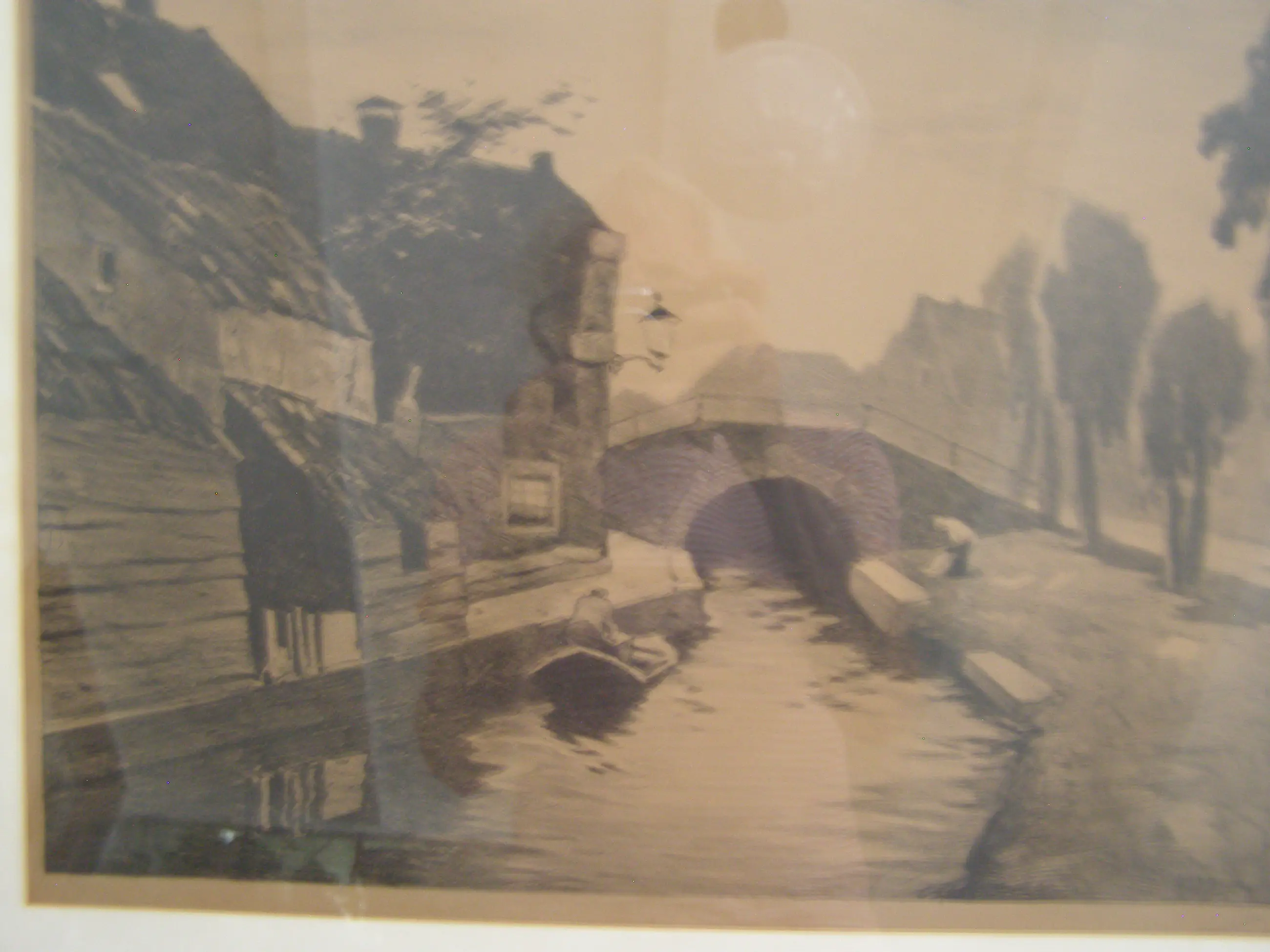 Ype Wenning, 1879 - 1959. Schilder, aquarellist, graficus, tekenaar. Litho van Oudewater; Dorpsgezicht met bruggetje en man in boot. Schilderachtige litho van de in 1879 in Friesland geboren schilder en graficus Ype Heerke Wenning. Gesigneerd rechtsonder: Ype Wenning. Fraai ingelijst achter passepartout en glas.
