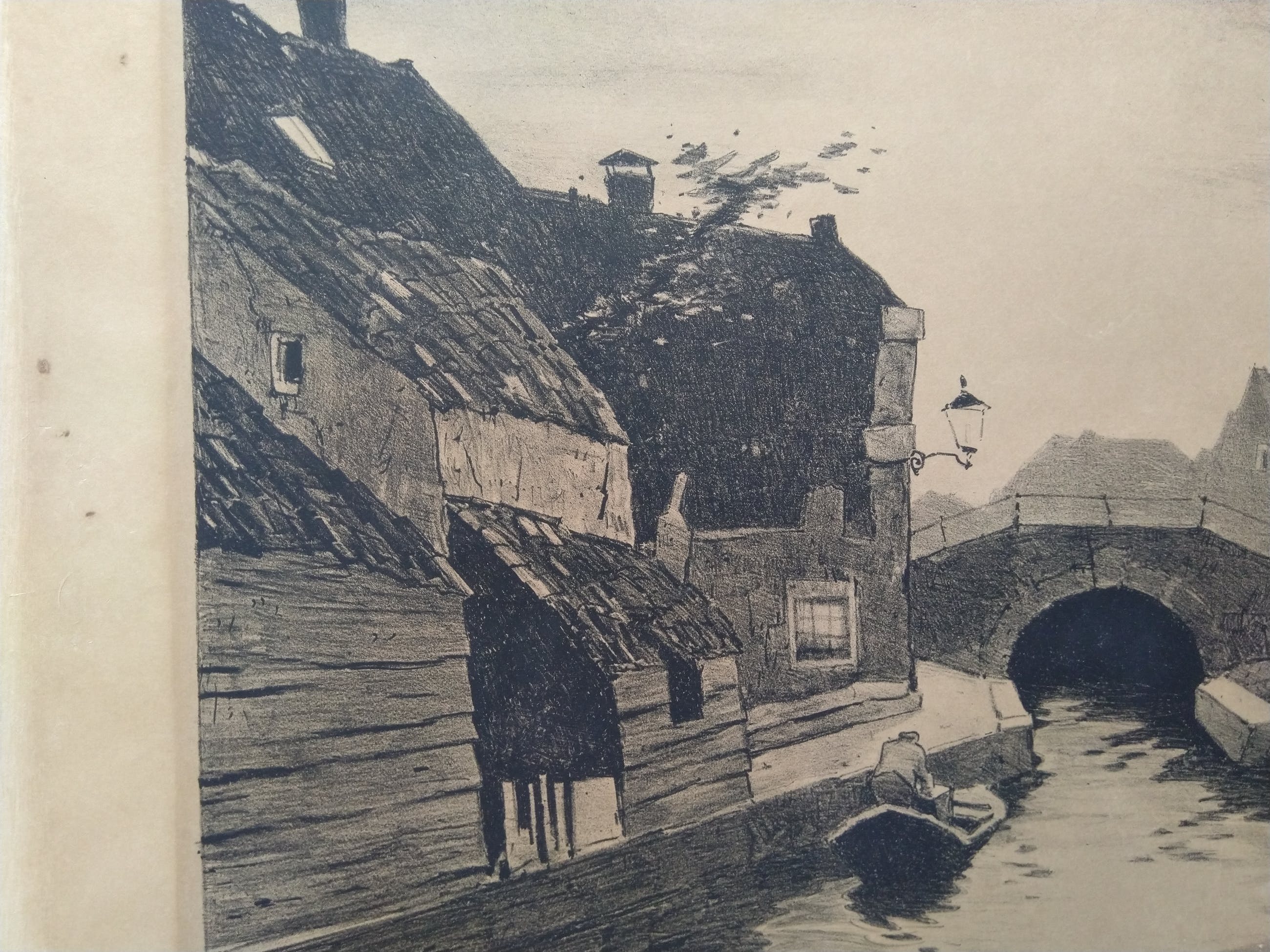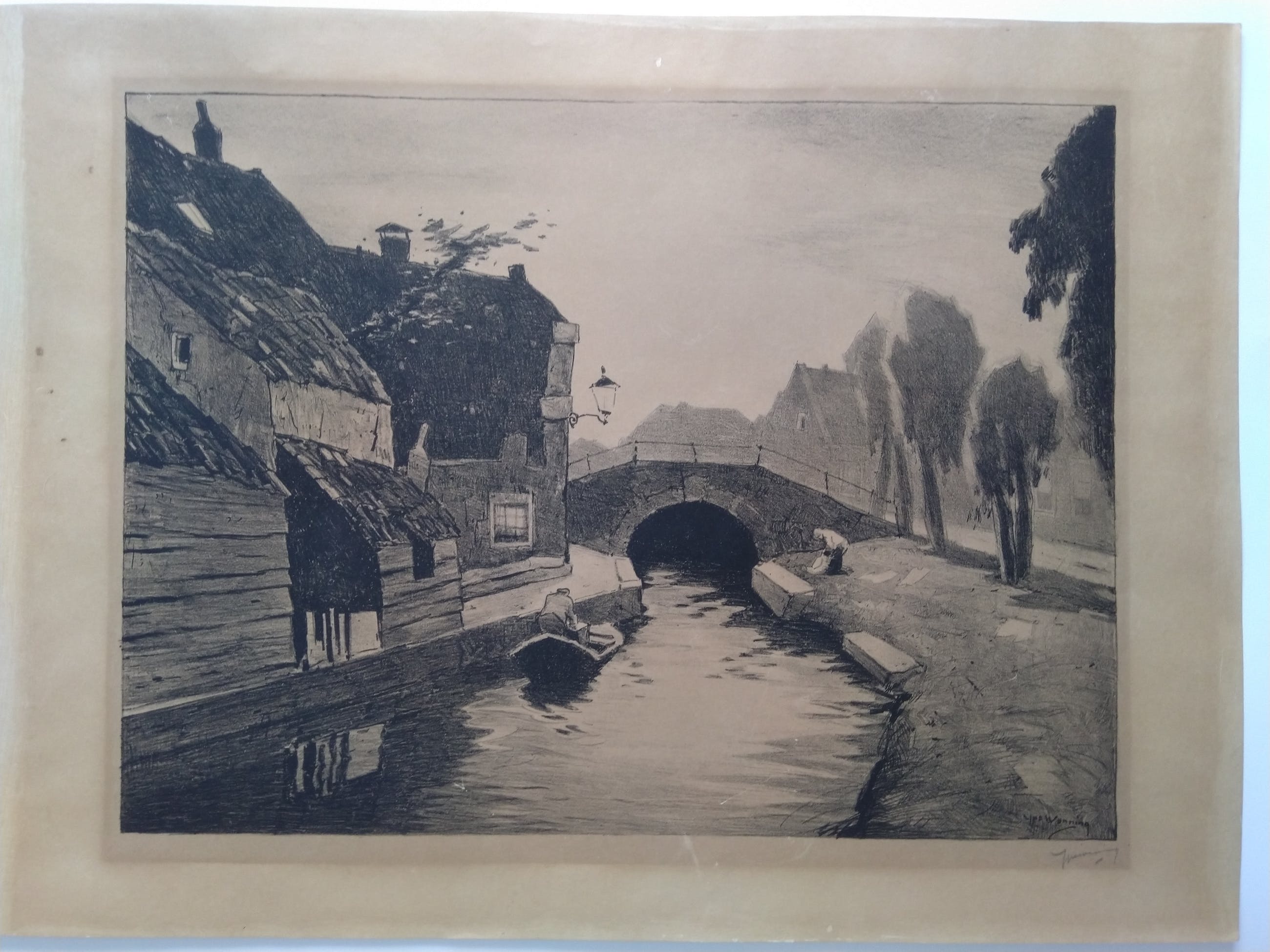 Litho van Ype Wenning van een bruggetje in Oudewater. Rechtsonder gesigneerd in potlood: Y. Wenning Rechtsonder gesigneerd in afbeelding: Ype Wenning