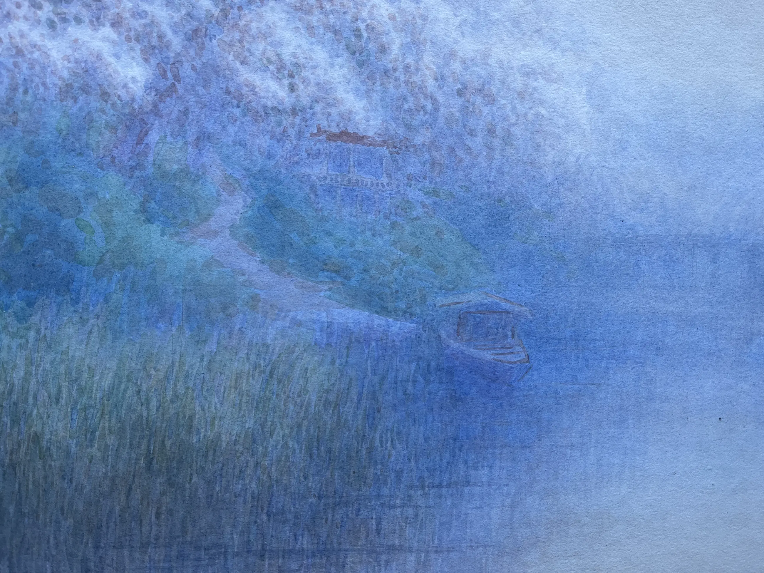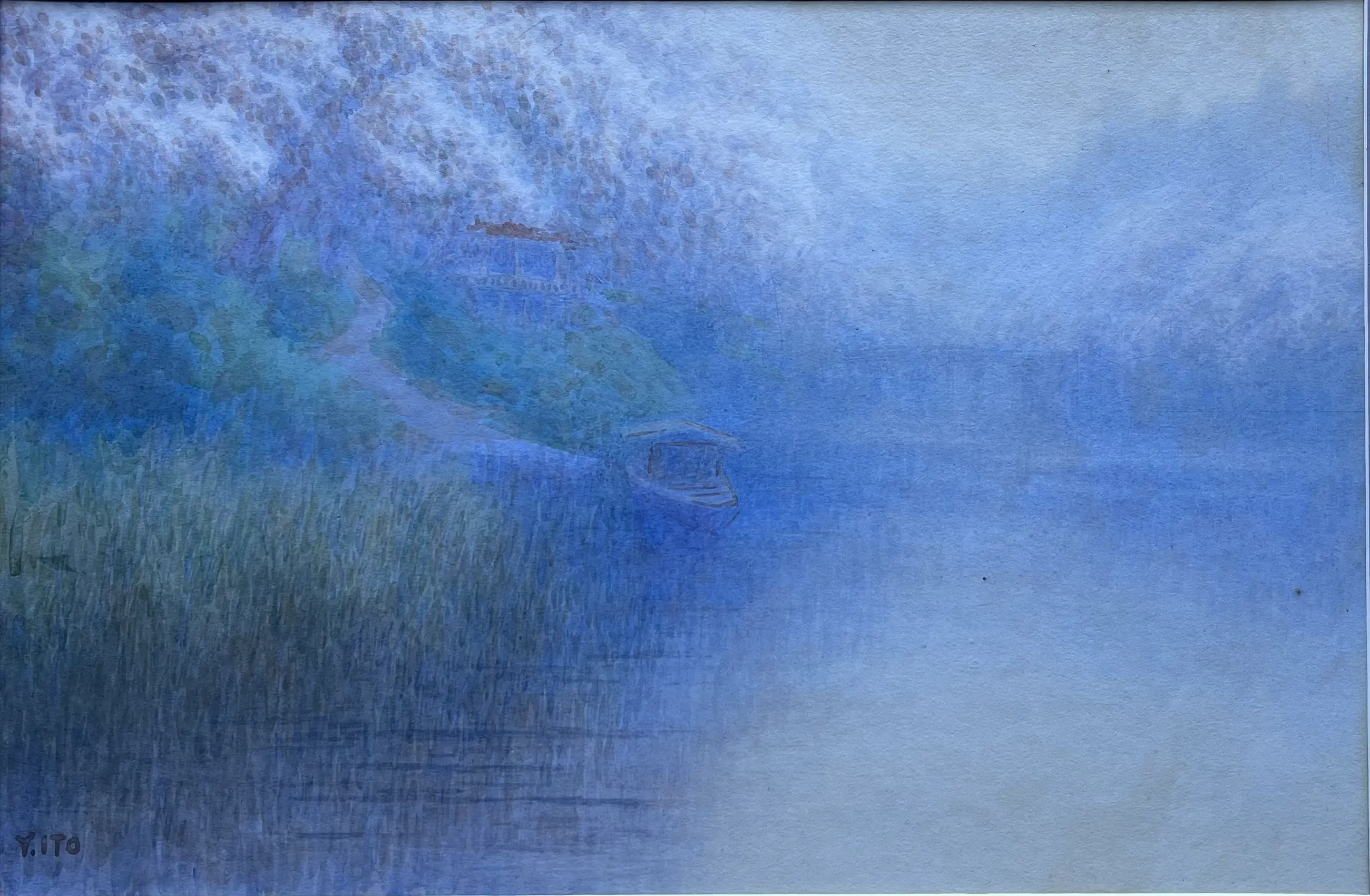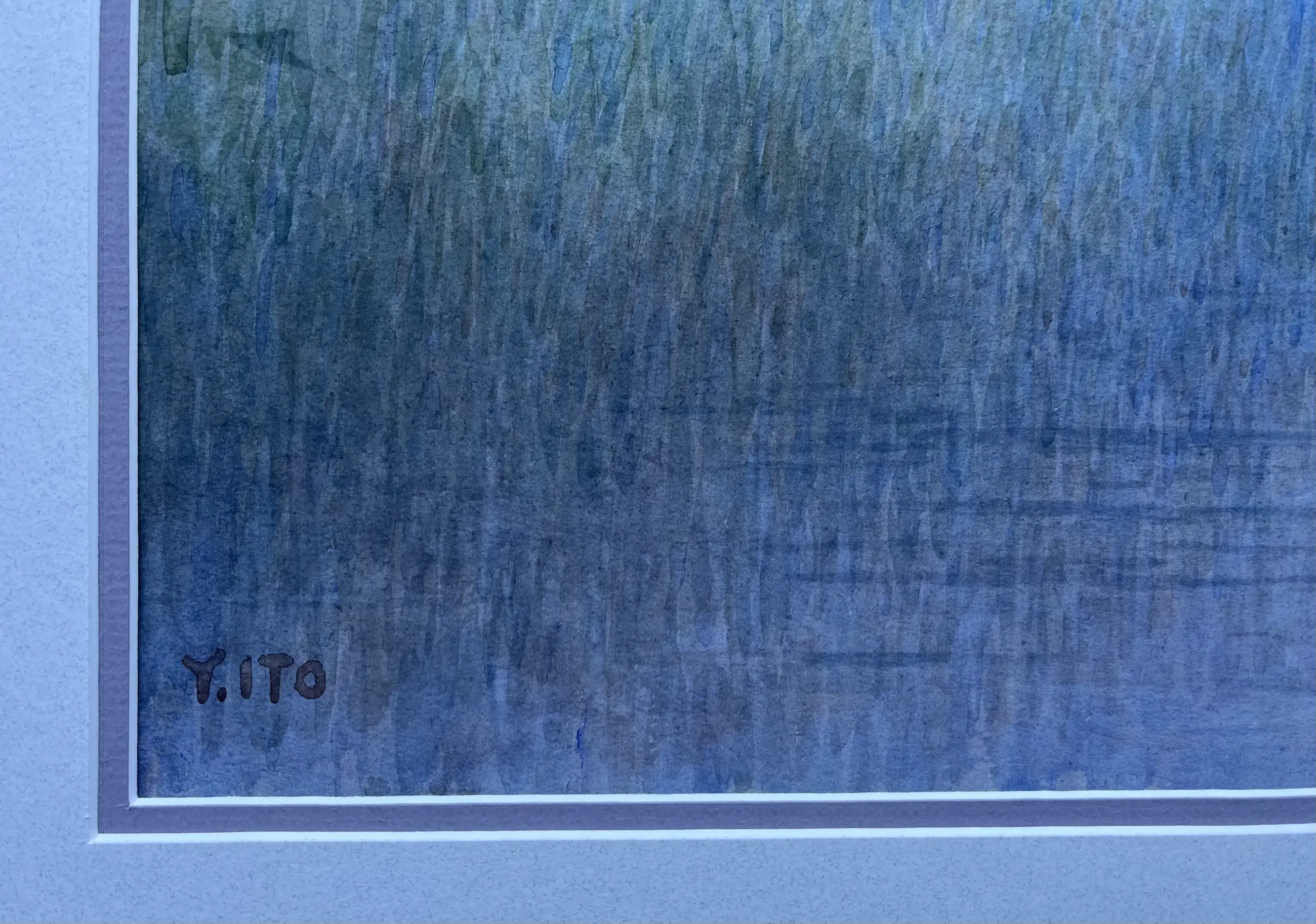Mistig tafereel met hoge bomen en waterpagode met boot in de verte. Dubbel gematteerd. Gesigneerd Y. Ito linksonder Prachtstaat! Eén klein vochtvlekje. Oud werk! Zal veilig en vlak verstuurd worden met beide passe partouts.