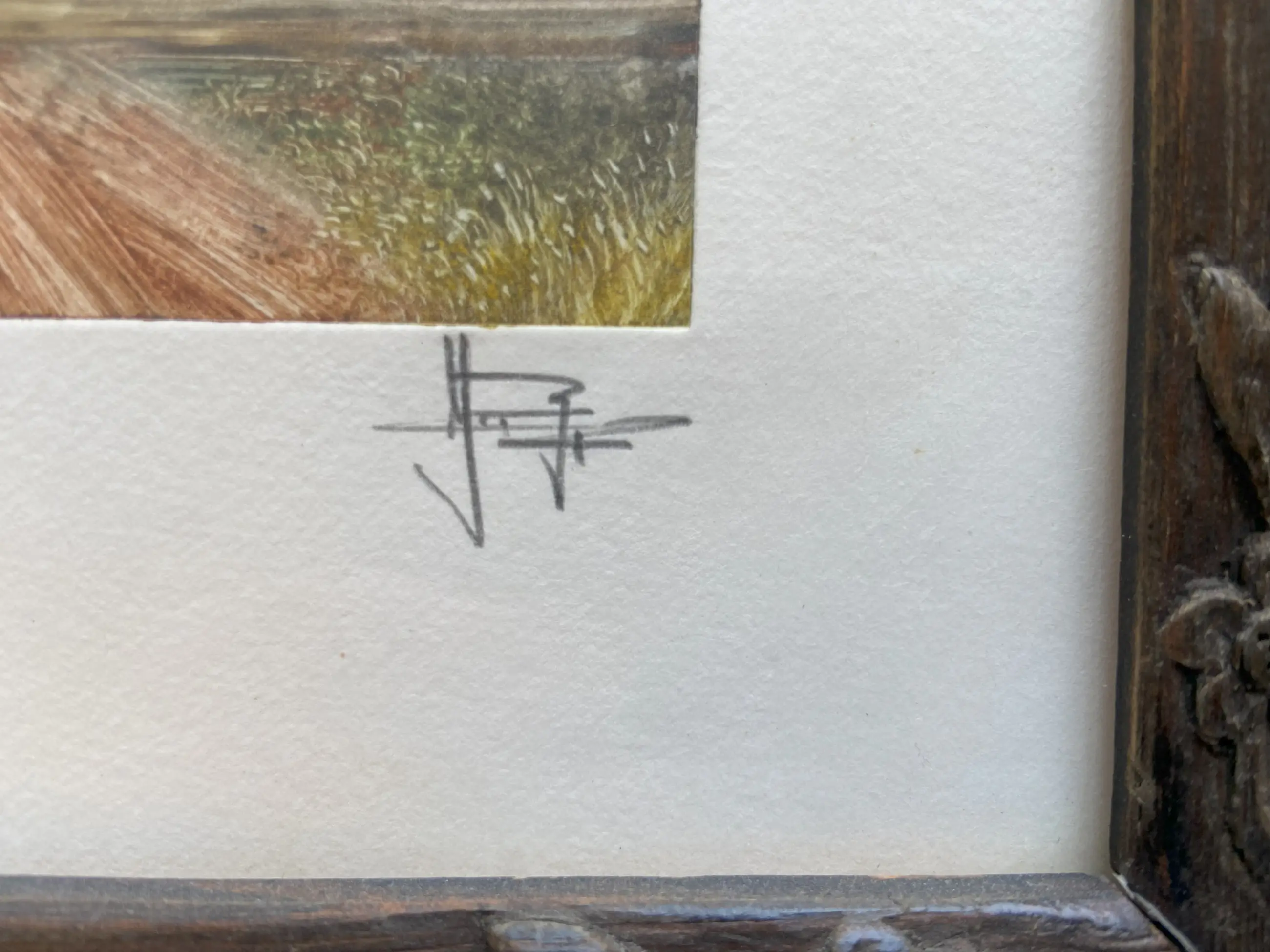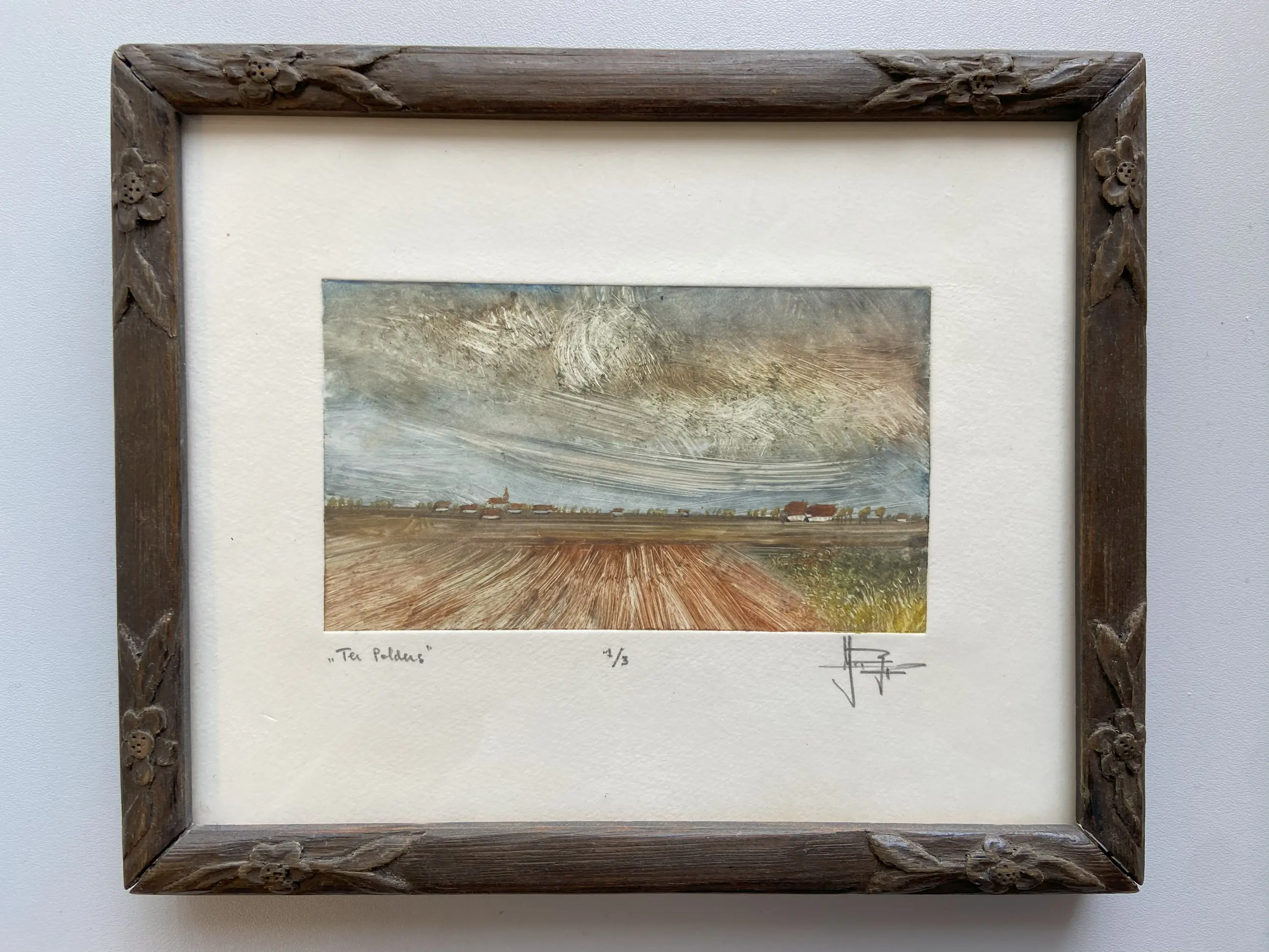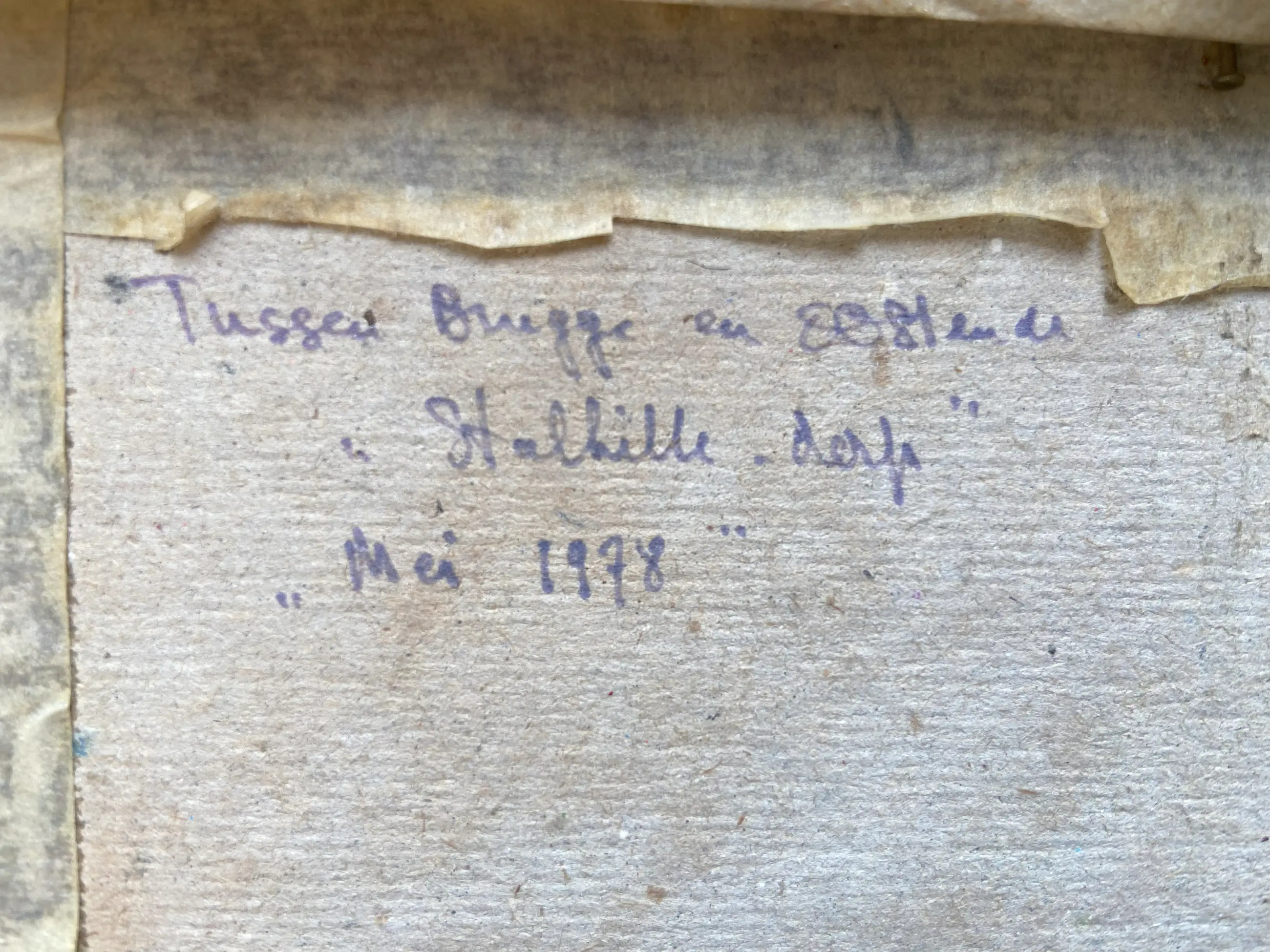 Fraai schilderijtje van het landschap tussen Brugge en Oostende. Schilderij zit in een lijst met glas. Schilderij is in 1978 gemaakt.