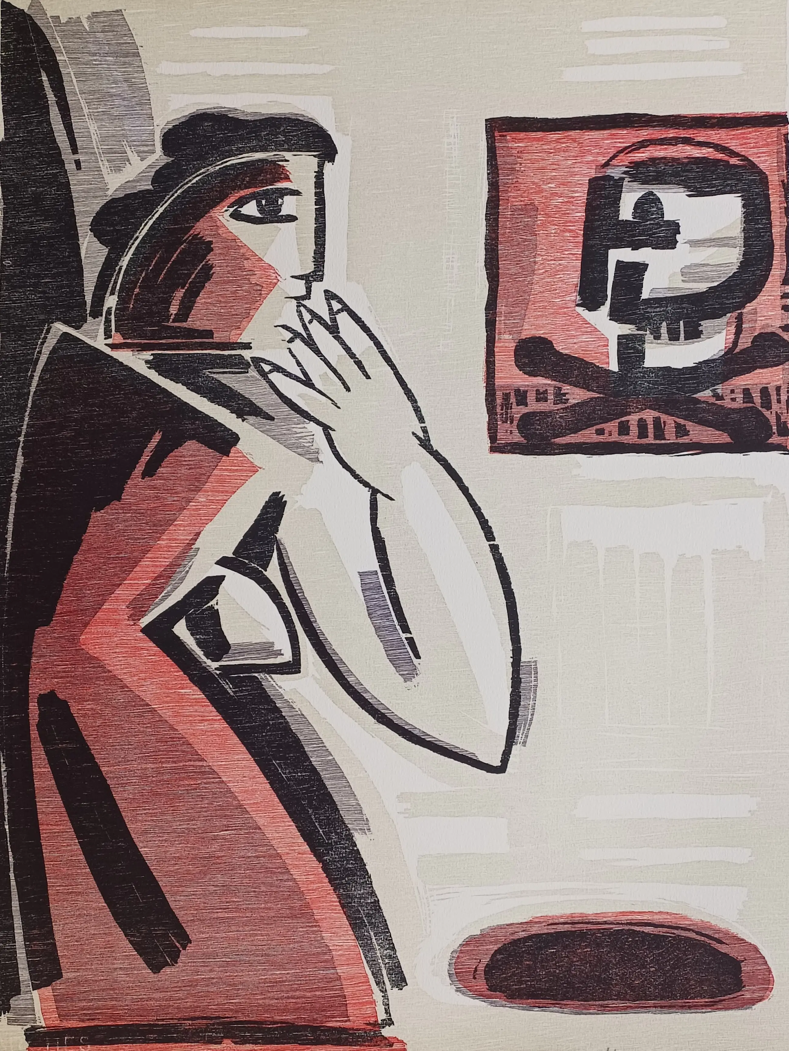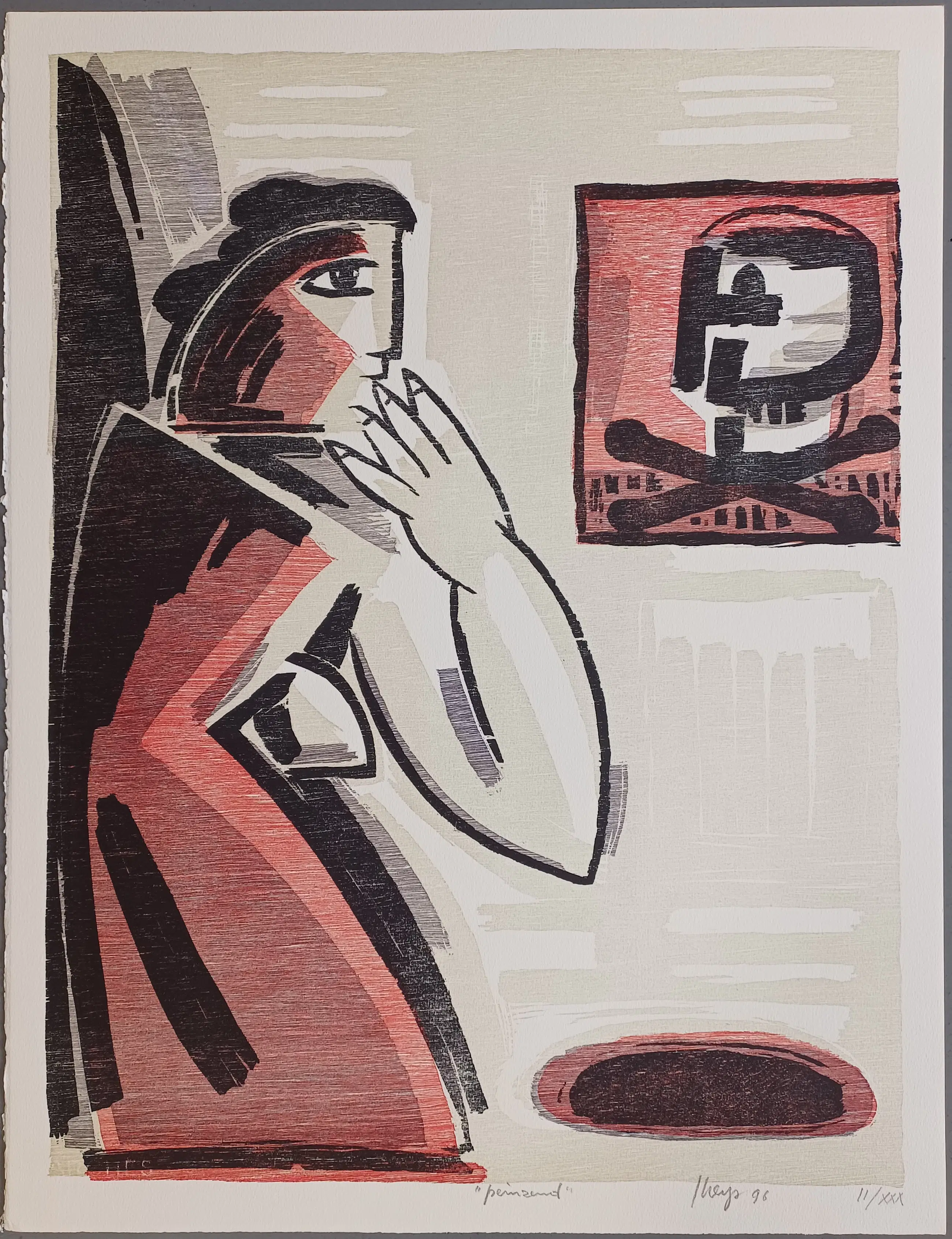 Gesigneerde houtsnede van de kunstenaar Yvan Theys (1936-2005) uit 1996. Rechtsonder is het werk gesigneerd in potlood en II/XXX In het midden met Peinzend. Papiermaat ca 65 x 50 cm. Het werk in prima staat en is nooit ingelijst geweest.