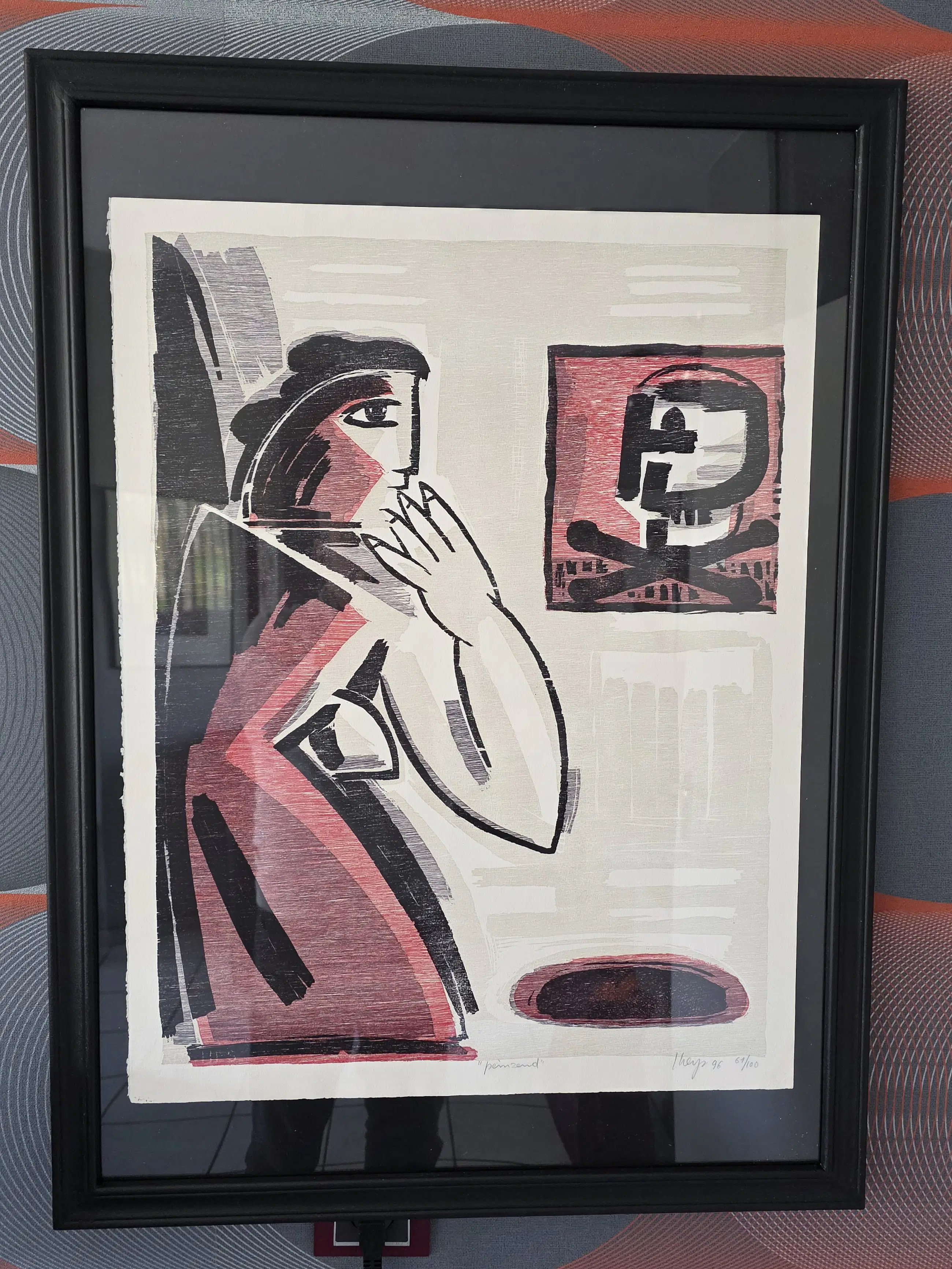 Yvan Theys - het is een gesigneerde houtsnede -Peinzend