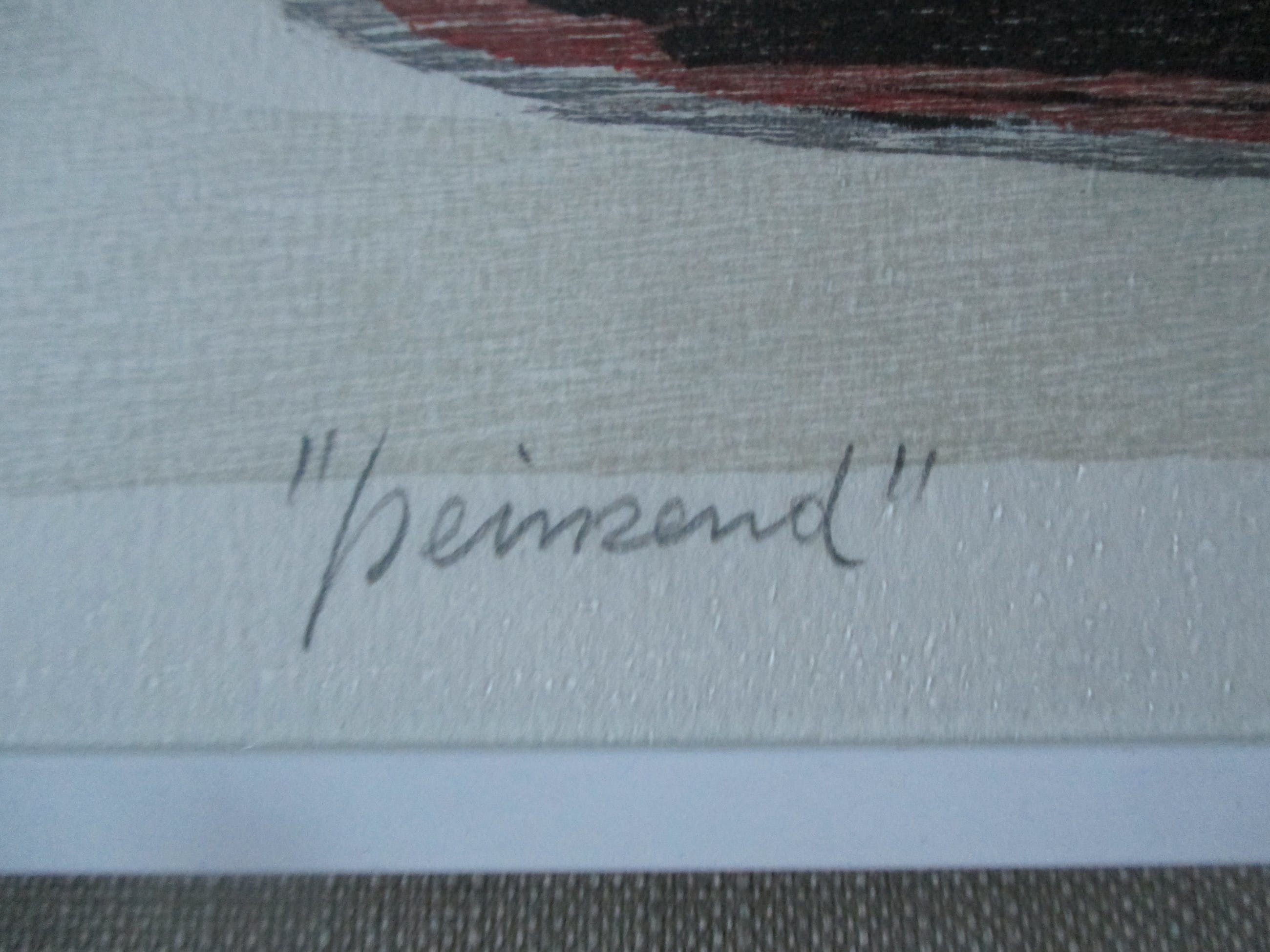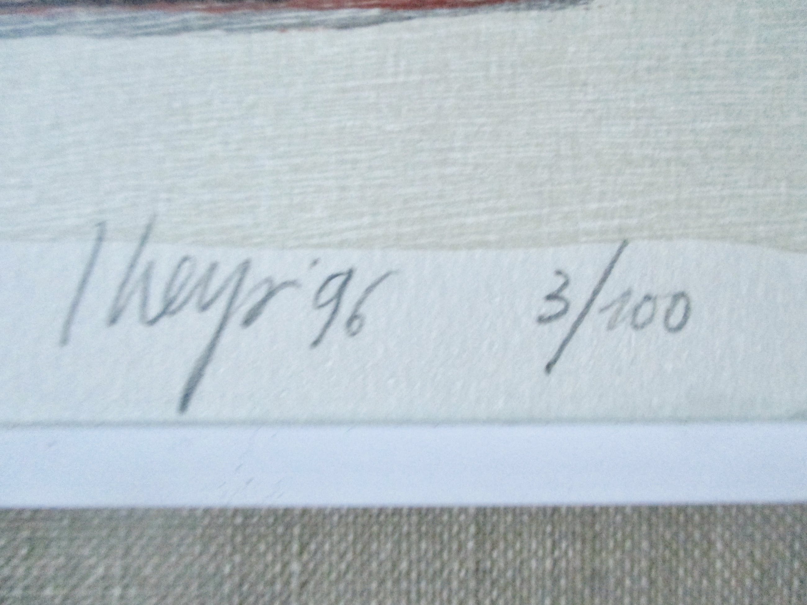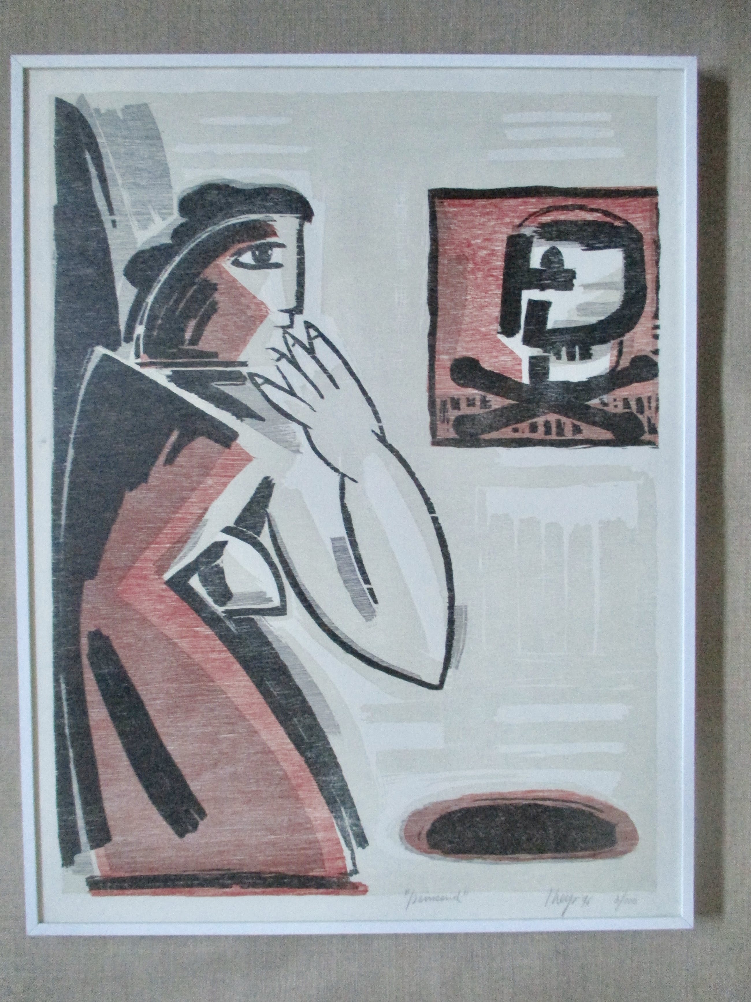 Houtsnede van Yvan Theys, gesigneerd, gedateerd, getiteld en genummerd in potlood. Ingelijst achter glas in witmetalen lijst.