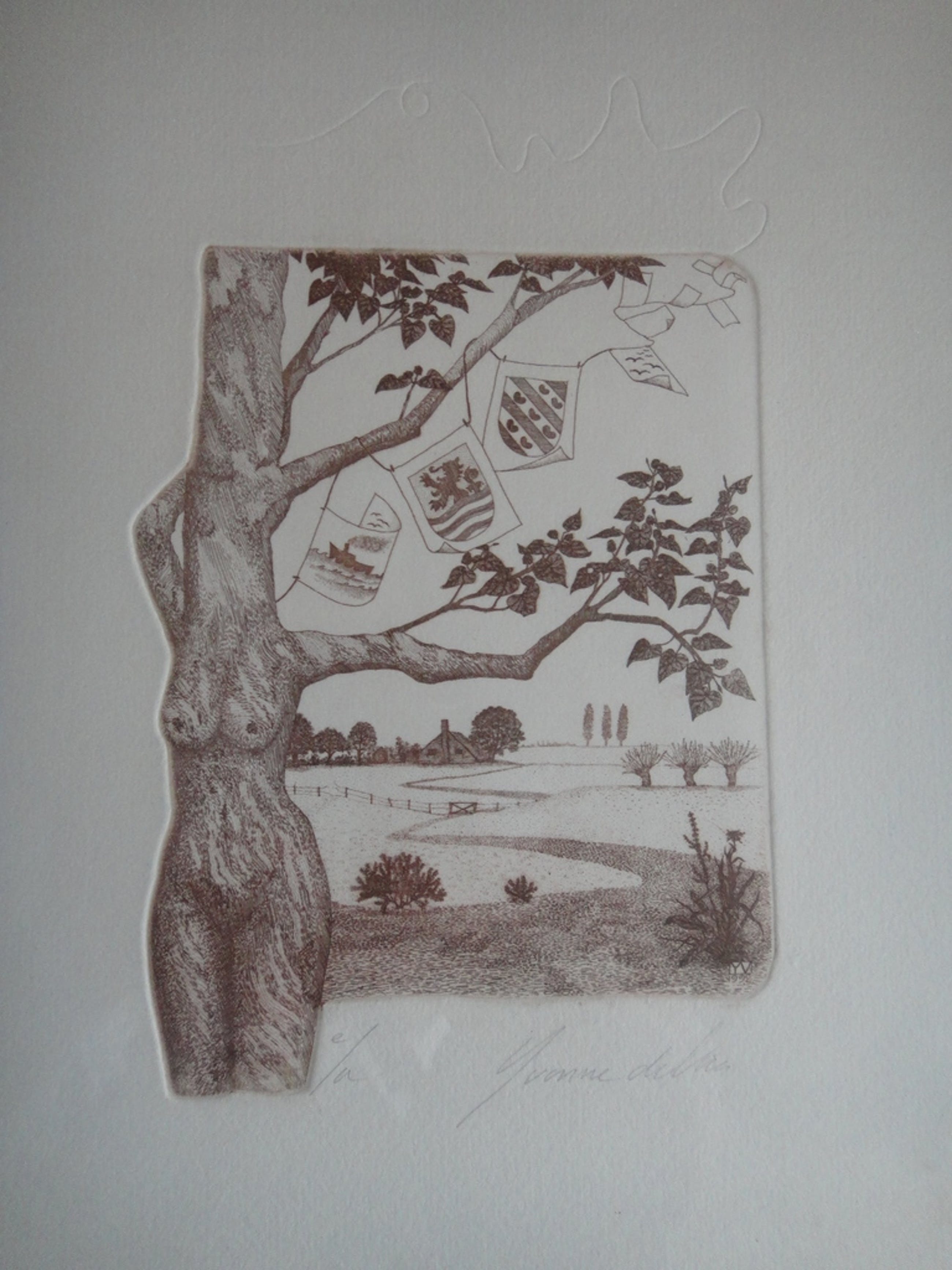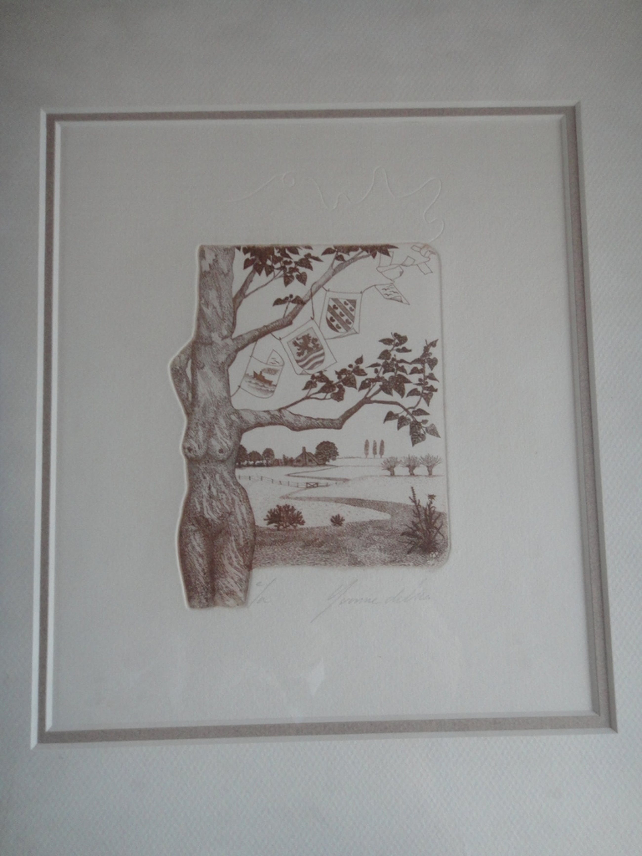 Mooie ets achter passe-partout door de Amsterdamse kunstenares Yvonne de Vries, geboren 1952.