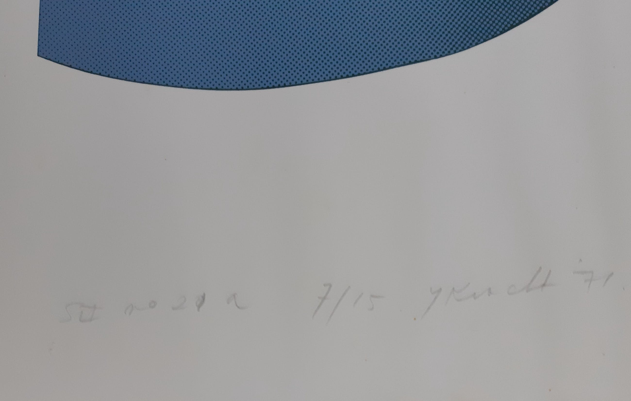 Krachtige abstracte zeefdruk van Yvonne Kracht. Door de kunstenaar met potlood gesigneerd, gedateerd, genummerd en van titel voorzien. Kleine oplage. Ingelijst in perfect passende aluminium lijst. De conditie van het beeld is zeer goed. Het papier is enigszins gegolfd aan de onderzijde, er zijn enkele kleine vlekjes. Zie foto's. Er kunnen daarop reflecties zichtbaar zijn.