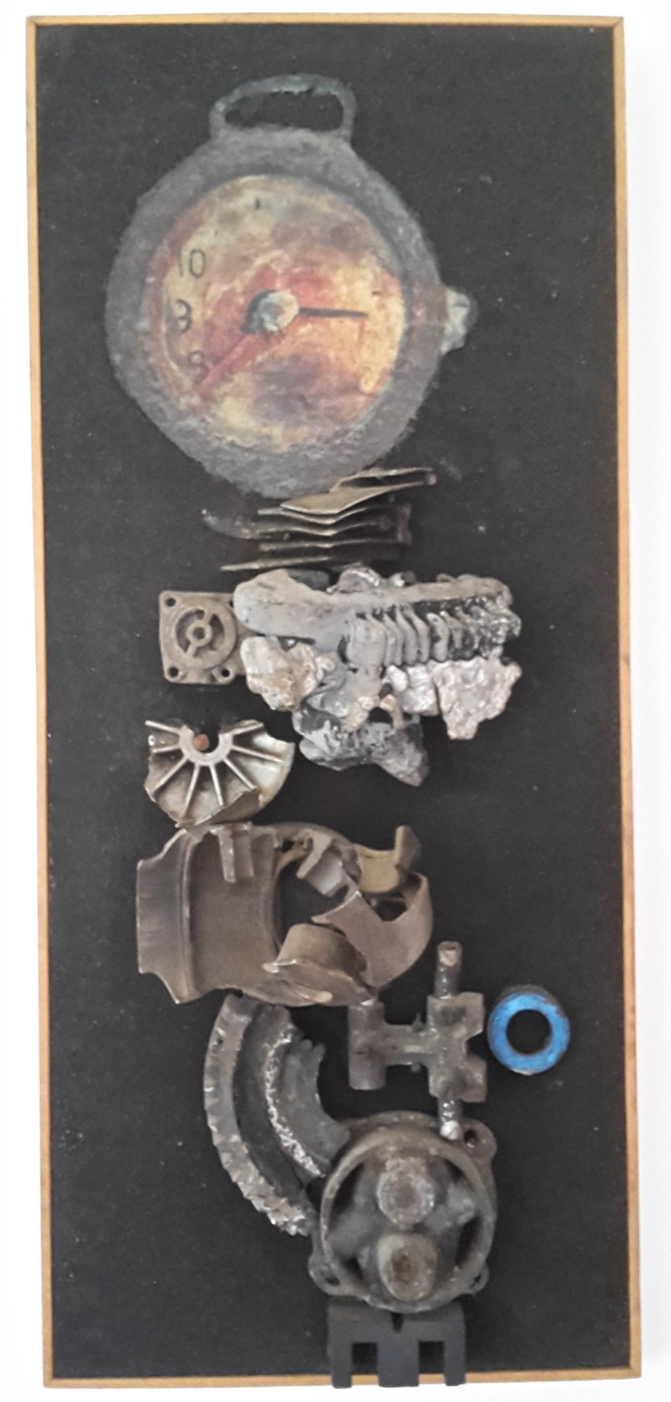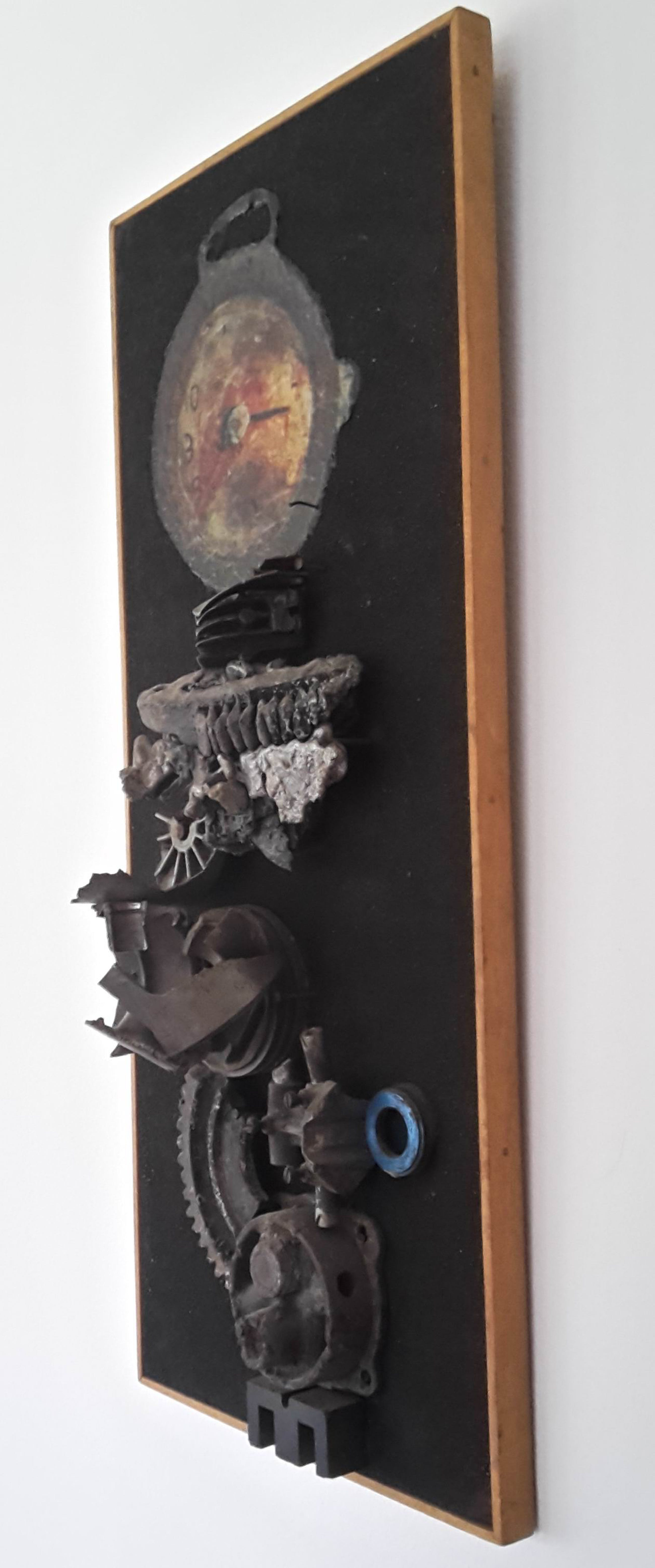 Vroeg werk van Yvonne Kracht. Reliëf op zwart geschilderd spaanplaat, gemengde techniek: verf en collage van wijzerplaat en ijzeren gevonden objecten (motor-onderdelen) in houten omlijsting;